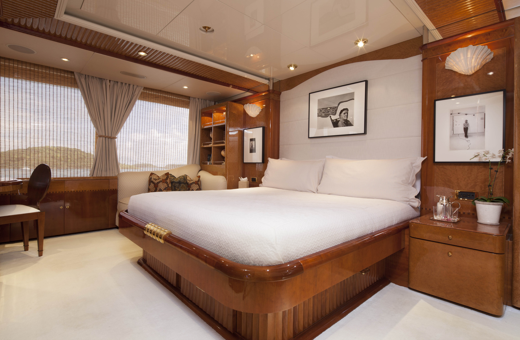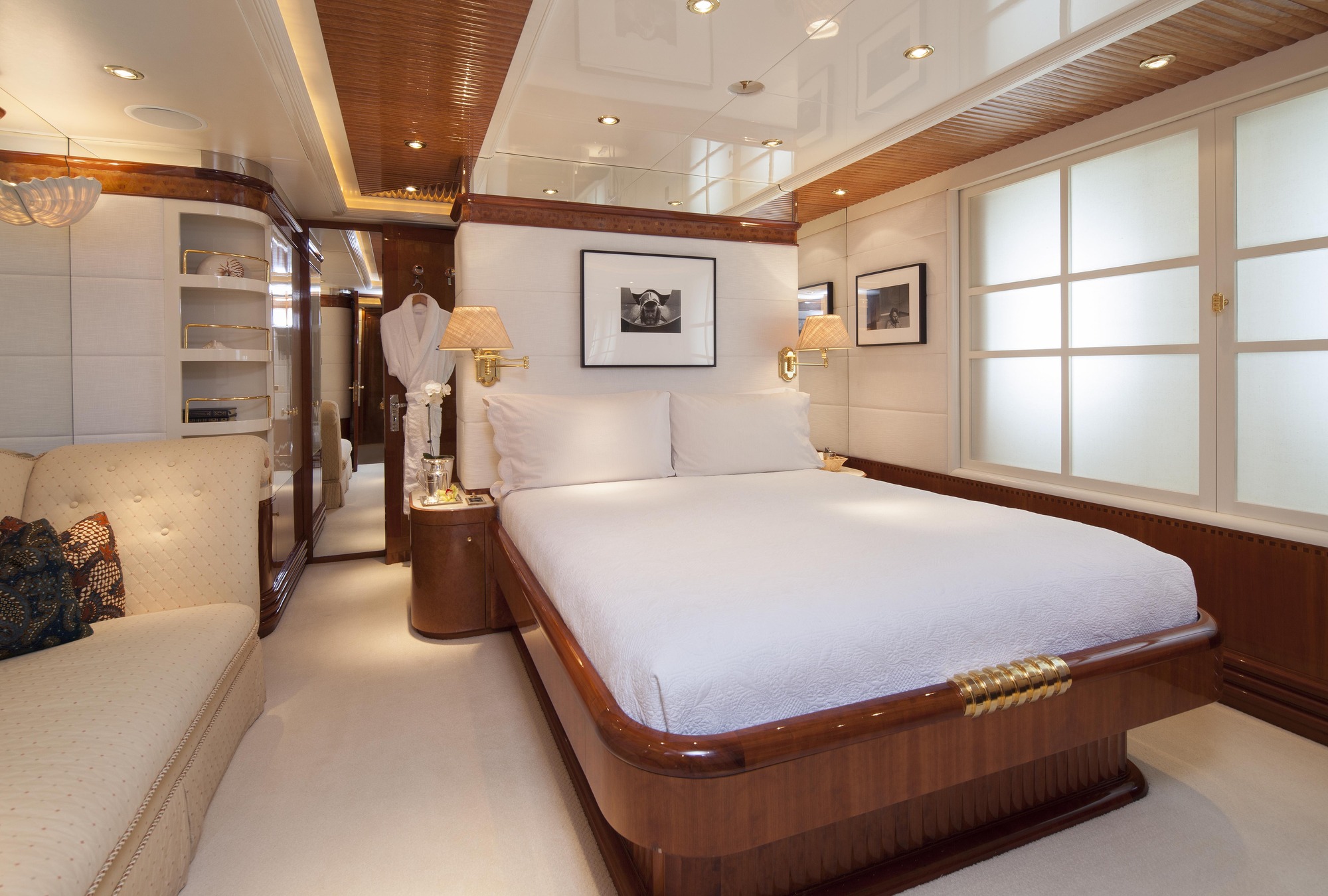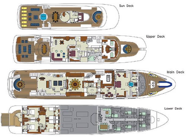 1 x King Master cabin full beam width, en-suite with Jacuzzi tub, separate shower and his & hers dressing rooms - 1 x VIP King bed cabin with en-suite - 1 x Queen bed cabin with en-suite - 1 x Queen bed cabin with en-suite - 1 x cabin with 2 Twin Beds, 1 Pullman with en-suite - 1 x cabin with 2 Twin Beds, 1 Pullman with en-suite