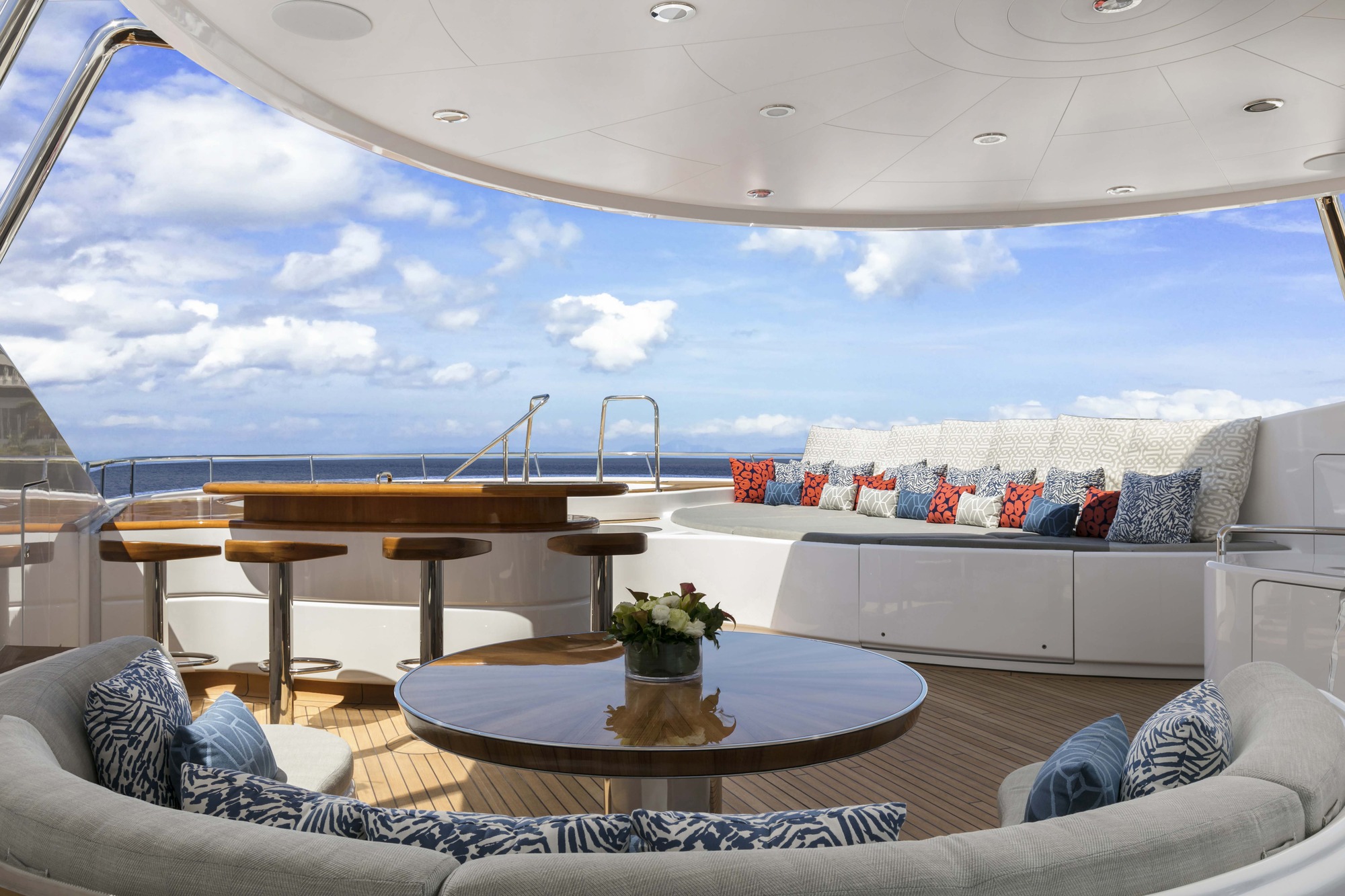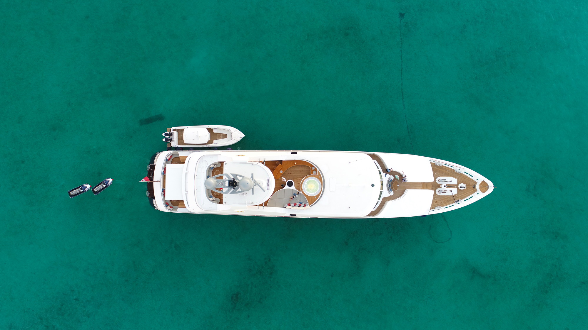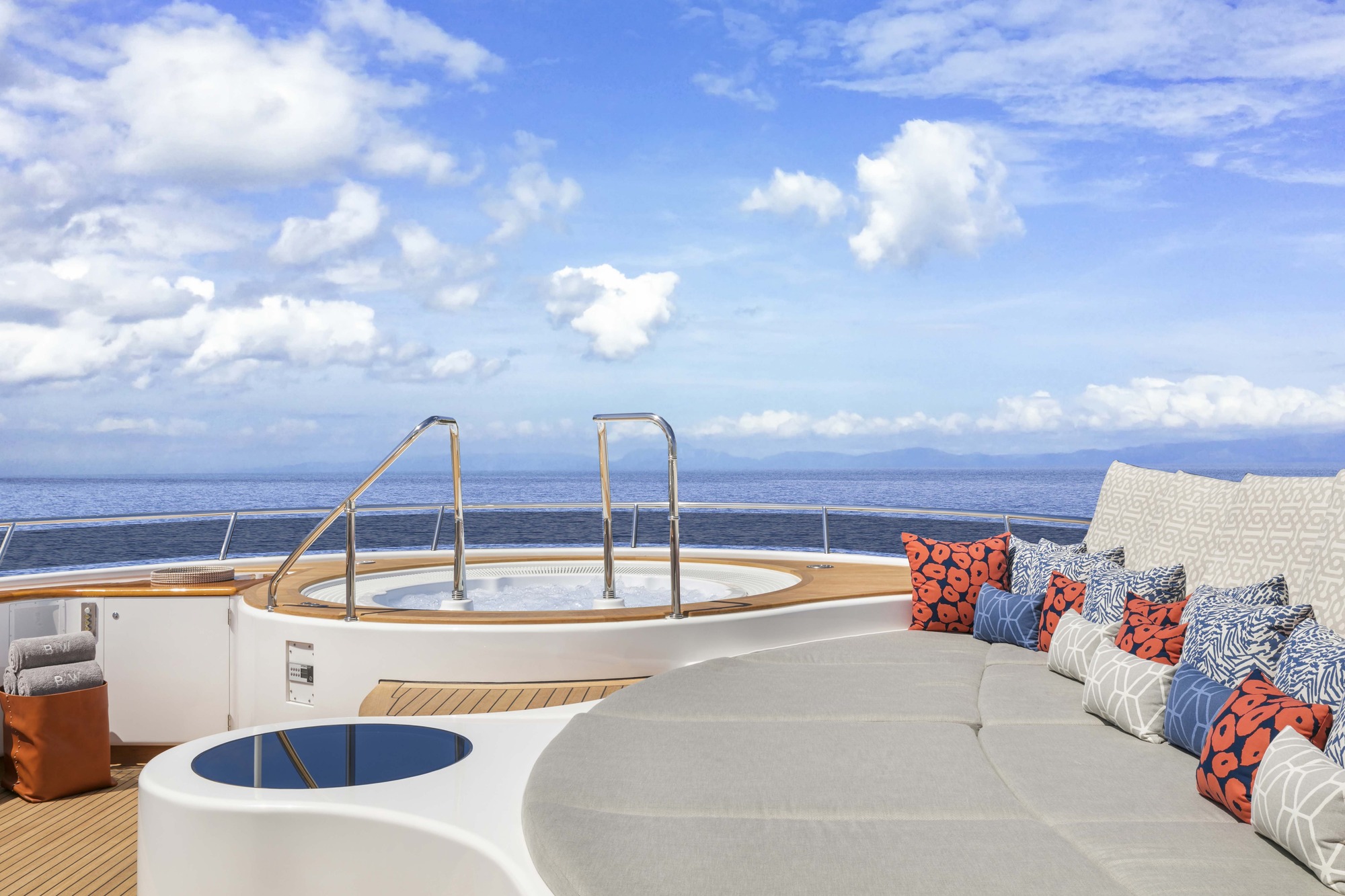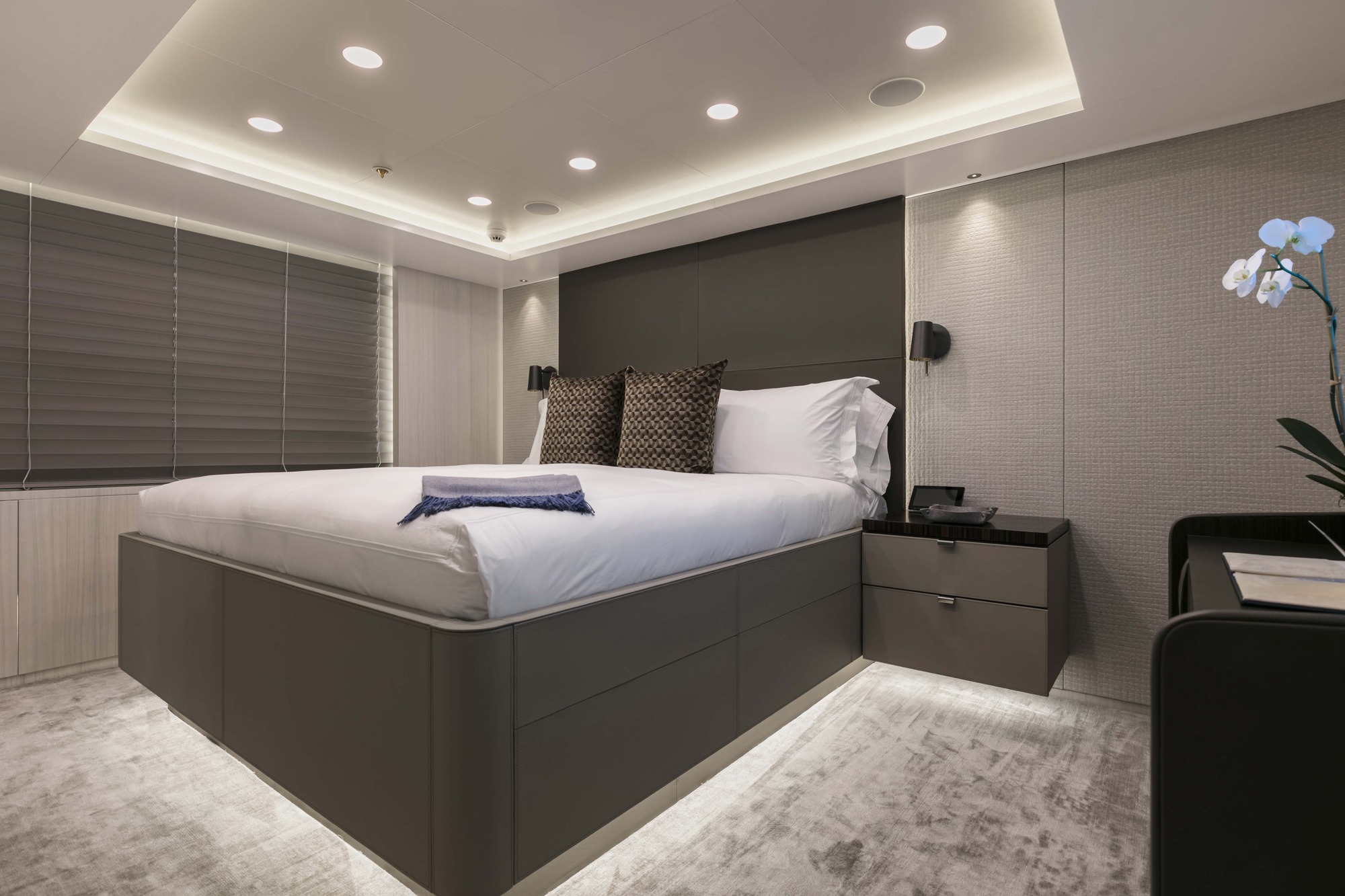 BROADWATER has had an all-encompassing refit that has just been completed in March 2017. The modifications included a completely new interior design refit by Adam Voorhees, who came onto the yachting scene as the Young Designer of the Year Award winner in 2010. Adam’s fresh look at BROADWATER, along with her experienced owner made for the perfect collaboration. Adam transformed BROADWATER's ambience into a calm, casual and inviting atmosphere. The composition throughout is kept minimal and allows for breathing room, constantly revealing design through details. BROADWATER's entirely new interior now includes a six-stateroom layout. A beautiful and spacious Master stateroom complete with office lives on the forward region of the main deck with a VIP Queen stateroom accessible on the starboard side of the main deck as well. Four lower king sized guest staterooms are in the lower guest area. Two of which convert to single beds and two of which have additional Pullman bunks. The extensive upgrades in addition to the completely new interior included all new lighting, AV, furnishings, flooring, exterior paint and much more. Entering BROADWATER from the formal entrance, on the starboard side, one will land at the formal foyer. Within the foyer, one will find a stunning spiral stairway that leads up to the bridge deck or down to the lower guest accommodations. The entire facade of the spiral stairs has an impressive metal finish manufactured by Neal Feay and inspired by the Japanese practice, omikuji (Japanese fortune-telling paper strips that can be found at shrines and temples), creating multiple layers of reflection, transparency and gradient coloring. From the foyer area one can go aft to the formal dining and main salon or forward to the on-deck master and VIP staterooms. Moving aft to the main salon dining area one would find an open, light and airy area with a custom dining table for twelve and a 275 bottle glass front display wine cooler. The flooring is chevron pattern rift sawn oak, softened by sumptuous area rugs. Further aft in the main salon one will find a modified L-shaped sofa, coffee table and two custom swivel chairs with end table between, along with an additional low credenza and accent chairs. One can walk out to the aft deck from the aft salon doors. These doors are also used often as the preferred way into the vessel. Going up the stairs from the formal main deck foyer one will find the upper bridge deck foyer. One can go forward to the pilothouse passing a well-appointed day head on the way. The pilothouse is roomy with settee, large navigation console with state of the art electronics with many upgrades. Captain’s office and Captain’s cabin is found in this area. Going aft one will find the mature yet playful setting of the skylounge, which embraces a circular layout. There is a semi-circular sofa, designed by Vladimir Kagan, a Finn Juhl coffee table and chairs as well as a stand-alone table with four Hans Wegner chairs, perfect for coffee, tea, board games or a private meeting. Aft through the skylounge deck doors is a spacious area with a large outside dining table, built in settees on either side with additional loose chairs and two large side serving areas. One can go to the sundeck from an external stairway found on the starboard side deck. Up the stairs to the sun deck one reaches a large area with built-in settee, loose furniture and table aft. To port is a circular settee with table. Further forward to port is a complete wet bar with four bar stools and in the middle of the sun deck forward is a large Jacuzzi with ample sun pad area. One can make their way down the stairs one deck to the bridge. Forward on the bridge deck on the starboard side is a gym area with all the amenities. On the opposite side, one will find a tender area. Forward from this area either side leads to a beautiful bow sitting area just forward of the pilothouse. The main aft deck is host to a wet bar with four bar stools and settee with table and chairs, perfect for sitting, dining or watching the water sports below you. Descend the aft wide spiral staircase to reach the swim platform complete with shower for easy access to enjoy all the water toys. Just off the swim platform one will find the perfect water sport staging area in the beach club arrangement offered in the lazarette. BROADWATER’s size and volume is found in her tri-deck configuration, six-stateroom, 690 GRT build. She offers a superb design in which to utilize all the spaces aboard. Her stunning blue hull gives her a sophistication not easily found on the water today.