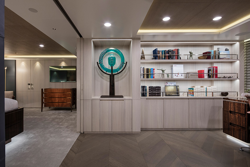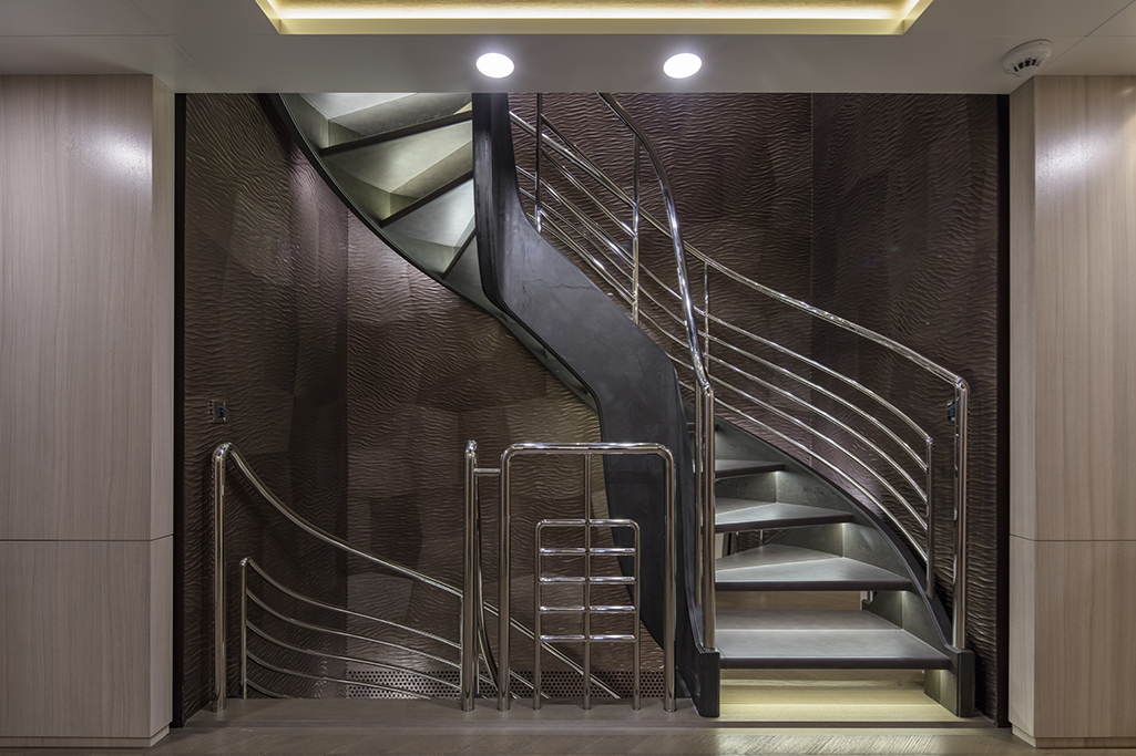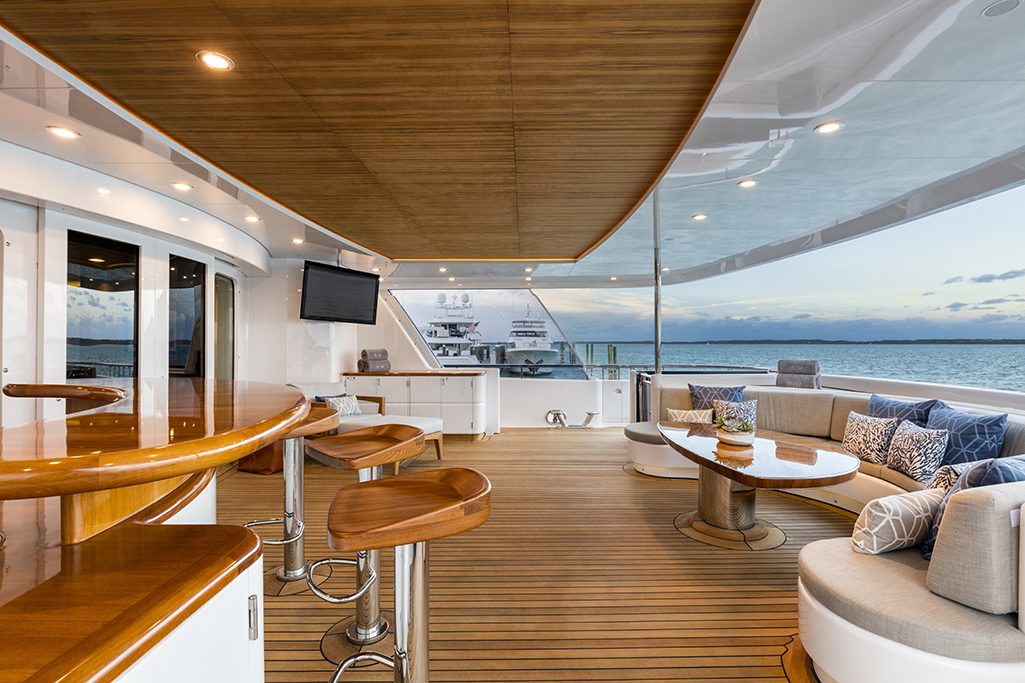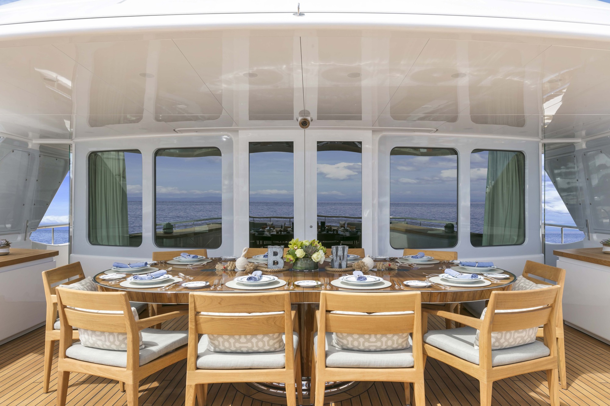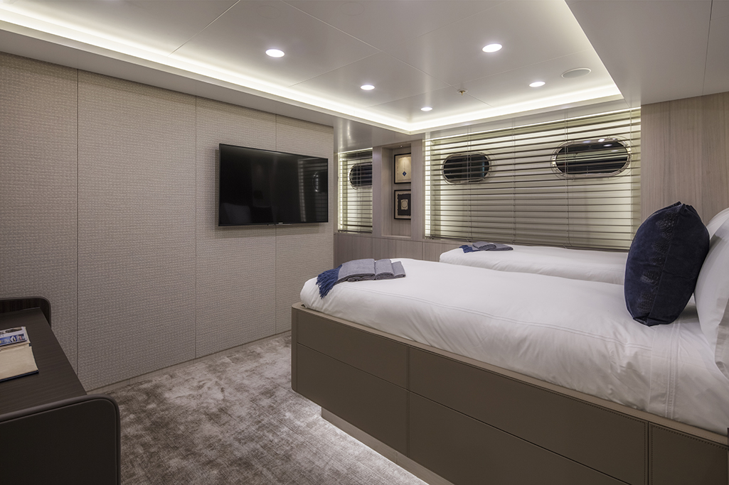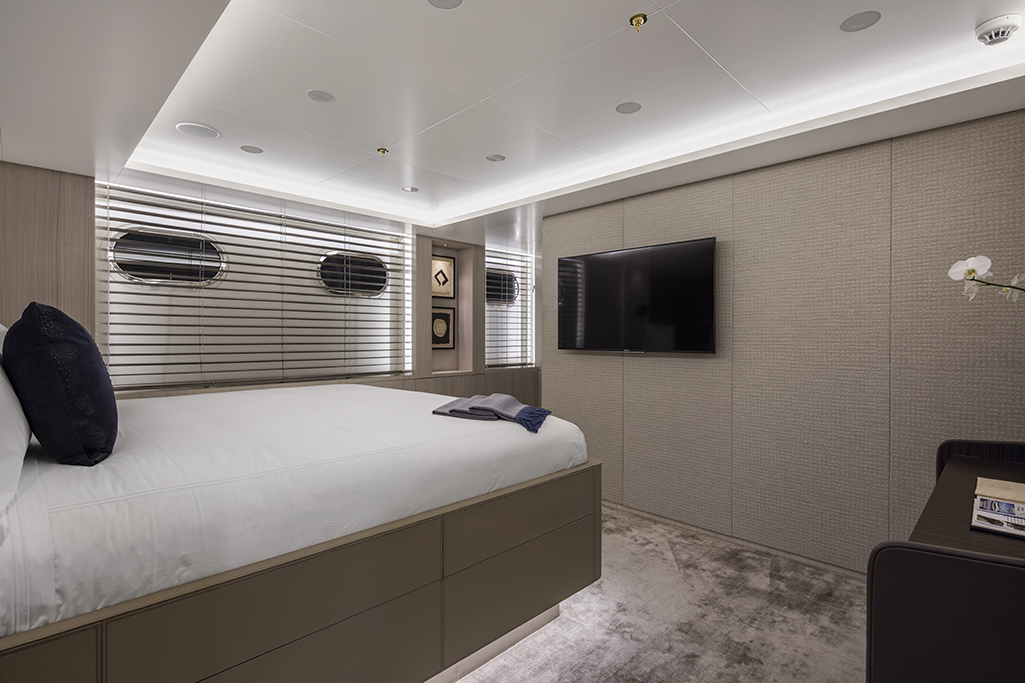 BROADWATER has had an all-encompassing refit that has just been completed in March 2017. The modifications included a completely new interior design refit by Adam Voorhees, who came onto the yachting scene as the Young Designer of the Year Award winner in 2010. Adam’s fresh look at BROADWATER, along with her experienced owner made for the perfect collaboration. Adam transformed BROADWATER's ambience into a calm, casual and inviting atmosphere. The composition throughout is kept minimal and allows for breathing room, constantly revealing design through details. BROADWATER's entirely new interior now includes a six-stateroom layout. A beautiful and spacious Master stateroom complete with office lives on the forward region of the main deck with a VIP Queen stateroom accessible on the starboard side of the main deck as well. Four lower king sized guest staterooms are in the lower guest area. Two of which convert to single beds and two of which have additional Pullman bunks. The extensive upgrades in addition to the completely new interior included all new lighting, AV, furnishings, flooring, exterior paint and much more. Entering BROADWATER from the formal entrance, on the starboard side, one will land at the formal foyer. Within the foyer, one will find a stunning spiral stairway that leads up to the bridge deck or down to the lower guest accommodations. The entire facade of the spiral stairs has an impressive metal finish manufactured by Neal Feay and inspired by the Japanese practice, omikuji (Japanese fortune-telling paper strips that can be found at shrines and temples), creating multiple layers of reflection, transparency and gradient coloring. From the foyer area one can go aft to the formal dining and main salon or forward to the on-deck master and VIP staterooms. Moving aft to the main salon dining area one would find an open, light and airy area with a custom dining table for twelve and a 275 bottle glass front display wine cooler. The flooring is chevron pattern rift sawn oak, softened by sumptuous area rugs. Further aft in the main salon one will find a modified L-shaped sofa, coffee table and two custom swivel chairs with end table between, along with an additional low credenza and accent chairs. One can walk out to the aft deck from the aft salon doors. These doors are also used often as the preferred way into the vessel. Going up the stairs from the formal main deck foyer one will find the upper bridge deck foyer. One can go forward to the pilothouse passing a well-appointed day head on the way. The pilothouse is roomy with settee, large navigation console with state of the art electronics with many upgrades. Captain’s office and Captain’s cabin is found in this area. Going aft one will find the mature yet playful setting of the skylounge, which embraces a circular layout. There is a semi-circular sofa, designed by Vladimir Kagan, a Finn Juhl coffee table and chairs as well as a stand-alone table with four Hans Wegner chairs, perfect for coffee, tea, board games or a private meeting. Aft through the skylounge deck doors is a spacious area with a large outside dining table, built in settees on either side with additional loose chairs and two large side serving areas. One can go to the sundeck from an external stairway found on the starboard side deck. Up the stairs to the sun deck one reaches a large area with built-in settee, loose furniture and table aft. To port is a circular settee with table. Further forward to port is a complete wet bar with four bar stools and in the middle of the sun deck forward is a large Jacuzzi with ample sun pad area. One can make their way down the stairs one deck to the bridge. Forward on the bridge deck on the starboard side is a gym area with all the amenities. On the opposite side, one will find a tender area. Forward from this area either side leads to a beautiful bow sitting area just forward of the pilothouse. The main aft deck is host to a wet bar with four bar stools and settee with table and chairs, perfect for sitting, dining or watching the water sports below you. Descend the aft wide spiral staircase to reach the swim platform complete with shower for easy access to enjoy all the water toys. Just off the swim platform one will find the perfect water sport staging area in the beach club arrangement offered in the lazarette. BROADWATER’s size and volume is found in her tri-deck configuration, six-stateroom, 690 GRT build. She offers a superb design in which to utilize all the spaces aboard. Her stunning blue hull gives her a sophistication not easily found on the water today.