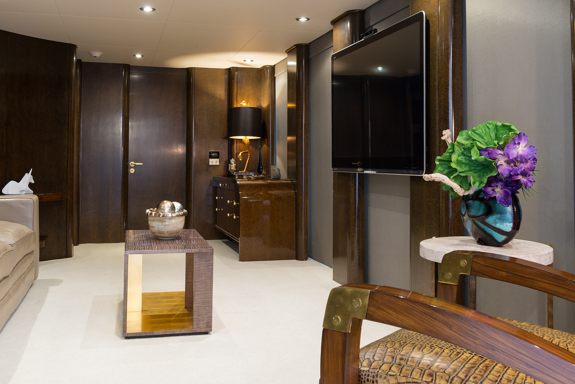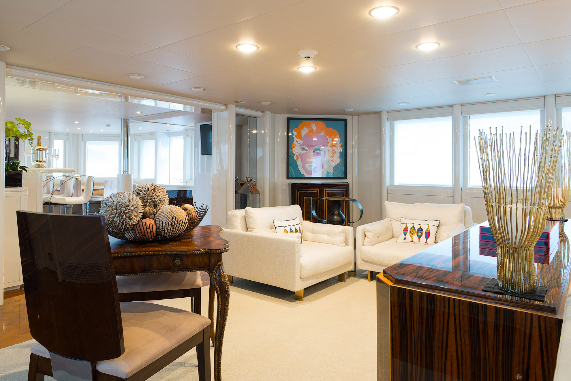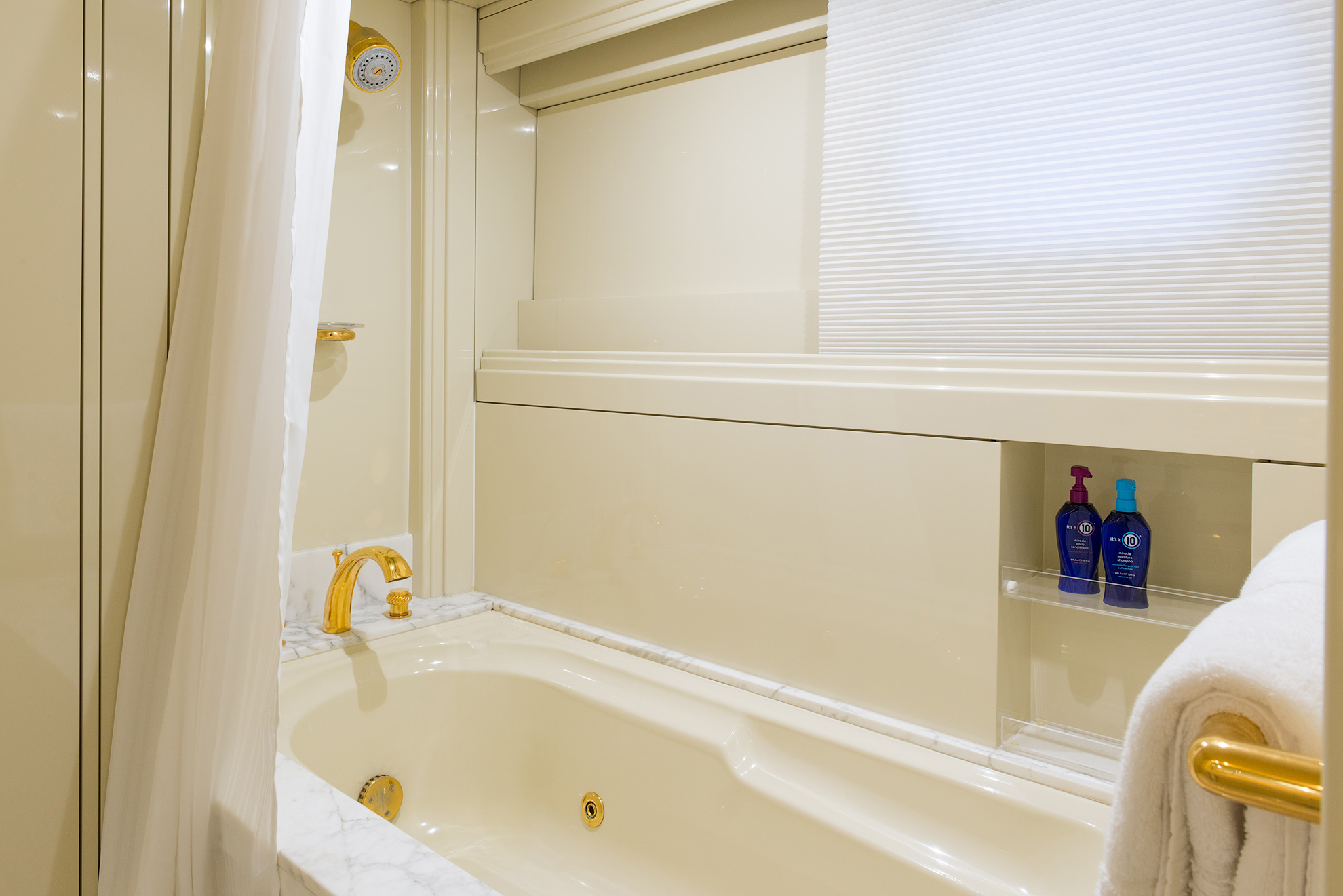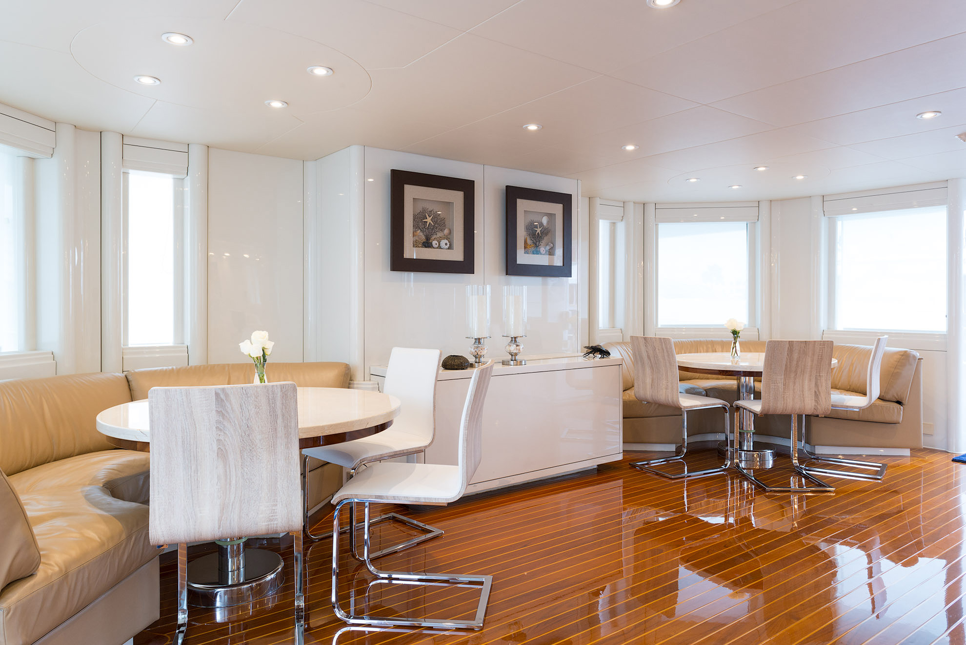 SHE'S A 10 was recently refit in 2013. The layout sleeps up to 12 guests in 5 staterooms, including a master suite on the upper deck, 2 king staterooms and 2 double cabins with additional single beds below. The multifaceted media room on the main deck also transforms into an extra guest accommodation if needed. Timeless styling, beautiful furnishings and sumptuous seating are featured throughout her living areas to create an elegant and comfortable atmosphere.