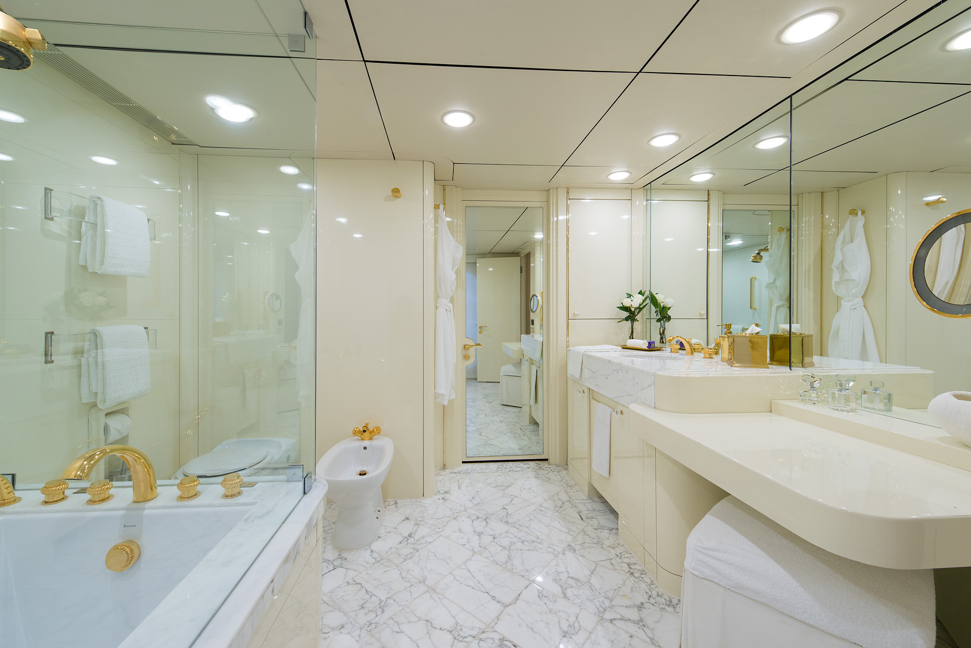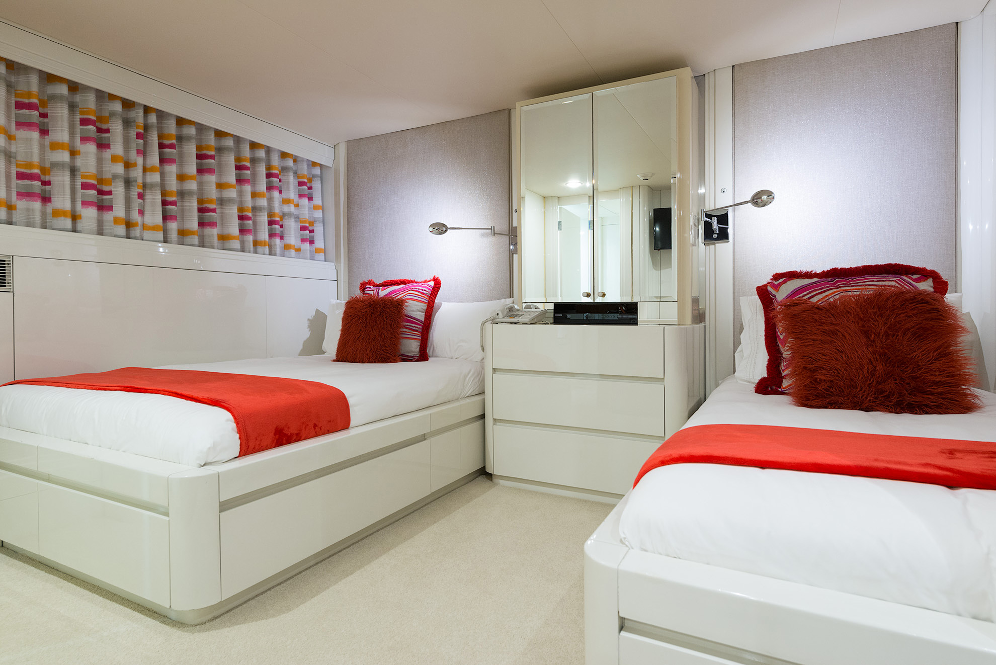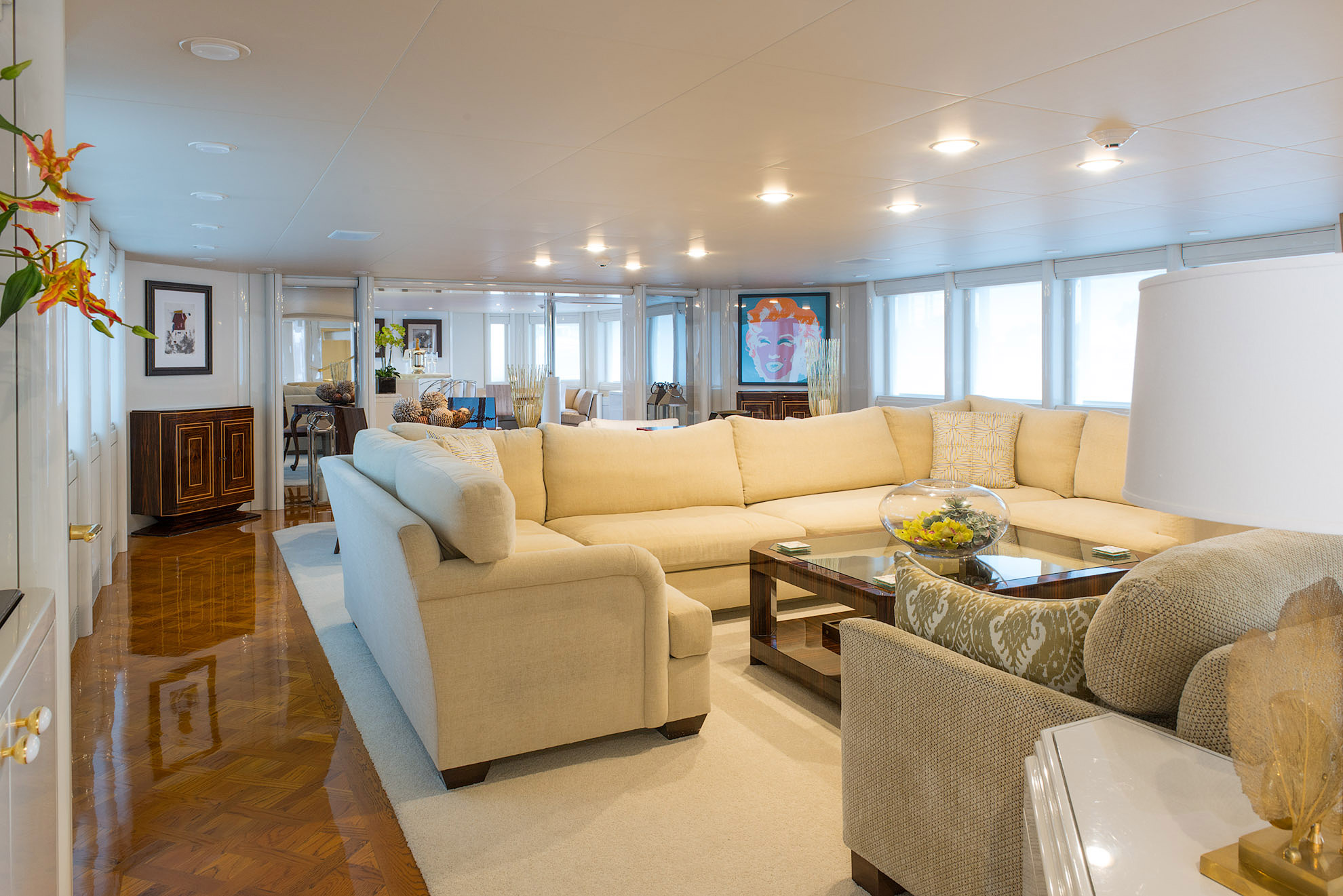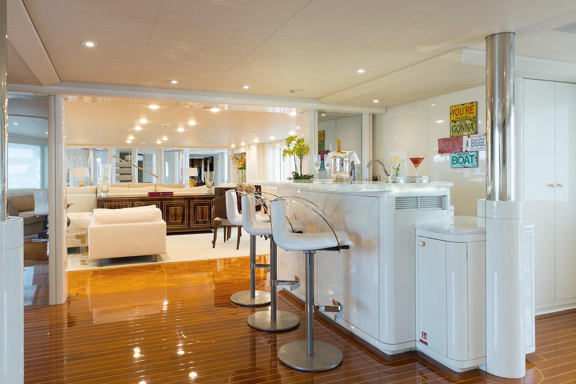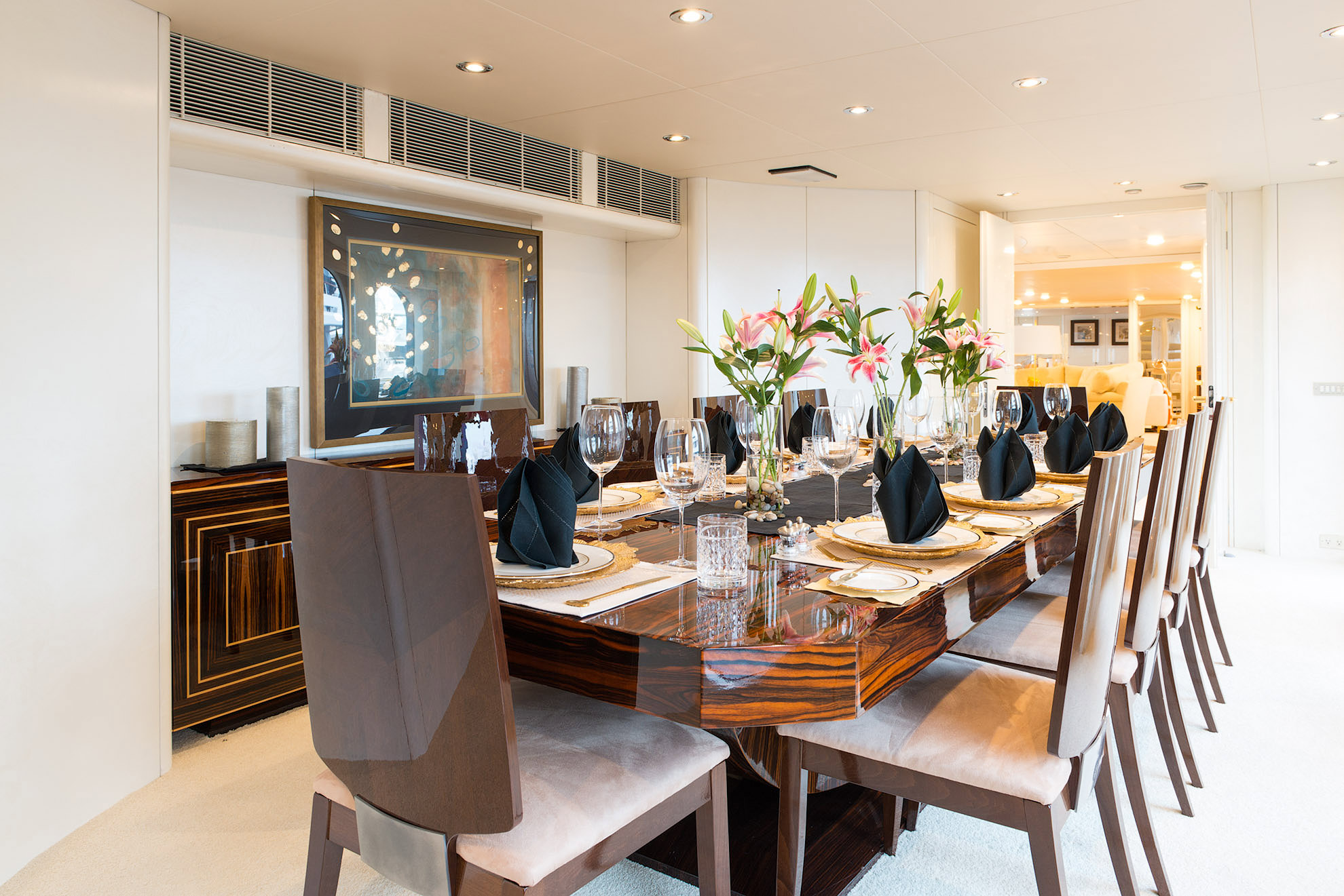 SHE'S A 10 was recently refit in 2013. The layout sleeps up to 12 guests in 5 staterooms, including a master suite on the upper deck, 2 king staterooms and 2 double cabins with additional single beds below. The multifaceted media room on the main deck also transforms into an extra guest accommodation if needed. Timeless styling, beautiful furnishings and sumptuous seating are featured throughout her living areas to create an elegant and comfortable atmosphere.