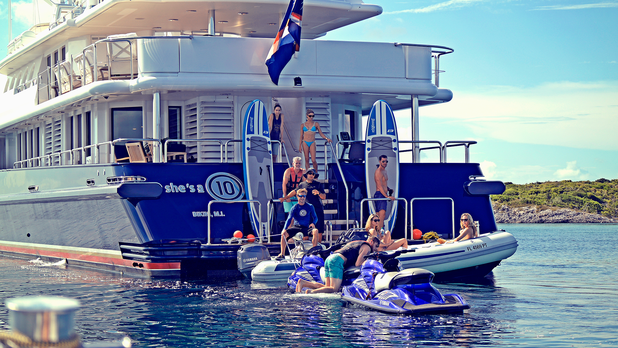 Tenders & Toys: 2 x Yamaha GP 1300 waverunners 2 x 19 ft Nouvarania tenders with twin 60 hp Yamaha outboard engines with Bimini tops 2 x Jimmy Styks Paddleboards 1 x inflatable banana boat 1 x inflatable towing couch 15 x sets of snorkeling gear 1 x wakeboard 1 x waterskis