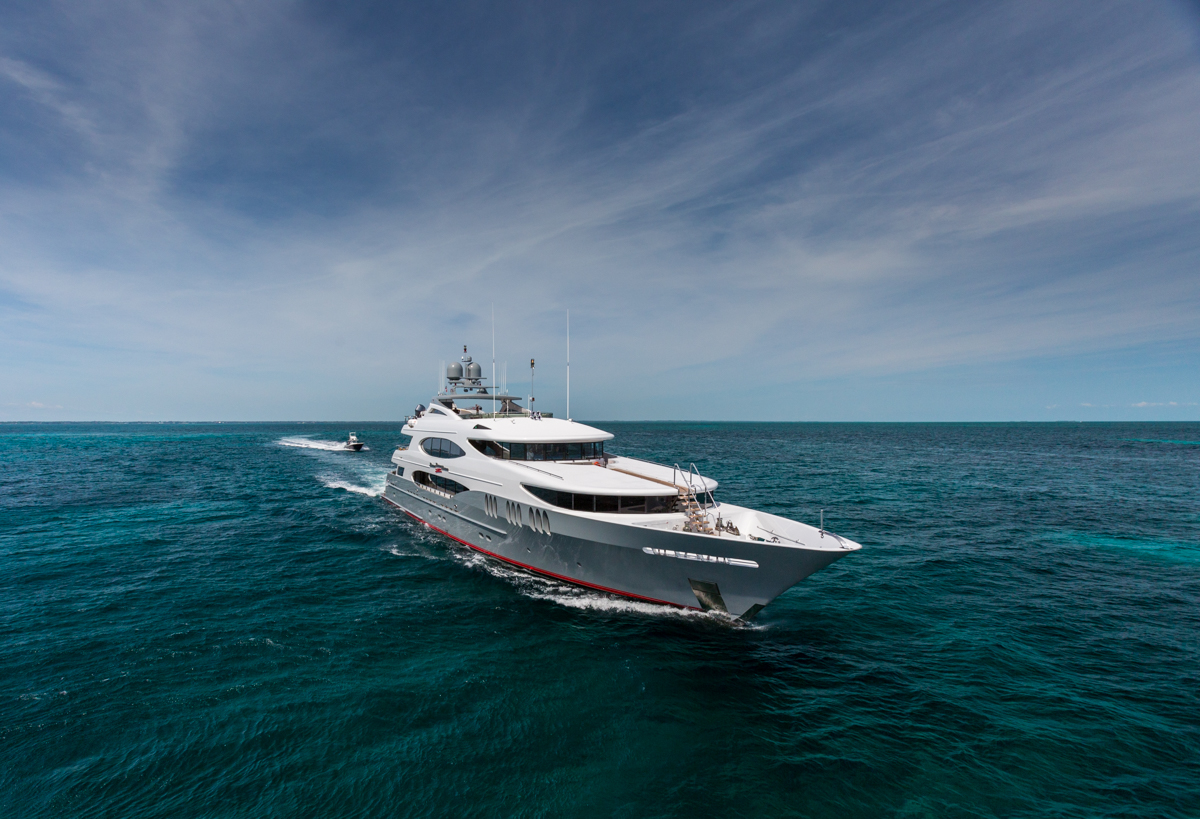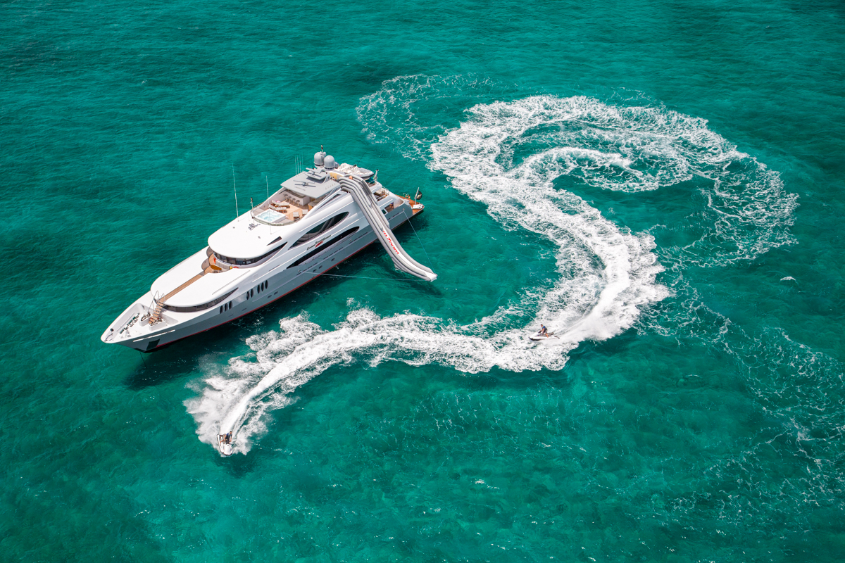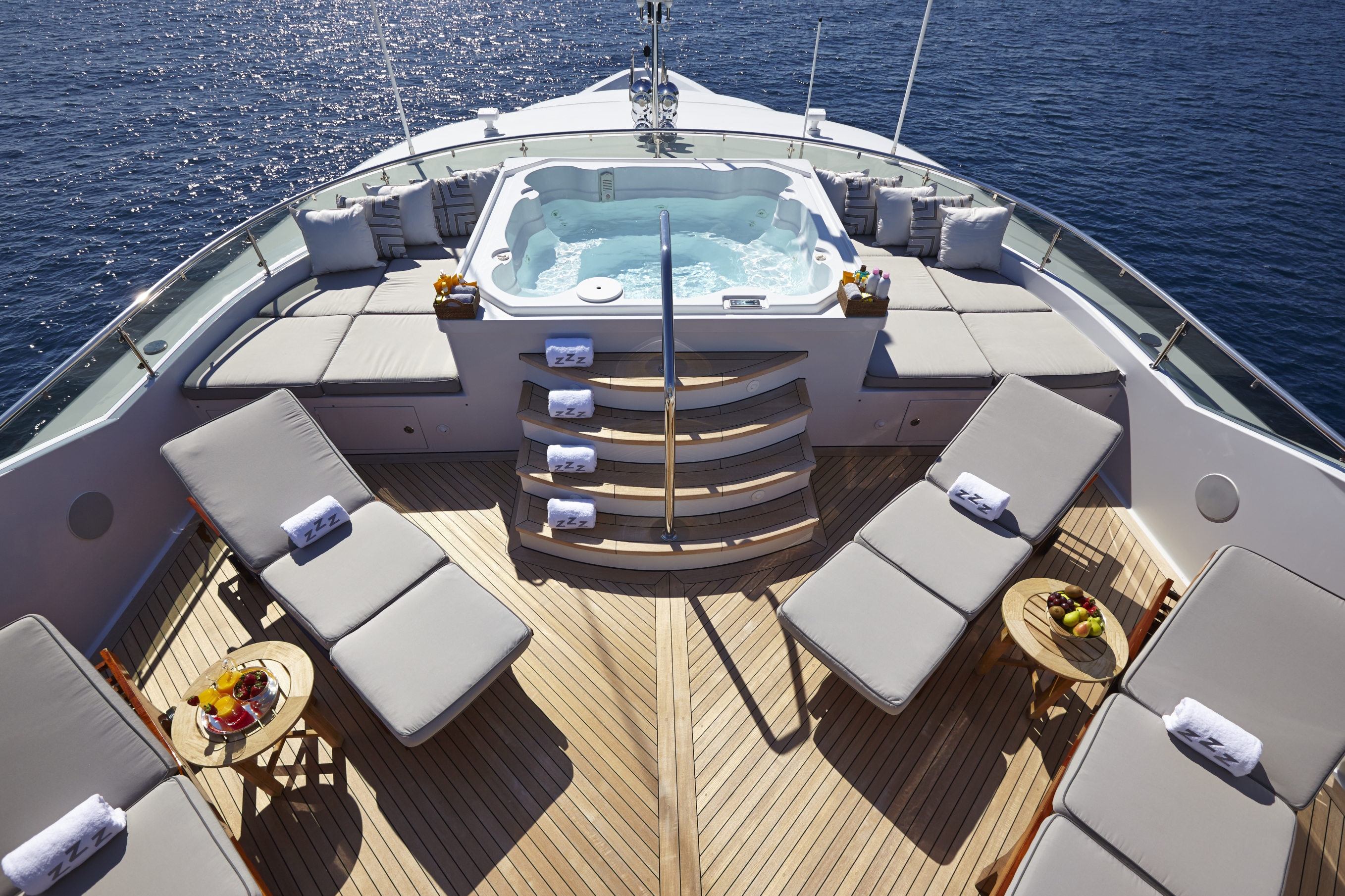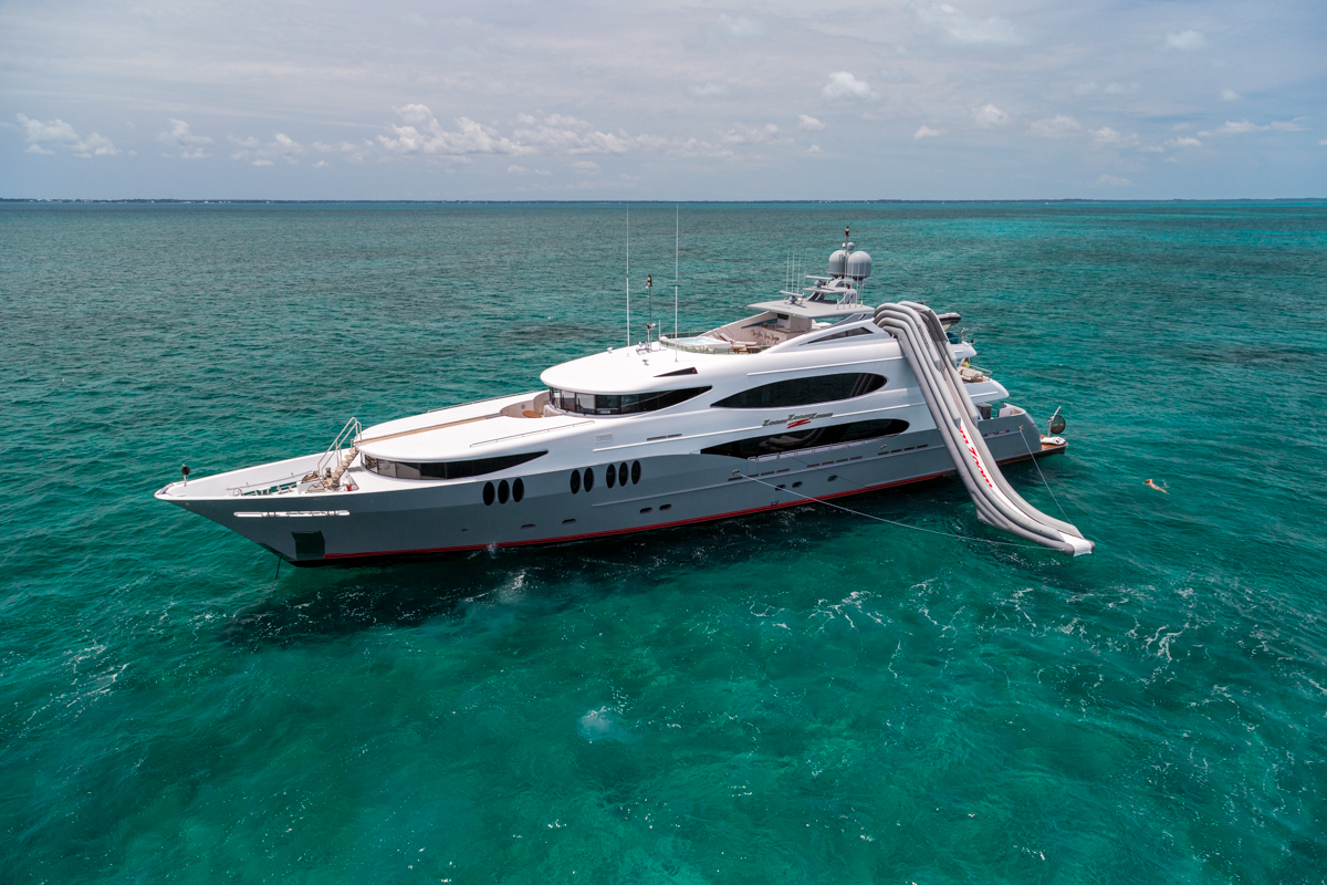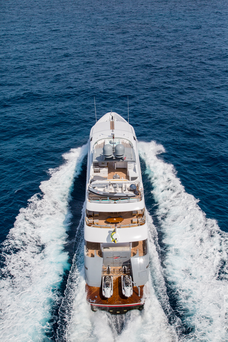ZOOM ZOOM ZOOM is an excellent combination of speed, style, and versatility.The 50-meter Trinity is a quick and chic super yacht and reputed as one of the fastest U.S. builds of her pedigree. Thanks to her shallow draft, ZOOM ZOOM ZOOM is able to cruise anywhere in the world. She runs at an exceptionally fast 23 knots and cruises at 14. ZOOM ZOOM ZOOM offers exceptional interior styling by Evan K. Marshall. The atmosphere on board is sophisticated and elegant. She features an array of dining options, both indoor and alfresco. Her full-beam sky lounge is an impressive space for entertaining and the sundeck is the perfect place to relax and enjoy the views. ZOOM ZOOM ZOOM able to accommodate up to 10 guests in five stylish staterooms. She features a split-level master with forward, with impressive forward-facing windows that add to her beautiful exterior profile. MAIN DECK Main Salon - Spacious seating area with large windows allowing a view from any vantage point. Combined bar and dining salon area that seats 10 opens to the main salon. Main Aft Deck - 18 feet in length with a large seating area, and large alfresco dining area that seats 10. Swim Platform - 14 feet in length offering a "beach-club" platform for watersports, dining, and two giant sun umbrellas. BRIDGE DECK From the distinctive ‘beach club’ platform; the main deck outdoor cocktail bar; the air-conditioned Sky Lounge alfresco dining room; to the tempting flybridge sundeck, there is an abundance of outside space. Sky Lounge - large seating area perfect for entertaining with bar, game table and entertainment center. Large windows allow lots of light. Upper Aft Deck - Alfresco dining for 10 with a generous 27 feet in length of deck space and exterior TV. Foyer - at the top of the central staircase from the main deck, there is a marbled foyer with a day head. SUNDECK Spacious sundeck with large Jacuzzi located forward surrounded by sunpads. Deck space surrounding Jacuzzi has room for chaise lounges or space for entertaining. Day head. Bar with icemaker, refrigerator and sink with seating for 4 and located beneath the hard top for shading and also exterior TV. Opposite the bar is a BBQ.