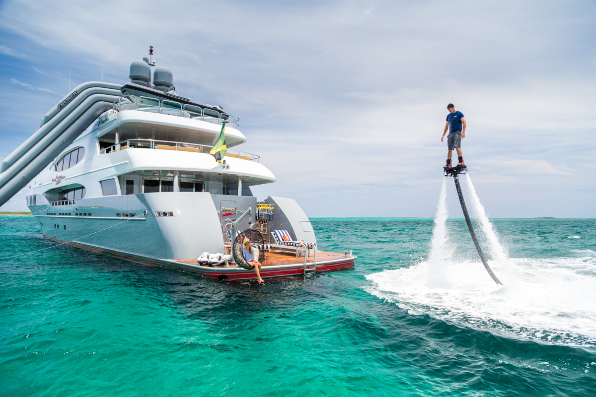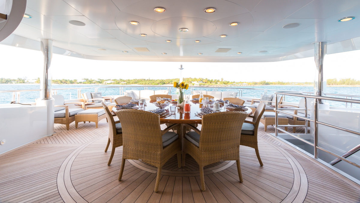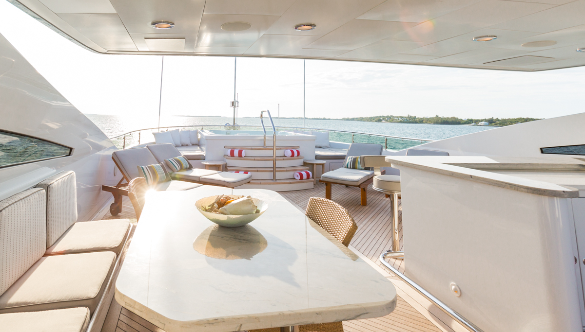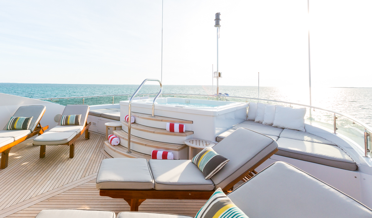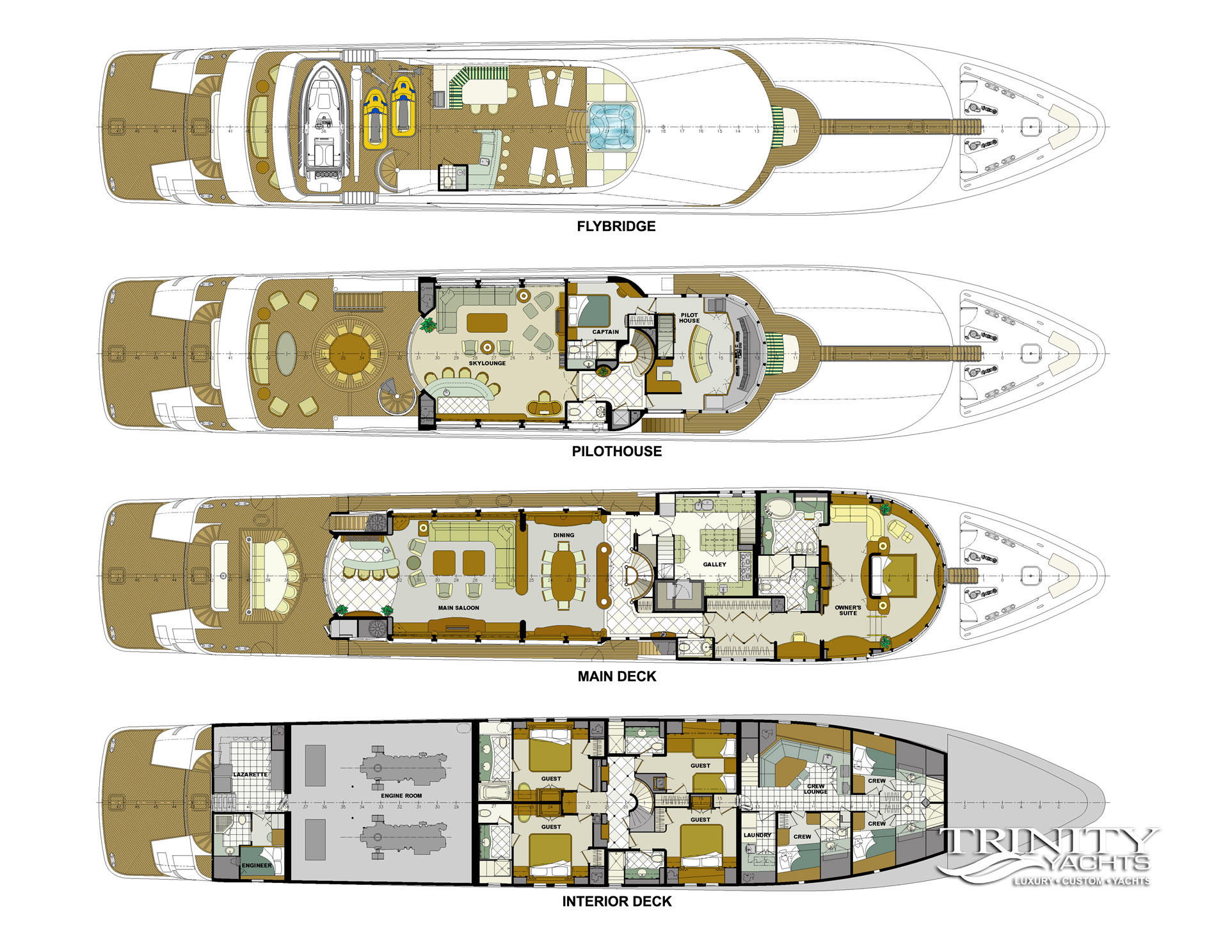 ZOOM ZOOM ZOOM is an excellent combination of speed, style, and versatility.The 50-meter Trinity is a quick and chic super yacht and reputed as one of the fastest U.S. builds of her pedigree. Thanks to her shallow draft, ZOOM ZOOM ZOOM is able to cruise anywhere in the world. She runs at an exceptionally fast 23 knots and cruises at 14. ZOOM ZOOM ZOOM offers exceptional interior styling by Evan K. Marshall. The atmosphere on board is sophisticated and elegant. She features an array of dining options, both indoor and alfresco. Her full-beam sky lounge is an impressive space for entertaining and the sundeck is the perfect place to relax and enjoy the views. ZOOM ZOOM ZOOM able to accommodate up to 10 guests in five stylish staterooms. She features a split-level master with forward, with impressive forward-facing windows that add to her beautiful exterior profile. MAIN DECK Main Salon - Spacious seating area with large windows allowing a view from any vantage point. Combined bar and dining salon area that seats 10 opens to the main salon. Main Aft Deck - 18 feet in length with a large seating area, and large alfresco dining area that seats 10. Swim Platform - 14 feet in length offering a "beach-club" platform for watersports, dining, and two giant sun umbrellas. BRIDGE DECK From the distinctive ‘beach club’ platform; the main deck outdoor cocktail bar; the air-conditioned Sky Lounge alfresco dining room; to the tempting flybridge sundeck, there is an abundance of outside space. Sky Lounge - large seating area perfect for entertaining with bar, game table and entertainment center. Large windows allow lots of light. Upper Aft Deck - Alfresco dining for 10 with a generous 27 feet in length of deck space and exterior TV. Foyer - at the top of the central staircase from the main deck, there is a marbled foyer with a day head. SUNDECK Spacious sundeck with large Jacuzzi located forward surrounded by sunpads. Deck space surrounding Jacuzzi has room for chaise lounges or space for entertaining. Day head. Bar with icemaker, refrigerator and sink with seating for 4 and located beneath the hard top for shading and also exterior TV. Opposite the bar is a BBQ.