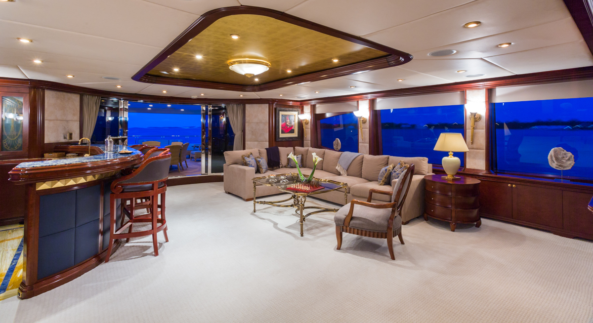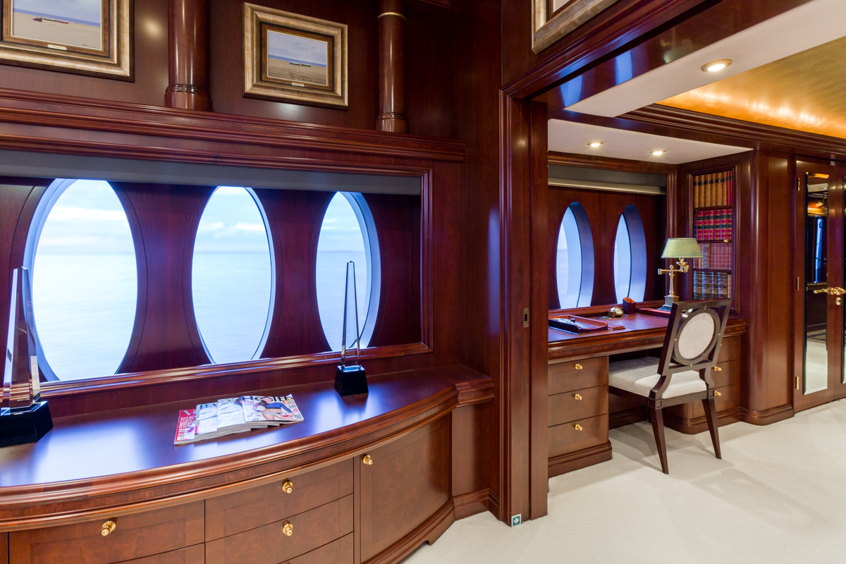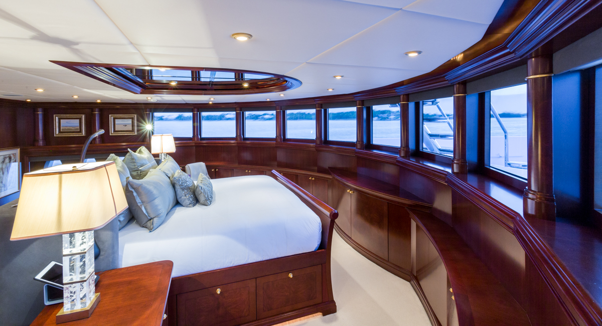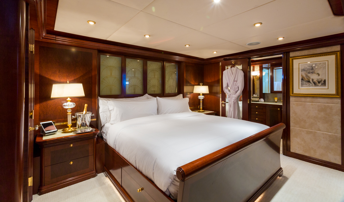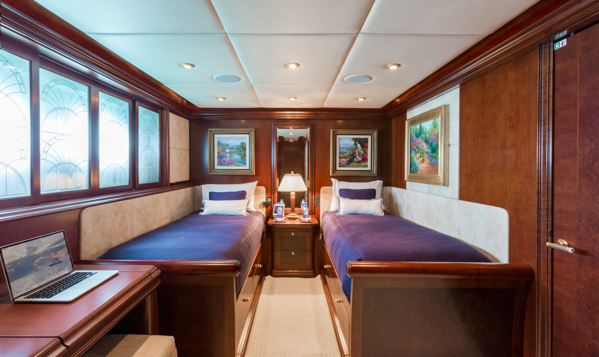 Master Suite - Full beam, split level King bed master stateroom with private study is located on the main deck. Forward facing vertical windows allow panoramic views and the lower level has more than 9 feet (2.7m) of headroom. There is a comfortable seating area near the his and hers bathrooms that feature a marble Jacuzzi tub for her, equipped with gold and glass Lalique taps, and a large marble shower/steam bath shared with him. Large cedar walk-in closets. Owner's office with starboard views. Two 42" retractable plasma TV's - one is in the seating area and swings out from a cherry wood wall unit to allow for angled viewing from the portside settee. The master stateroom is equipped with Crestron Wi-Fi touch screen controls that adjusts the window shades, lighting, entertainment and air conditioning at the touch of a finger. BELOW DECK All 4 guest cabins are located below deck, two VIP cabins with king beds, one queen bed cabin and one twin bed suite. VIP King - Fully ensuite, marble bathroom with centerline facing King bed. Bathtub/shower. Vanity desk. Crestron Wi-Fi touch controls to adjust lighting, audio/visual, and air conditioning. VIP King - Fully ensuite marble bathroom with centerline facing King bed. Shower. Vanity desk. Crestron Wi-Fi touch controls to adjust lighting, audio/visual, and air conditioning. Queen Stateroom - Fully ensuite marble bathroom with shower. Centerline facing Queen bed and vanity desk. Crestron Wi-Fi touch controls to adjust lighting, audio/visual, and air conditioning. Twin Stateroom - Fully ensuite marble bathroom with shower. Two twin size beds and vanity desk. Crestron Wi-Fi touch controls to adjust lighting, audio/visual, and air conditioning. *the forward starboard cabin has a private entry for crew which allows crew to service the guests areas without going through the main salon.