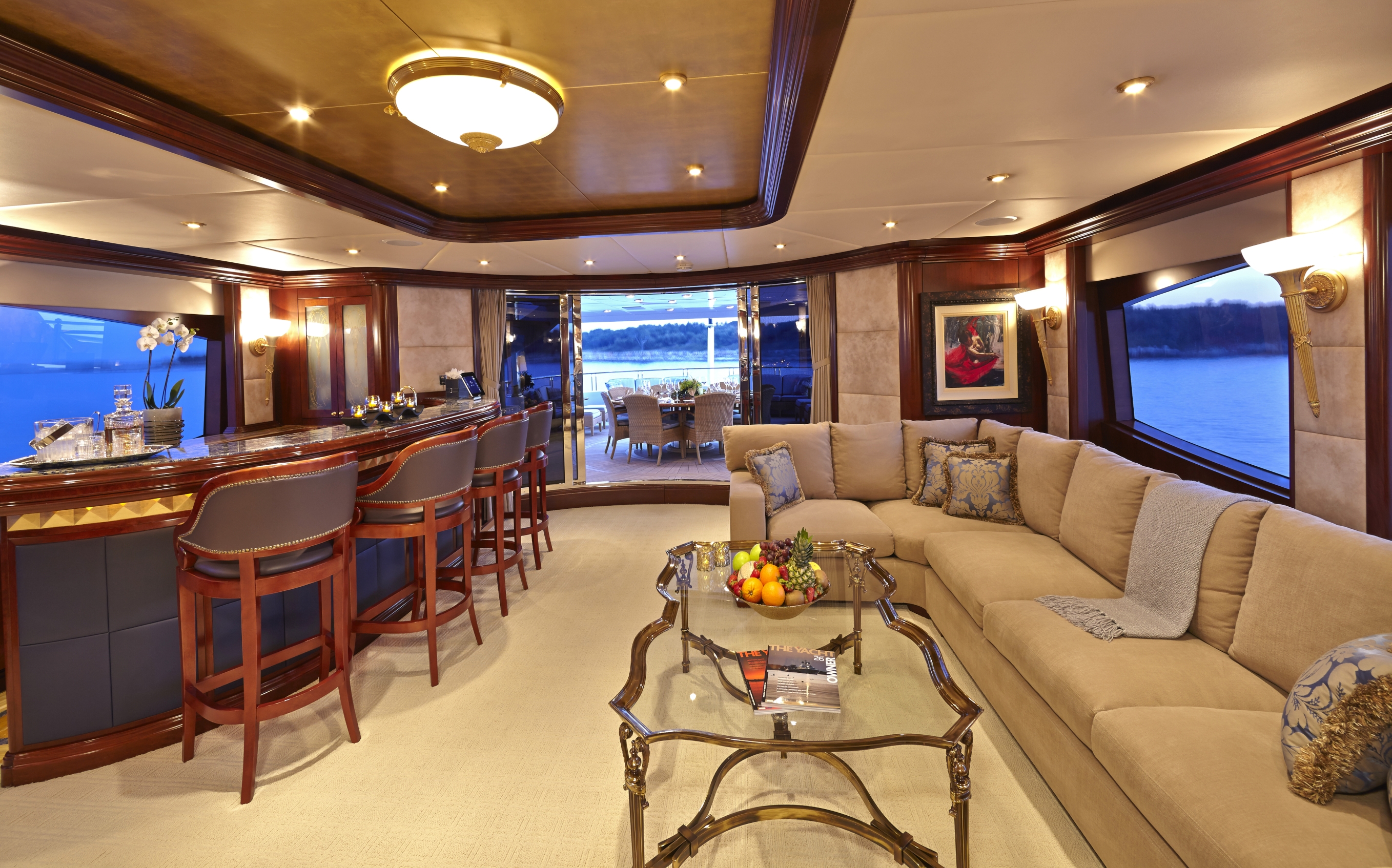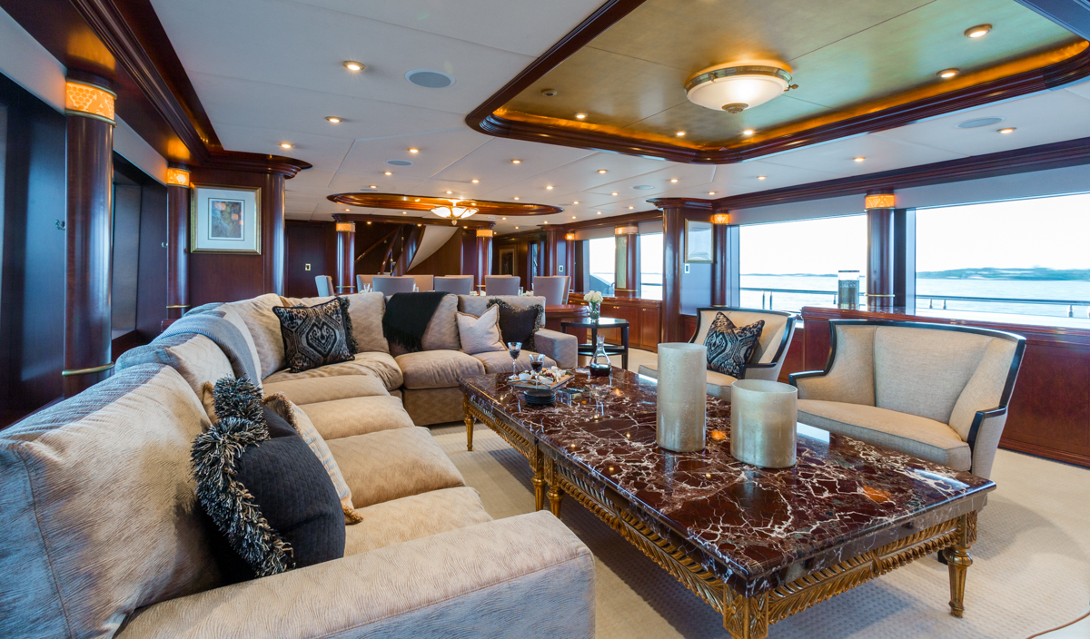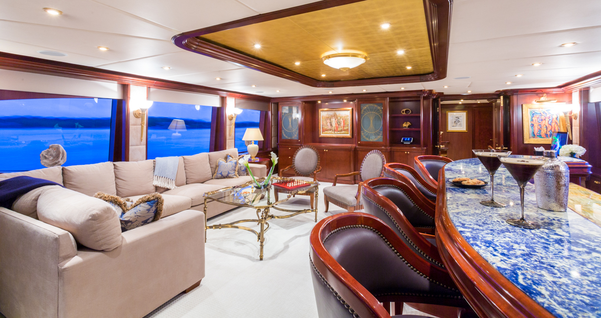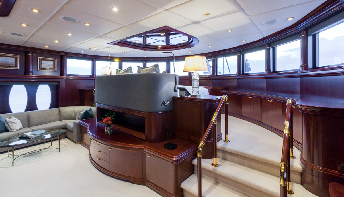 Master Suite - Full beam, split level King bed master stateroom with private study is located on the main deck. Forward facing vertical windows allow panoramic views and the lower level has more than 9 feet (2.7m) of headroom. There is a comfortable seating area near the his and hers bathrooms that feature a marble Jacuzzi tub for her, equipped with gold and glass Lalique taps, and a large marble shower/steam bath shared with him. Large cedar walk-in closets. Owner's office with starboard views. Two 42" retractable plasma TV's - one is in the seating area and swings out from a cherry wood wall unit to allow for angled viewing from the portside settee. The master stateroom is equipped with Crestron Wi-Fi touch screen controls that adjusts the window shades, lighting, entertainment and air conditioning at the touch of a finger. BELOW DECK All 4 guest cabins are located below deck, two VIP cabins with king beds, one queen bed cabin and one twin bed suite. VIP King - Fully ensuite, marble bathroom with centerline facing King bed. Bathtub/shower. Vanity desk. Crestron Wi-Fi touch controls to adjust lighting, audio/visual, and air conditioning. VIP King - Fully ensuite marble bathroom with centerline facing King bed. Shower. Vanity desk. Crestron Wi-Fi touch controls to adjust lighting, audio/visual, and air conditioning. Queen Stateroom - Fully ensuite marble bathroom with shower. Centerline facing Queen bed and vanity desk. Crestron Wi-Fi touch controls to adjust lighting, audio/visual, and air conditioning. Twin Stateroom - Fully ensuite marble bathroom with shower. Two twin size beds and vanity desk. Crestron Wi-Fi touch controls to adjust lighting, audio/visual, and air conditioning. *the forward starboard cabin has a private entry for crew which allows crew to service the guests areas without going through the main salon.