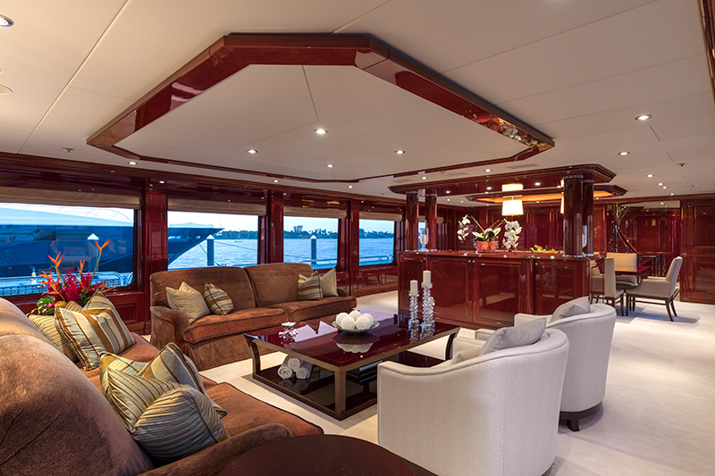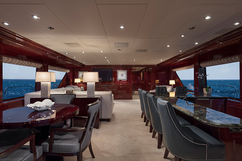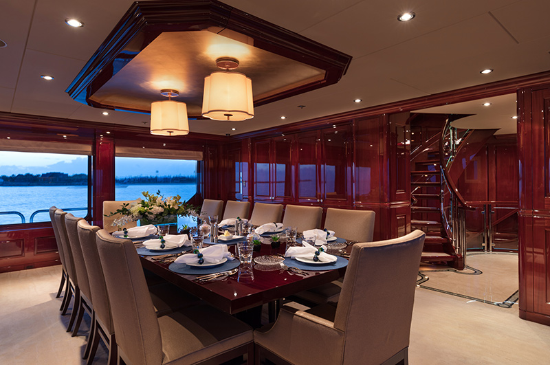 THREE FORKS was delivered by Christensen in 2009 as the forerunner of the popular 160 series. Her sleek exterior styling, executed by the highly experienced in-house Christensen design & engineering team, combined with an interior décor by Carol Williamson & Associates, have created a world class ocean-going motor yacht. Upon walking onboard, guests are greeted with an al fresco seating arrangement perfect for meals. The main salon showcases plenty of comfortable seating, TV, and oversized windows to not miss any of the stunning scenery surrounding the yachts' anchorages. The dining room features seating for 14 at a showstopping cherry table. The luxurious foyer combines marble and cherry woods and features the elevator which services all 4 decks. Arriving on the bridge deck brings guests to the skylounge. The popular interior entertaining area includes plenty of seating, multiple couches, reading nook and inviting full bar with lots of seating for cocktail hour. The bridge offers guests a nice seating area to enjoy the navigation of the yacht and state of the art equipment and monitors. In addition is the Captain's cabin behind and a private stairwell for crew use to allow them to maneuver between crew areas and the bridge without disturbing guests. Aft on this level is the main exterior dining space and some comfortable aft seating. The sun deck offers guests plenty of lounging options including an oversized Jacuzzi and sun pads, seating arrangement, full bar, bar stools and large aft deck for additional lounge chair options. Other features include an elevator to all four decks and two 1,800hp MTU engines give her a cruising speed of 14 knots.