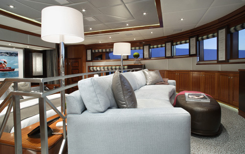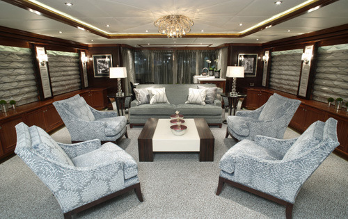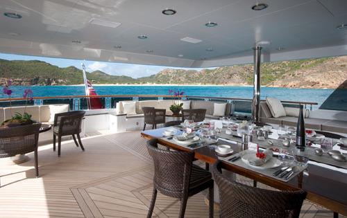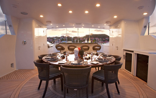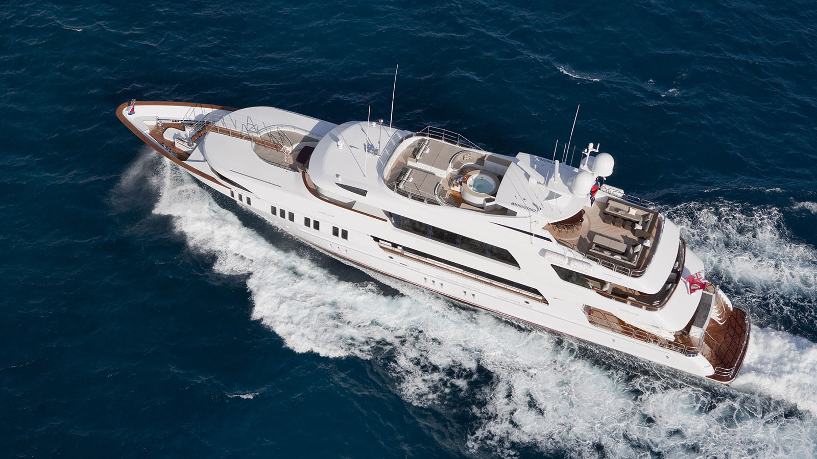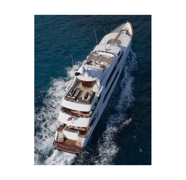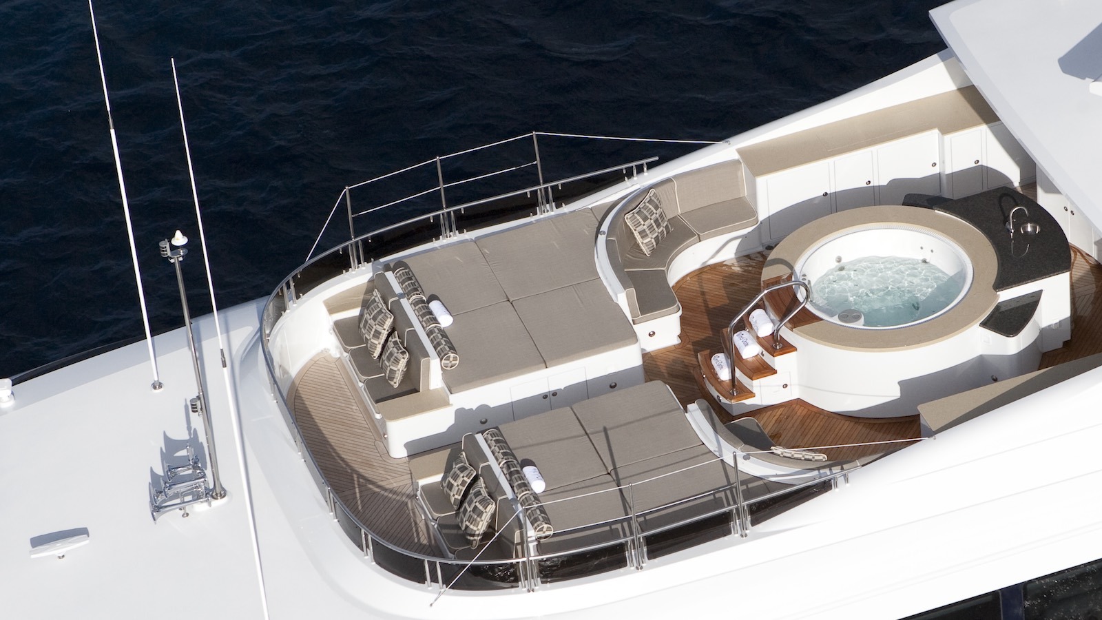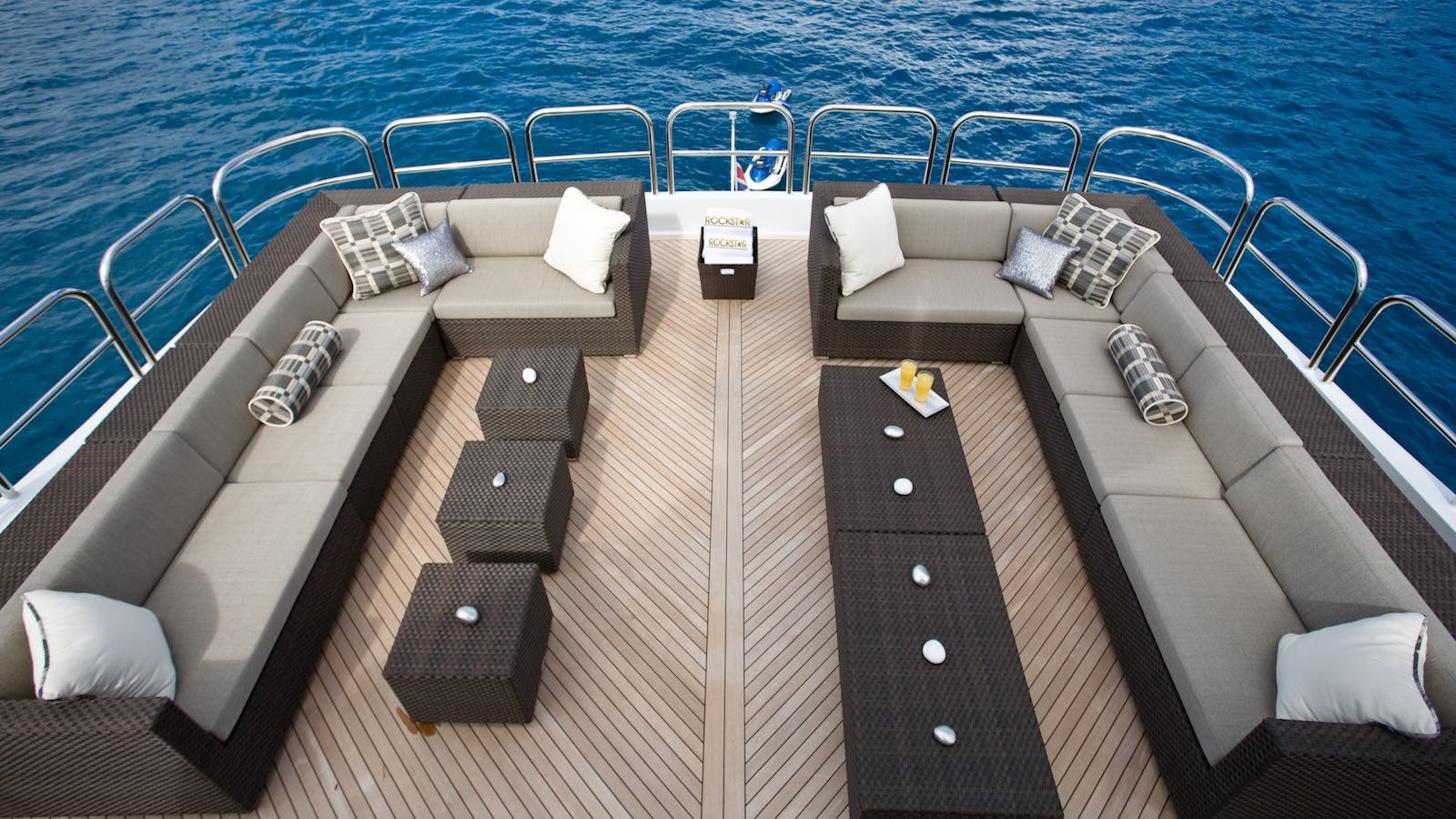 Refitted in 2014, ROCKSTAR is an award-winning luxury yacht with a chic, timeless interior designed by Patrick Knowles and inspired by the glamorous era of old Hollywood. In 2010 ROCKSTAR won The World Superyacht Awards Best Semi-displacement M/Y 40m+ and Judges’ Special Commendation. The soothing grey and cream palette is paired with lively splashes of purple and green. Sparkling light fixtures are found throughout the yacht and highlight her tasteful furnishings. Photographs of 1950’s and 60’s movie stars add a sophisticated finishing touch. The formal Dining area is located on the Main Deck forward of the Main Salon. Alfresco dining can be enjoyed on either the Skylounge Aft Deck or on the Sundeck. ROCKSTAR offers several unique qualities which set her apart from other yachts on the charter market. The impressive split-level Master Stateroom on the Main Deck features a raised observation lounge forward with 270 degrees of visibility. The King size bed is situated on the lower level with spacious his / hers bathrooms (his/shower – hers / Jacuzzi tub.) and ample closet space. Below, 4 luxurious Staterooms enable versatile sleeping arrangements: 3 King Staterooms (1 with Pullman berth) and also a Twin Stateroom which converts into a Queen and also has a Pullman berth. The expansive Sundeck is ideal for guest enjoyment with large sunpads forward of the Jacuzzi, a Bar and Dining area located under the shade of the arch and a huge seating area aft. The Sundeck is the perfect entertaining venue for both intimate and large groups. Seating and sunpads on the Portuguese Bridge provide yet another area to enjoy breathtaking views.