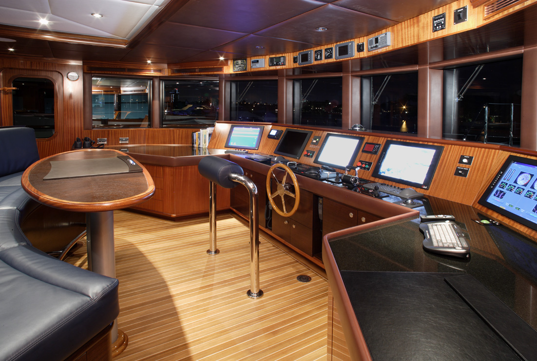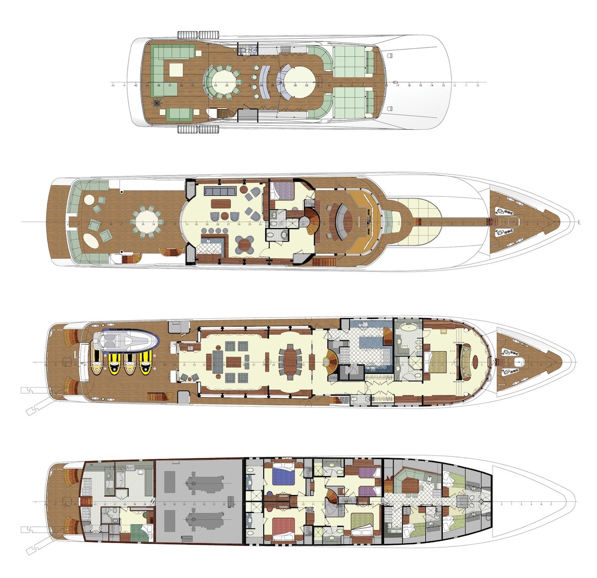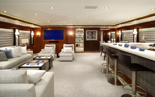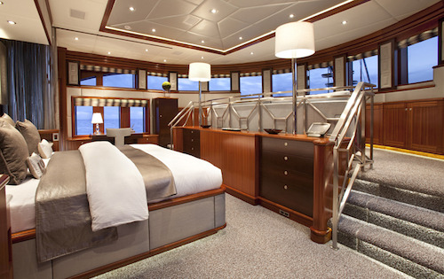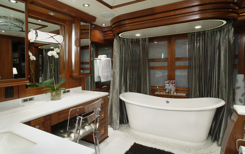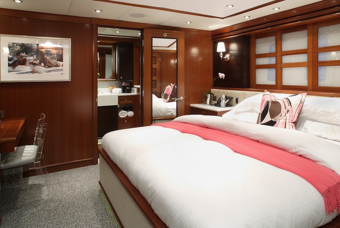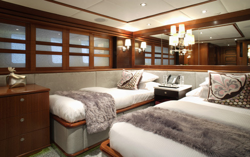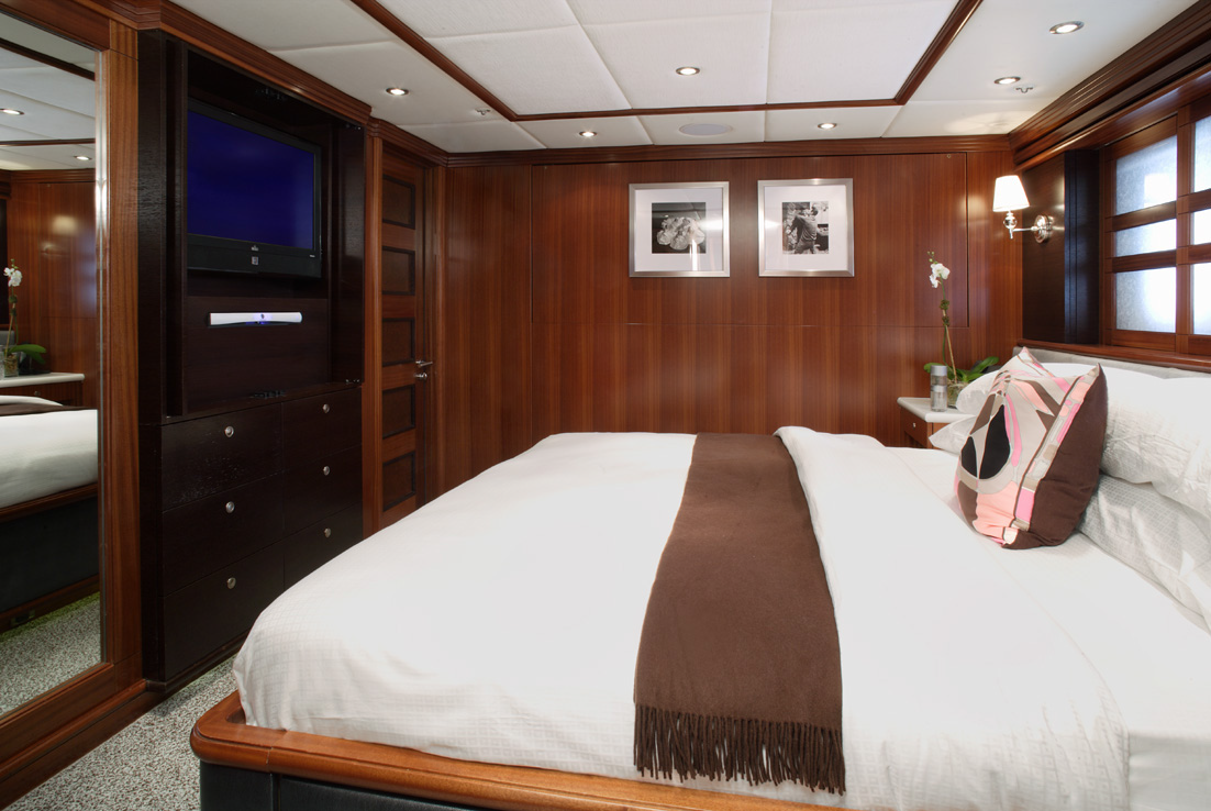 GUEST ACCOMMODATIONS All staterooms are en suite; each stateroom is equipped with HD TV. Kaleidescape movie / music central server with Crestron controls MAIN DECK KING. Master. Split-level suite. The bed is located on the lower lever. Vanity to port. His/hers bathrooms--his with shower / hers with Jacuzzi 46" TV Elevated lounge forward with 270 degrees of visibility, 32" TV Below: King. Port. Deck/Vanity. Tub. Shower King. Starboard. Deck/Vanity. Shower Forward KING with Pullman. Starboard. Shower TWIN with Pullman. Port. **Converts to a QUEEN with Pullman. Shower