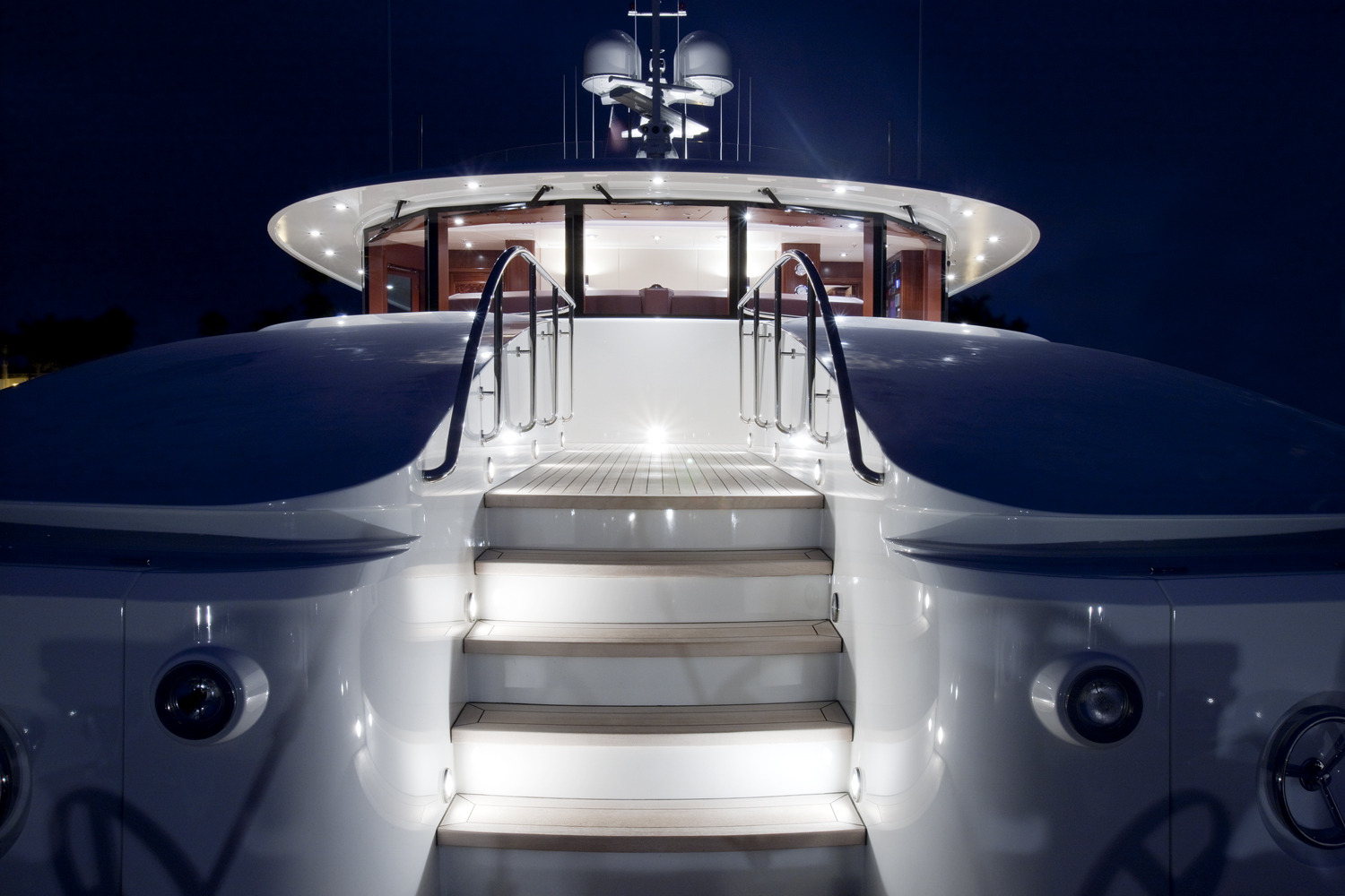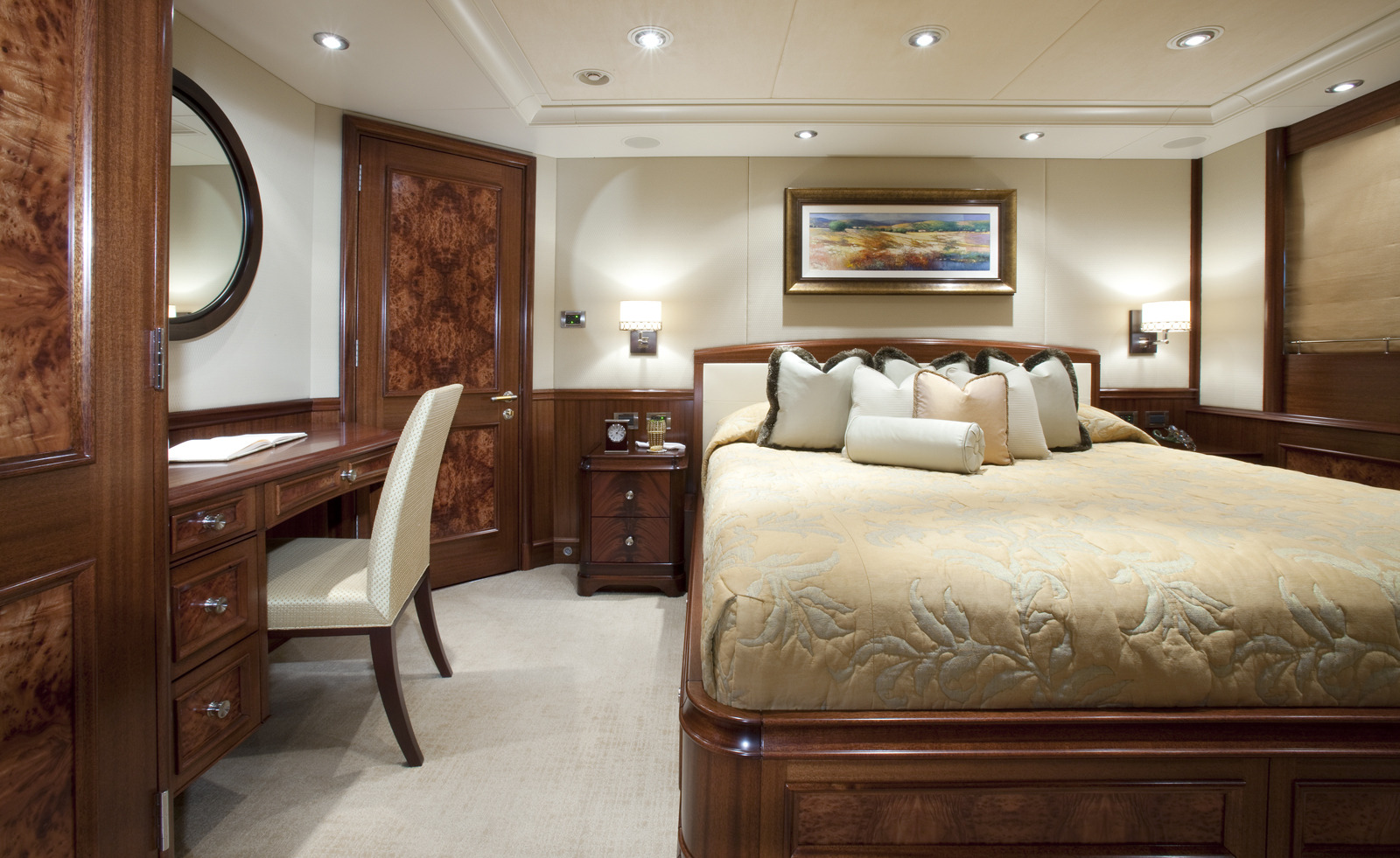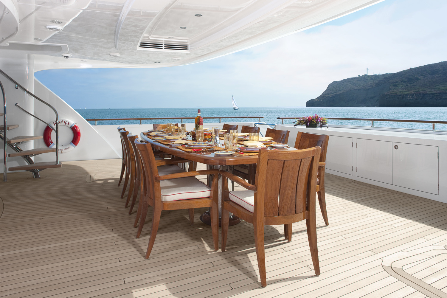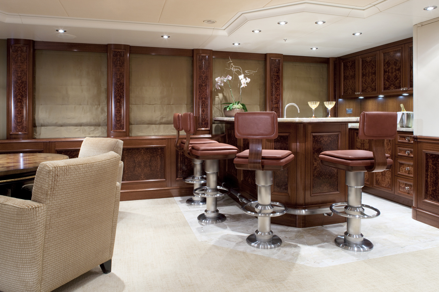 A total of 5 staterooms accommodating up to 12* guests when children are included or a maximum of 10 adults. *Note: dining tables accommodate 10 seated. All accommodations have been upgraded with extensive all new AV technology including new 4k hi def flatscreen TVs. Each stateroom is equipped with individual climate control, individual satellite receivers, complete blackout, iPod docking stations, Crestron iPad controls, hair-dryers, telephone and intercom MASTER STATEROOM SUITE The Master Stateroom Entrance is situated on the Main Deck. Upon entering, Owner’s office area is to Stbd and features a desk and chair. The walk-around King bed faces aft and features a 43” flat screen TV, surround sound, vanity to port and couch to starboard. En-suite bath (can either enter on His side or Her side) with over sized Jacuzzi Tub, separate shower, twin sinks, private toilet. Heated flooring. The entire Master suite features 5 very large oval windows offering stunning views and plenty of natural light. Safe. BELOW DECK Access to the 4 below guest staterooms are lead by a spiral stairwell with railings on either side. The guest foyer below also features a stunning Tiger’s Eye inlay. The two aft starboard side and port side guest staterooms feature a walk around King bed. Vanity/desk. En-suite bath features an over-sized shower with bench seating, twin sinks & private toilet. The forward starboard side stateroom features a walk around Queen bed. Vanity/desk. En-suite bath features an over-sized shower with bench seating, twin sinks & private toilet. The forward Port stateroom features a double size bed and one single bed plus a pullman. This is a great children's cabin, nanny cabin or can be used for two adults. There is a vanity/desk.. En-suite bath features an oversized Jacuzzi tub, shower, twin sinks & private toilet. From the main salon (with 55" TV) to the skylounge (with 65" TV and bar), guests have a variety of social environments to enjoy. While on the exterior, there are two dining area - main and bridge levels (43" TV exterior) plus plenty of relaxation and entertaining space from beach club all the way up to the expansive sundeck with central bar.