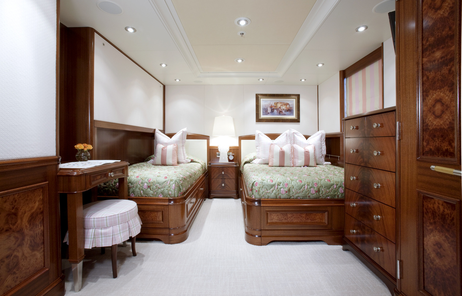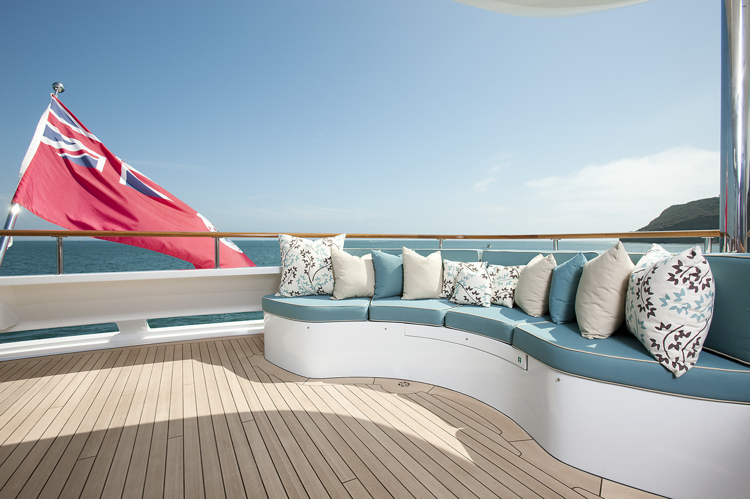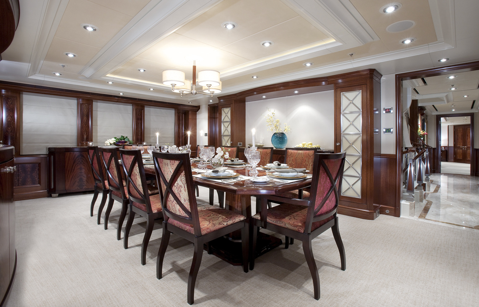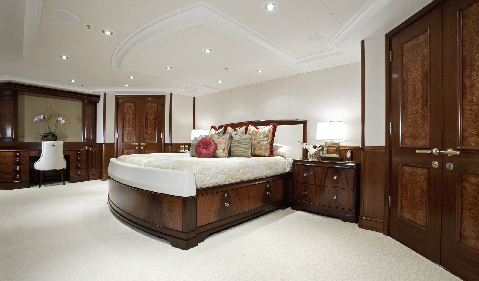 A total of 5 staterooms accommodating up to 12* guests when children are included or a maximum of 10 adults. *Note: dining tables accommodate 10 seated. All accommodations have been upgraded with extensive all new AV technology including new 4k hi def flatscreen TVs. Each stateroom is equipped with individual climate control, individual satellite receivers, complete blackout, iPod docking stations, Crestron iPad controls, hair-dryers, telephone and intercom MASTER STATEROOM SUITE The Master Stateroom Entrance is situated on the Main Deck. Upon entering, Owner’s office area is to Stbd and features a desk and chair. The walk-around King bed faces aft and features a 43” flat screen TV, surround sound, vanity to port and couch to starboard. En-suite bath (can either enter on His side or Her side) with over sized Jacuzzi Tub, separate shower, twin sinks, private toilet. Heated flooring. The entire Master suite features 5 very large oval windows offering stunning views and plenty of natural light. Safe. BELOW DECK Access to the 4 below guest staterooms are lead by a spiral stairwell with railings on either side. The guest foyer below also features a stunning Tiger’s Eye inlay. The two aft starboard side and port side guest staterooms feature a walk around King bed. Vanity/desk. En-suite bath features an over-sized shower with bench seating, twin sinks & private toilet. The forward starboard side stateroom features a walk around Queen bed. Vanity/desk. En-suite bath features an over-sized shower with bench seating, twin sinks & private toilet. The forward Port stateroom features a double size bed and one single bed plus a pullman. This is a great children's cabin, nanny cabin or can be used for two adults. There is a vanity/desk.. En-suite bath features an oversized Jacuzzi tub, shower, twin sinks & private toilet. From the main salon (with 55" TV) to the skylounge (with 65" TV and bar), guests have a variety of social environments to enjoy. While on the exterior, there are two dining area - main and bridge levels (43" TV exterior) plus plenty of relaxation and entertaining space from beach club all the way up to the expansive sundeck with central bar.