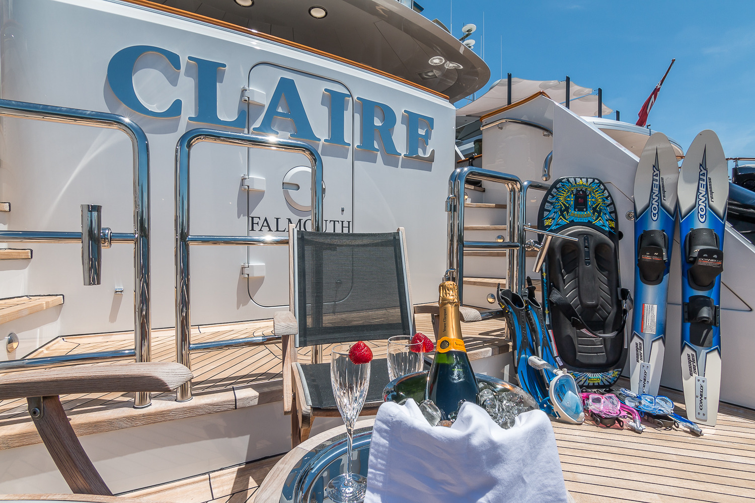 CLAIRE maintains all the comforts of a five-star resort—perfect for families and romantic getaways. Her outdoor main aft deck dining tables convert to one or two daybeds, allowing four different aft deck layouts, maximizing the lounging and dining options on this deck. A large-screen TV makes this area perfect for movie nights. Her sun deck is superior, and features a bar, BBQ grill, day head, huge Jacuzzi, huge sunpad, treadmill, and a large-screen TV. CLAIRE sleeps 11 guests in 5 staterooms. The owner's cabin is located forward (full width) on the main deck. There are 4 extra large guest staterooms. 3 are King cabins and the fourth guest cabin is a twin bedded cabin with a pullman.