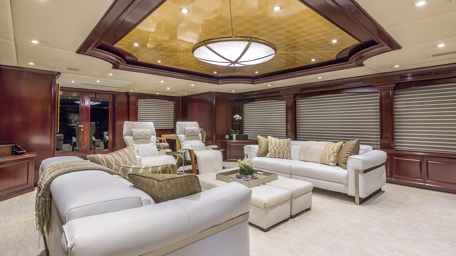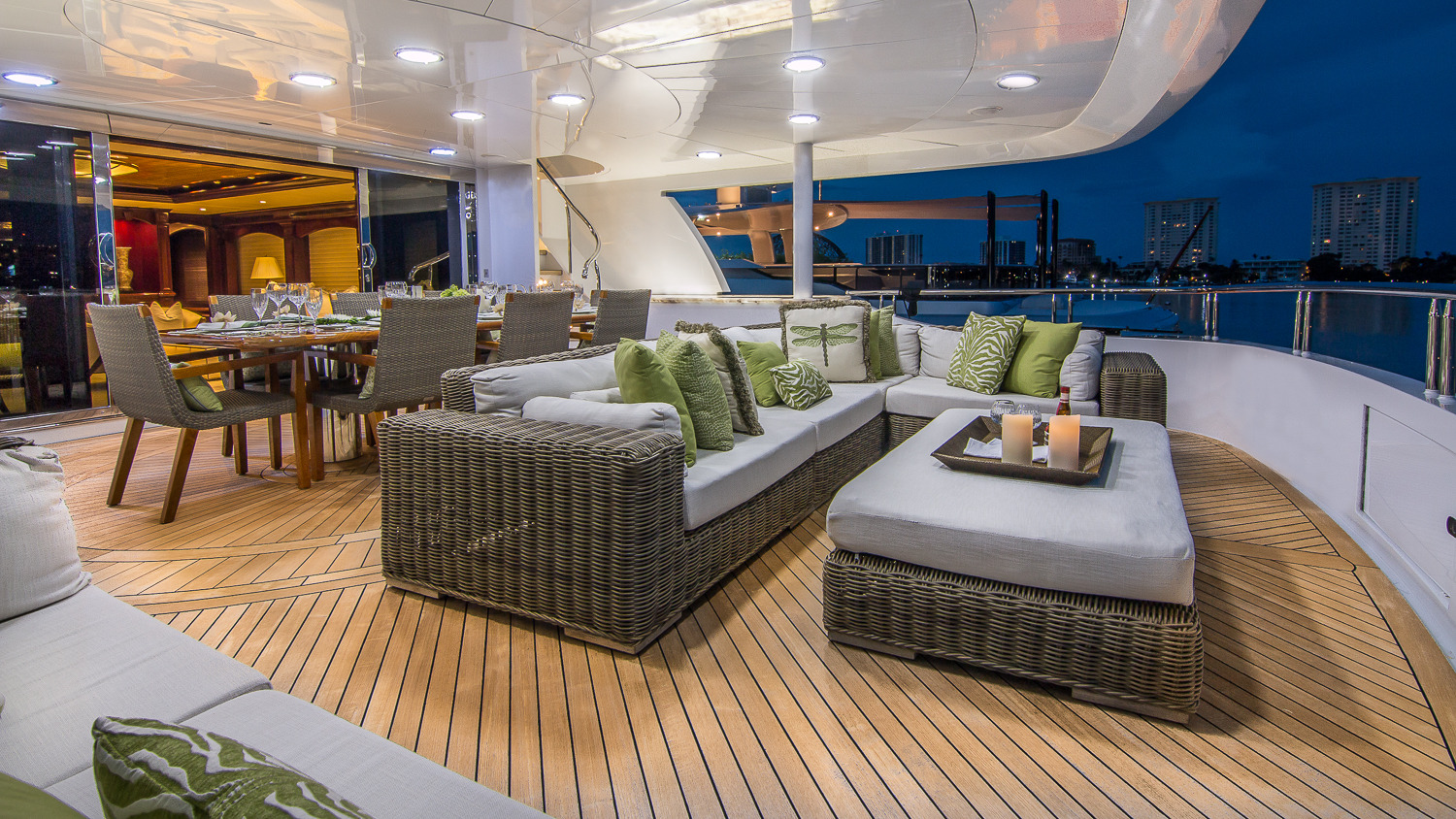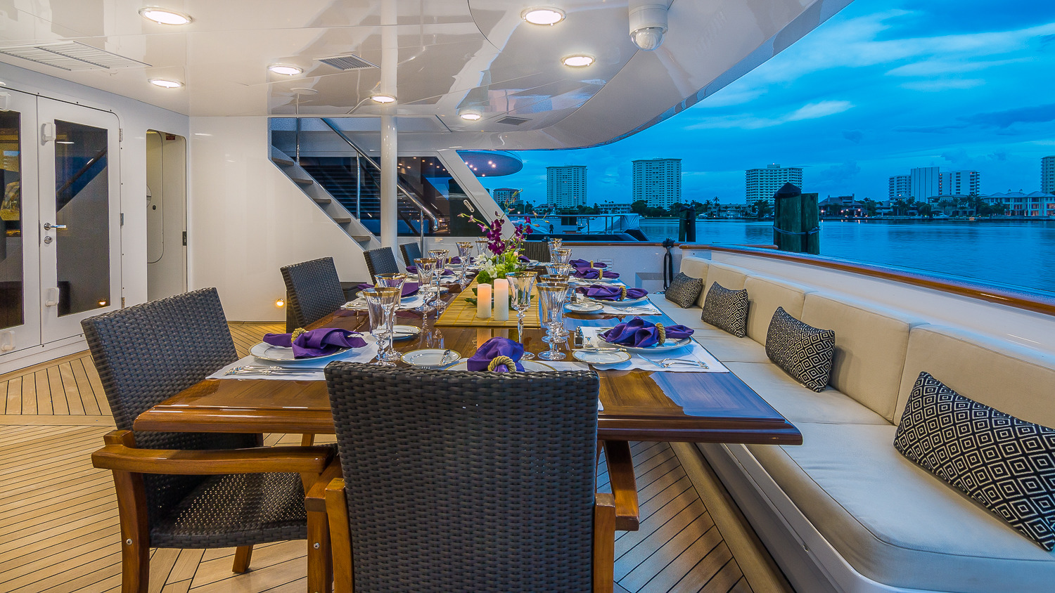 CLAIRE is a stunning 46 metre Trinity Yachts creation launched in 2003. She accommodates up to 10 guests in 5 classic staterooms and is available for charter along the Floridian coastline and in the Bahamas. She is an eclectic mix of interior and exterior volume, offering a rare 4 king cabins and a twin. Outside the al fresco dining area is expansive and can easily seat 12, whilst on the flydeck the jacuzzi and sunbathing area take centre stage on their stunning elevated platform. Her interior is classic, clean and offers a taste of the palatial. She offers extensive space as well as state-of-the-art electronics throughout.
