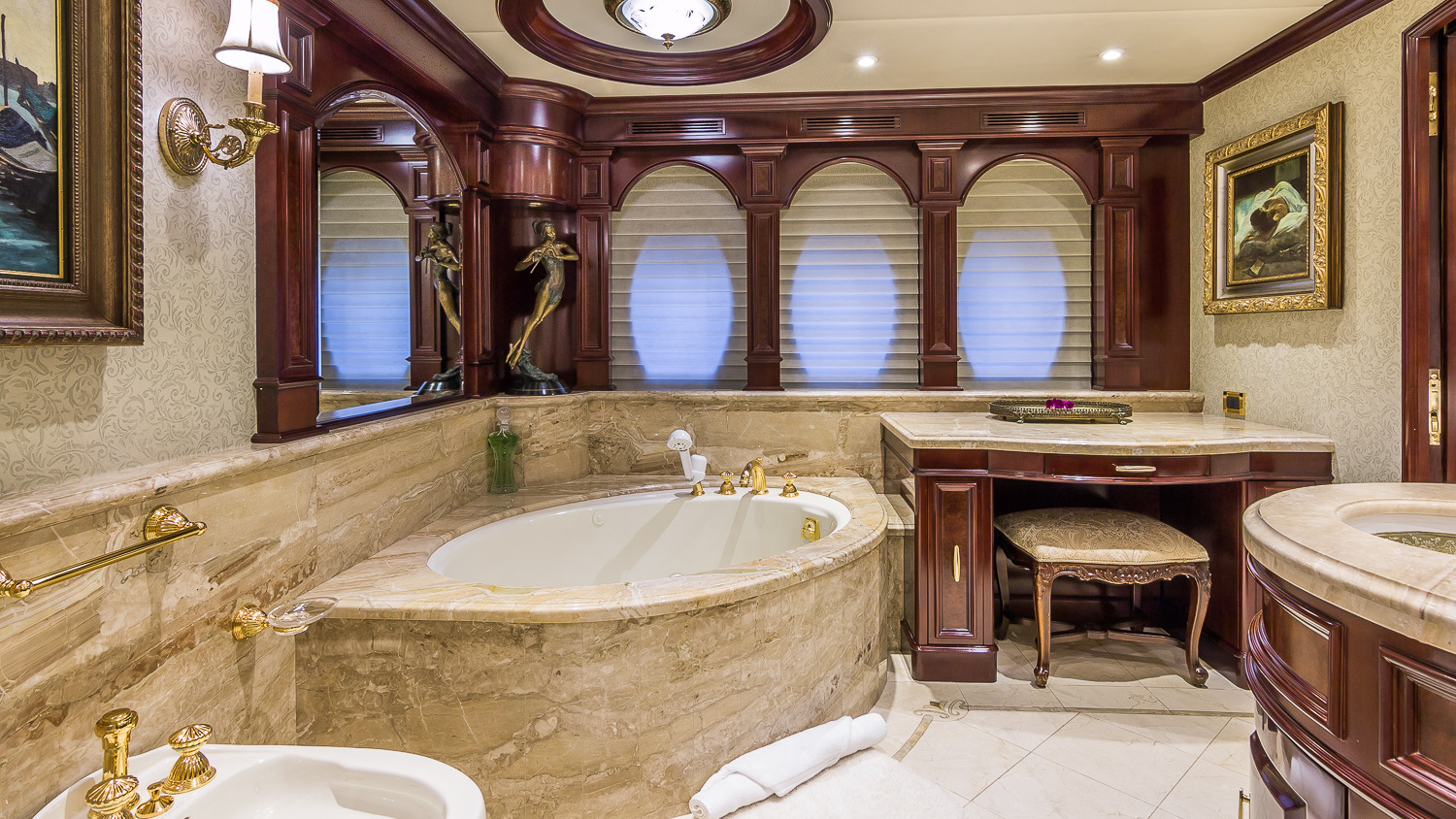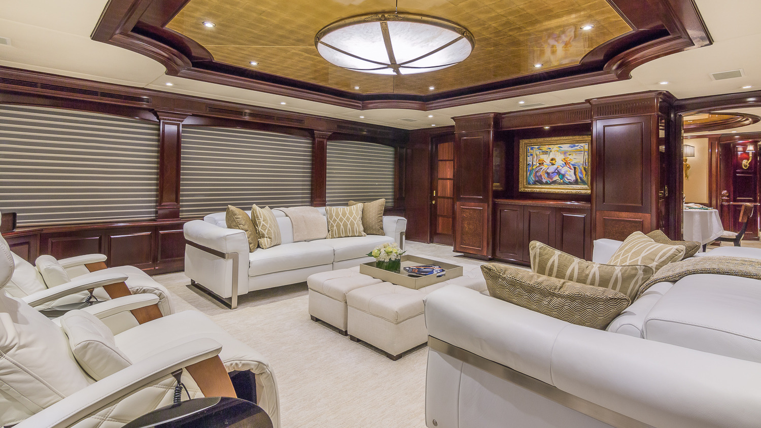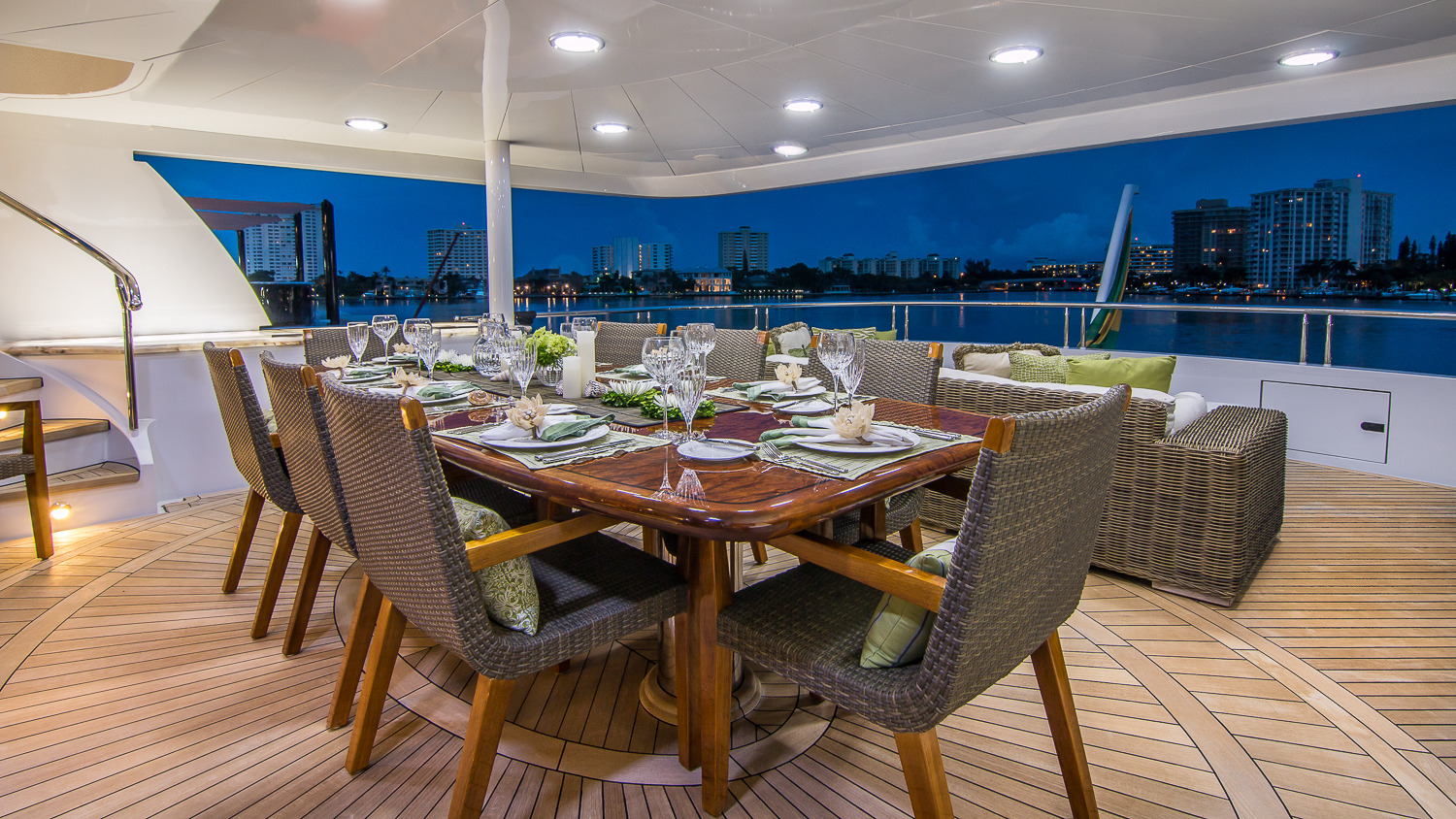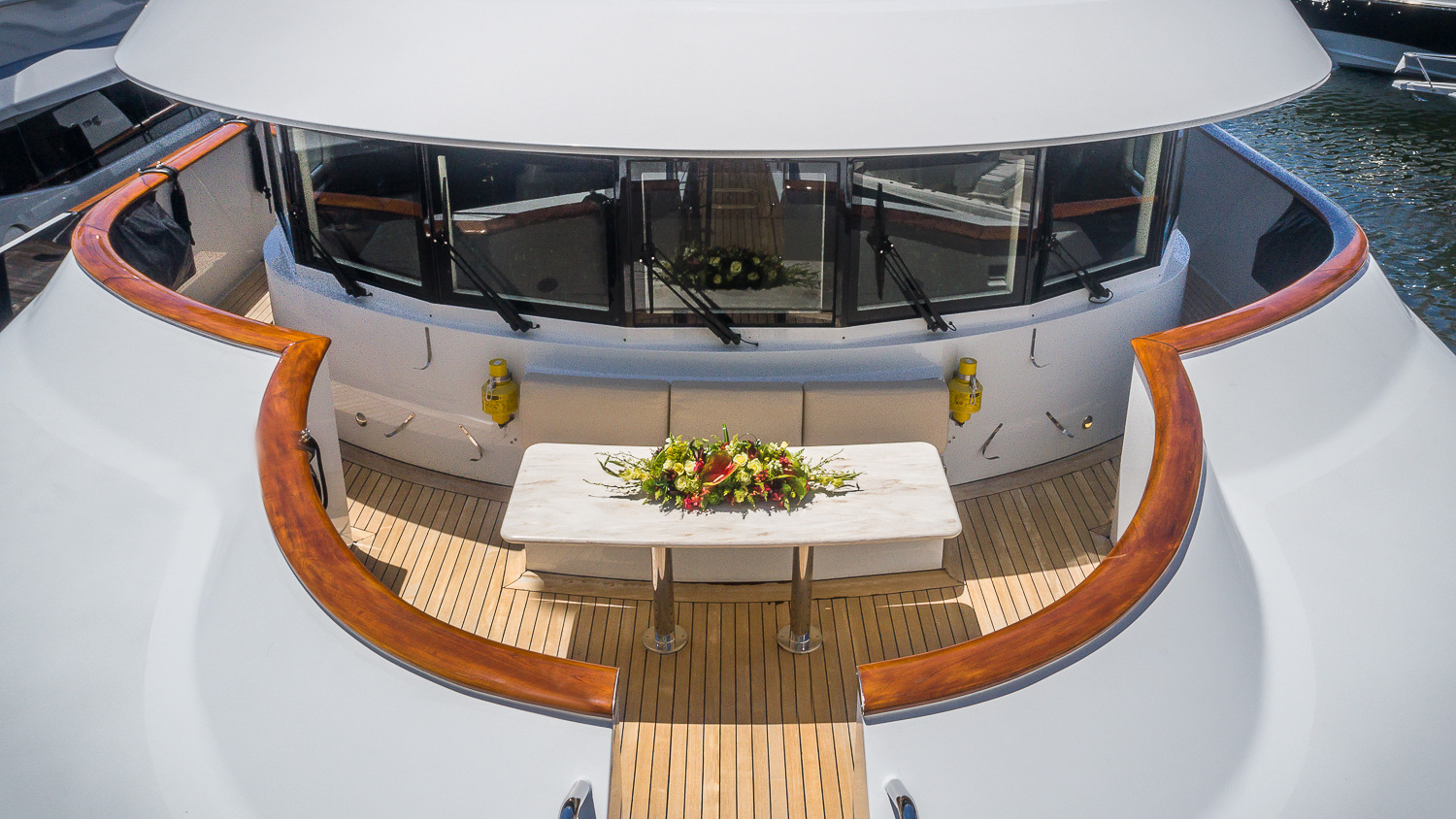 CLAIRE is a stunning 46 metre Trinity Yachts creation launched in 2003. She accommodates up to 10 guests in 5 classic staterooms and is available for charter along the Floridian coastline and in the Bahamas. She is an eclectic mix of interior and exterior volume, offering a rare 4 king cabins and a twin. Outside the al fresco dining area is expansive and can easily seat 12, whilst on the flydeck the jacuzzi and sunbathing area take centre stage on their stunning elevated platform. Her interior is classic, clean and offers a taste of the palatial. She offers extensive space as well as state-of-the-art electronics throughout.
