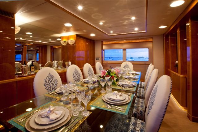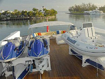 Rena 145' Jack Hargrave-designed motor yacht Sea kindly and strong, this luxurious 145-foot private ship accommodates 10-12 guests in five beautiful staterooms, all with ensuite bathrooms and private Jacuzzis. All five staterooms have state-of-the-art entertainment centers including flat screen satellite TV, DVD/CD, and Ipods friendly systems. Two of the staterooms -- the master and the VIP stateroom -- are especially large and have king-size beds. The other three staterooms are also finely appointed, with a queen and a twin; two of these staterooms also have a pullman berth. Very well suited for private, family, and corporate charters, Rena underwent a major refit in 2004-2005 and is in impeccable condition. She has a wide choice of sparkling new water toys for leisure-time fun (see list below), and WiFi compatibility for access to email and the Internet. Rena offers an atmosphere of quiet elegance in the large saloon,and open spacious dining room while her many outdoor spaces are wonderful for more relaxed entertaining. The large circular table on the broad covered aft deck comfortably seats 12 for meals, and this is also an especially pleasant place for cocktails. The upper deck, with its grill and bar, plus table and settees, is perfect for cookouts. Rena is crewed by an outstanding and experienced crew of 8 who love to treat their guests to memorable theme nights, complete with costumes and delicious food. For the water enthusiast !! 35' Custom HBI Inflatable with Twin 250HP Engines, Comfotable seating for 12 17 Nautical Catamaran landing craft with 115hp Fantastic for landing on beach. 2 Yamaha three man Wave runners (can be toned down for kids) 2 Hobies Mirage Kayaks with optional pedal devices 1 Vanguard Zuma sailing dinghy Snorkel Gear Wake board Towing ring Water skis Tread mill Exercise bike And anything else one requires!