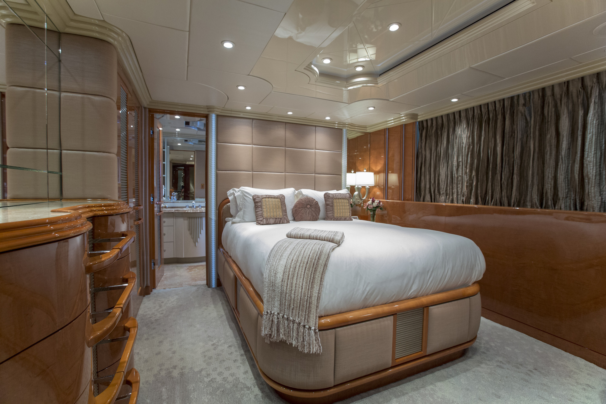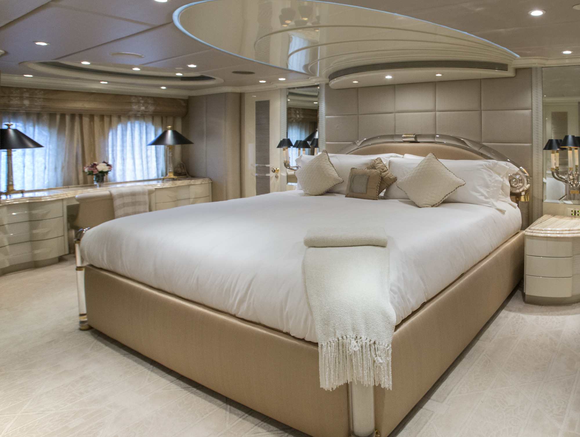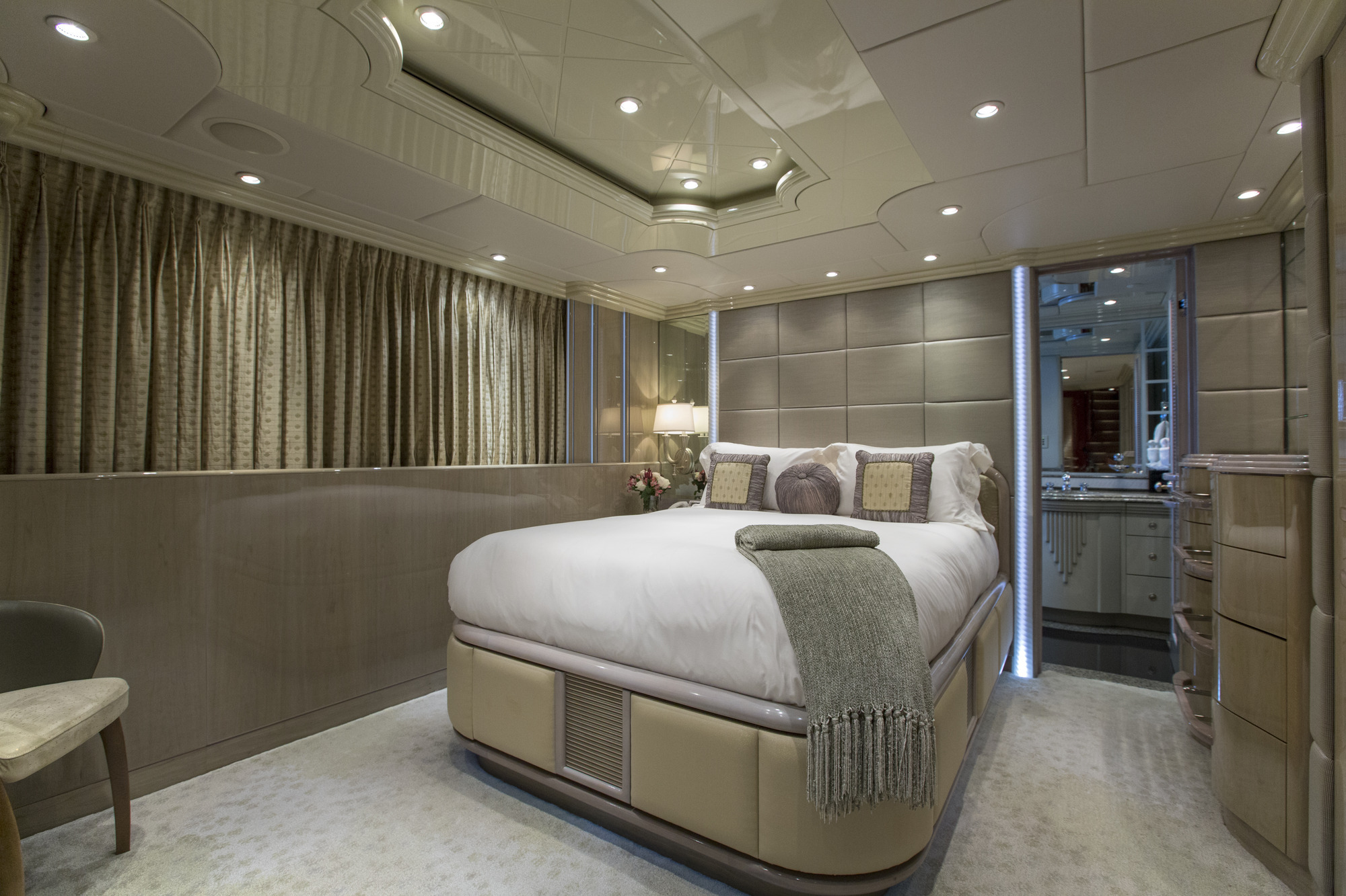 Main Deck Master - Full Beam with King bed and sofa in in a comforting cream hue. Walk in closet has a personal washer/dryer. Separate office with large windows. Vanity with lighted mirror. His/ hers master bath separated by a walk in shower. The shower boasts a beautiful waterfall feature. Crestron controls for AV. Accommodations Deck: Two Queen staterooms with ensuite facilities and shower. Crestron controls for AV. Two generous twin staterooms with ensuite facilities and show. Crestron controls for AV.