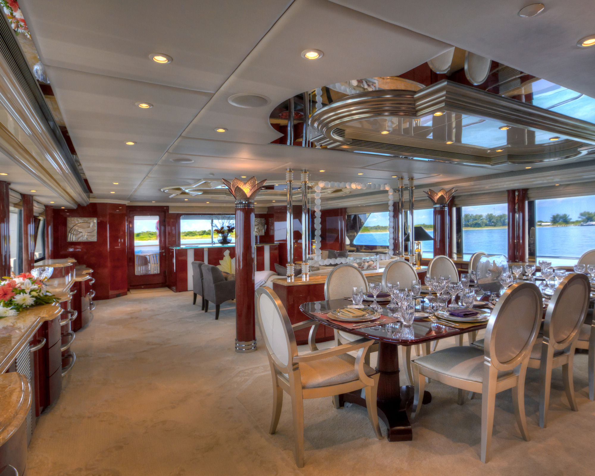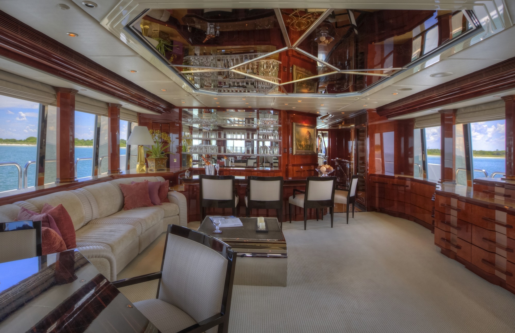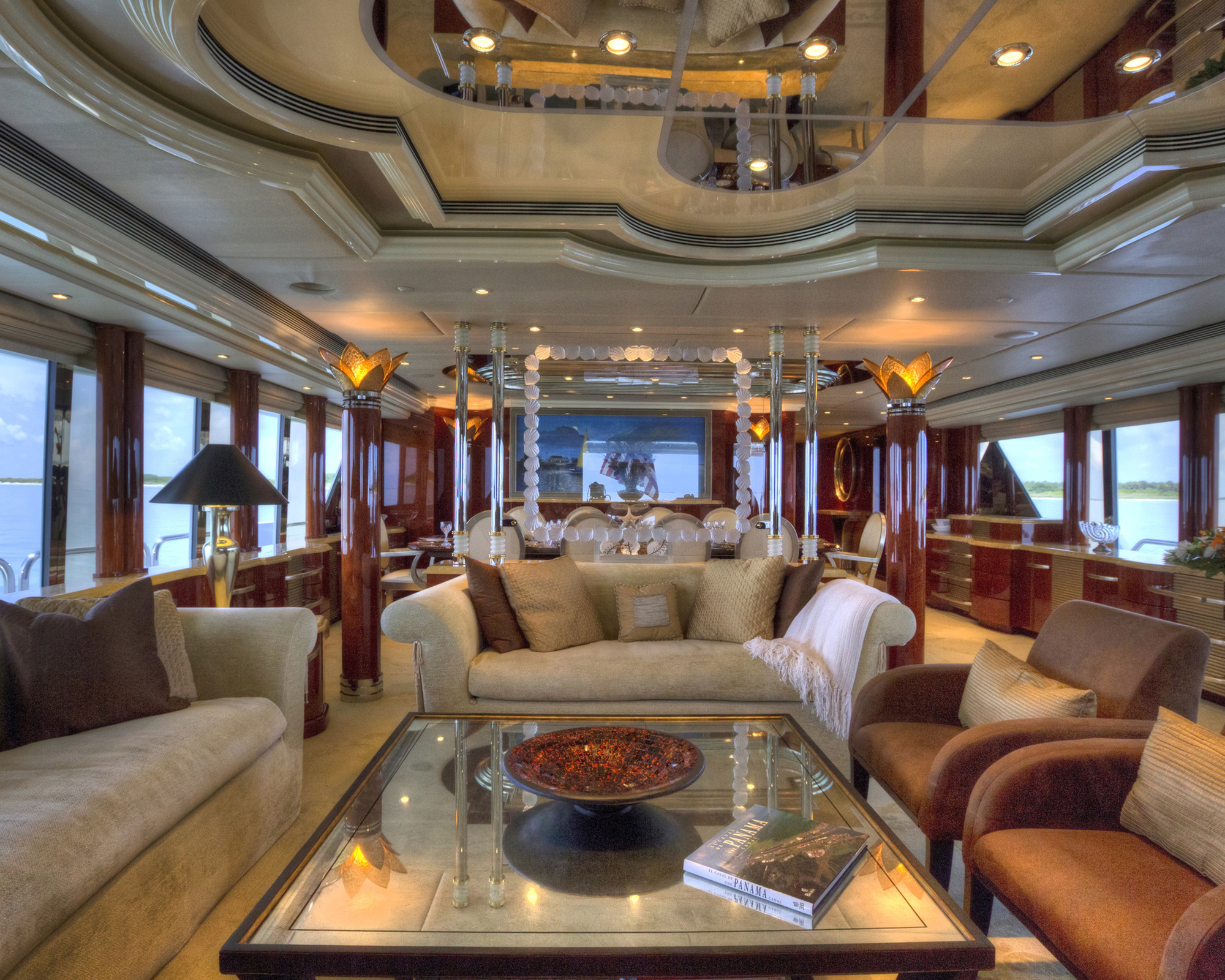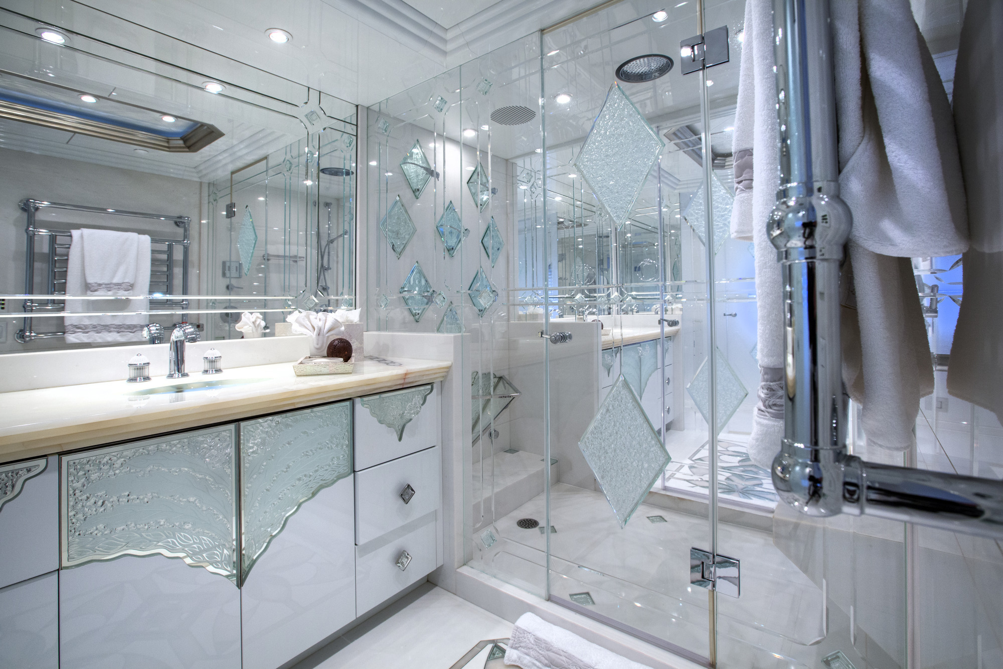 Main Deck Master - Full Beam with King bed and sofa in in a comforting cream hue. Walk in closet has a personal washer/dryer. Separate office with large windows. Vanity with lighted mirror. His/ hers master bath separated by a walk in shower. The shower boasts a beautiful waterfall feature. Crestron controls for AV. Accommodations Deck: Two Queen staterooms with ensuite facilities and shower. Crestron controls for AV. Two generous twin staterooms with ensuite facilities and show. Crestron controls for AV.