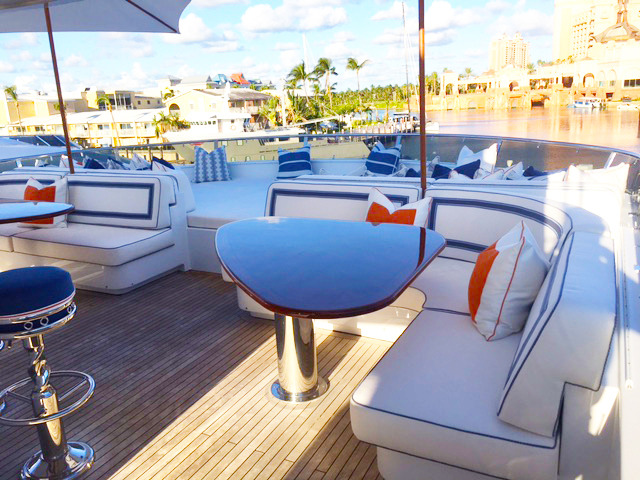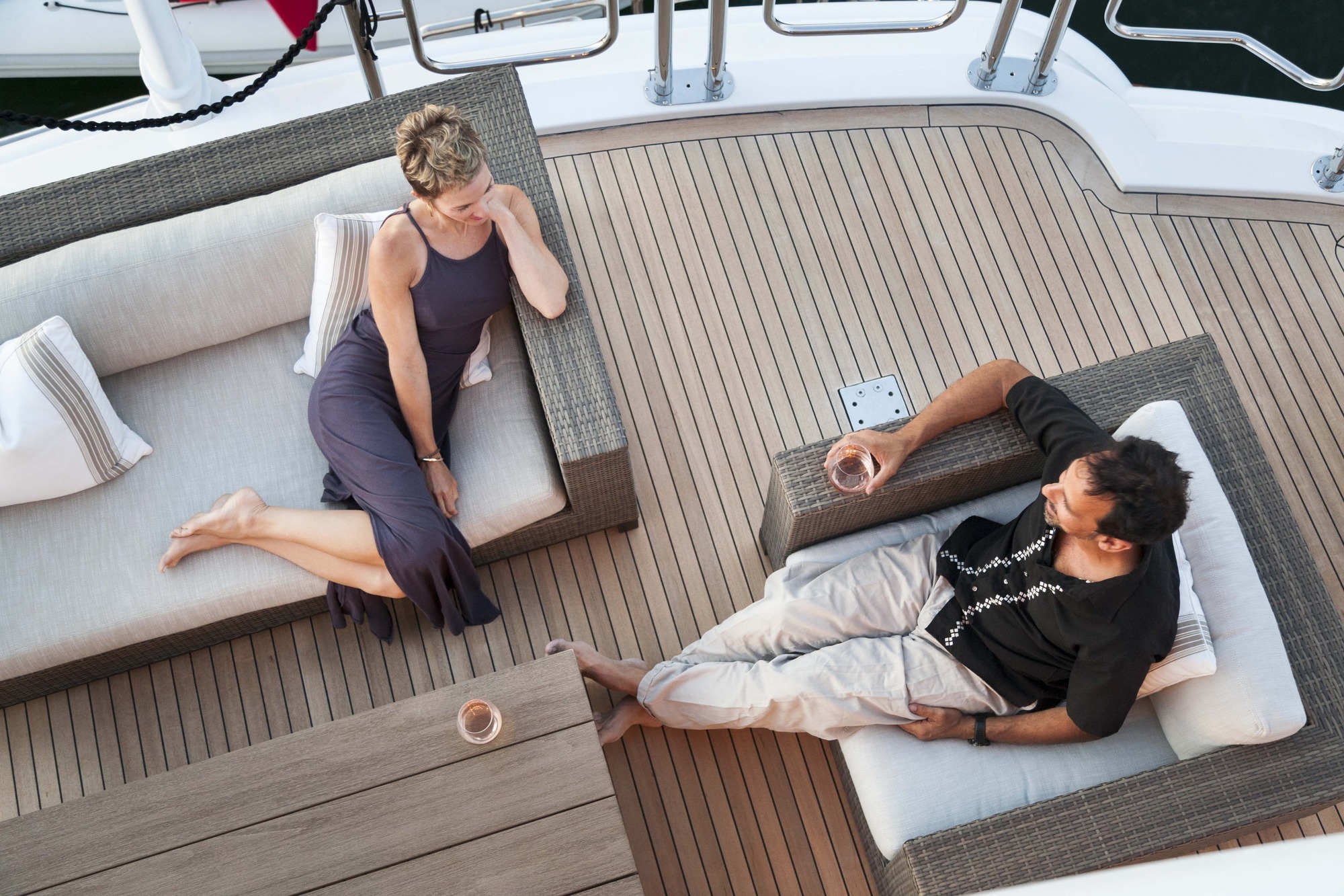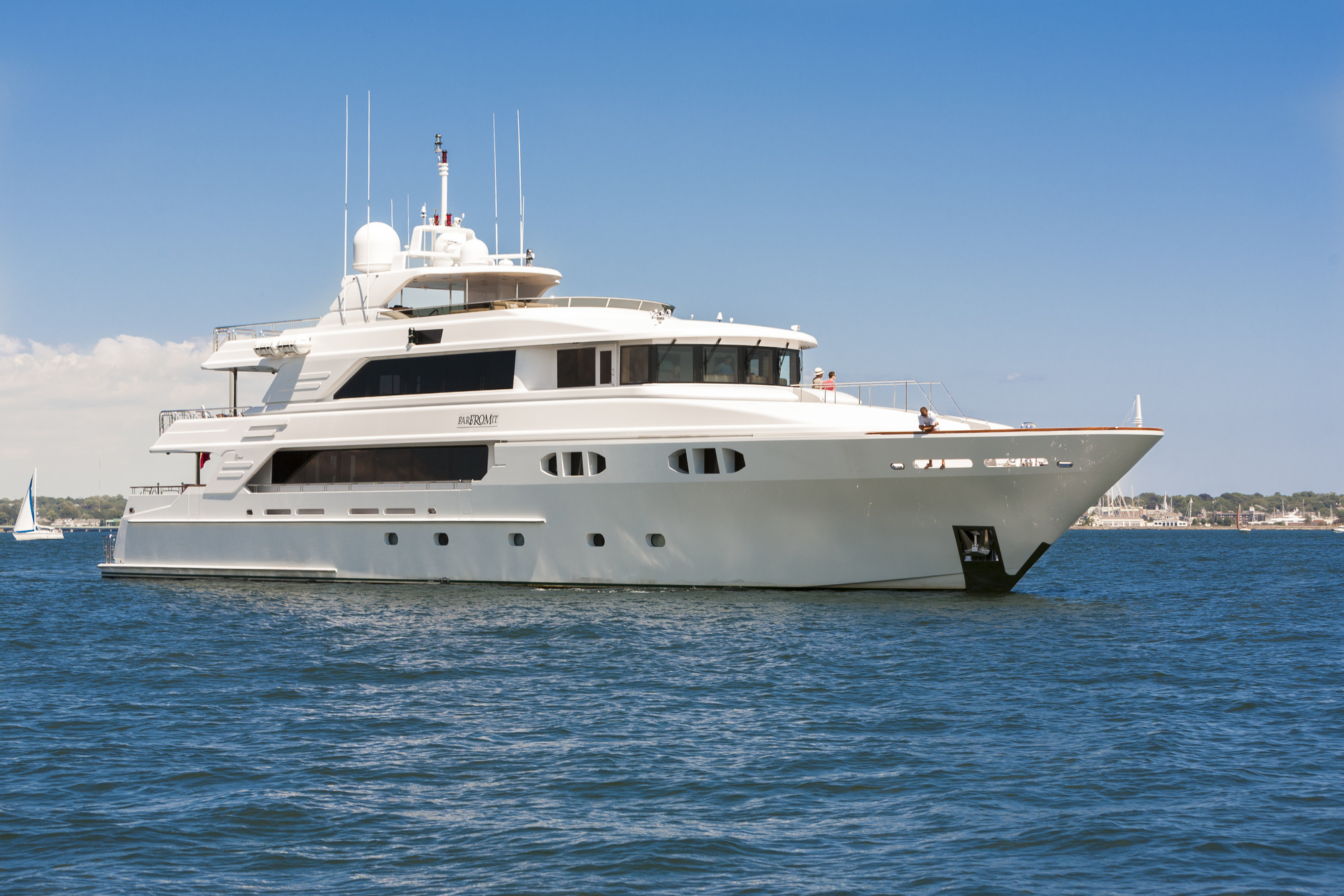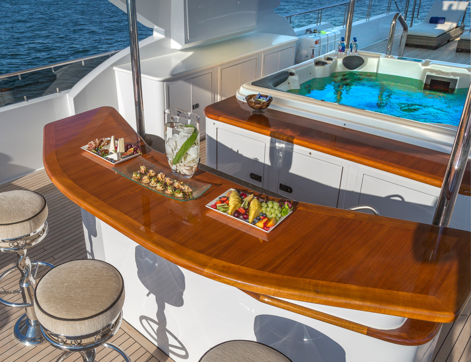 At 142ft (43.28m), FAR FROM IT feels like a much larger boat, thanks to her wide beam and clever use of internal space. Enjoying a thorough refit in 2016, FAR FROM IT has been given a major lift in new carpets, furnishings, linens, art, AV equipment, new towed tender and current model Waverunners for all-day on-water fun! FAR FROM IT has six spacious cabins accommodating 12 guests in total comfort and style: the full-beam Master on main deck, VIP on Sky Lounge deck and four Guest staterooms on the lower deck, three Queens and one Twin room. The Master suite boasts a magnificent desk and office area with a TV and a Subzero two drawer refreshment centre. As well as large King bed, there is a dresser with vanity, full entertainment system in cabinetry opposite the bed, with a 50" Samsung LCD TV. Forward of the bed are his (starboard) with dual head steam shower and her (port) bathrooms, with large Jacuzzi tub and bidet. Both bathrooms have TVs. Each guest stateroom has a beautifully appointed ensuite bathroom with slab marble and granite counter tops. Inside, décor is classic elegance, with the finest in every detail – gloss timber panelling, cream carpet, subtle LED lighting, superb art and sculpture and intricately crafted ceiling inlays. The saloon is large and welcoming, ideal for socialising. With two large custom sofas, an armchair and two custom designed cocktail tables, power drapes with a coffered ceiling that is illuminated by a custom etched glass compass rose, guests will be in awe at the attention to detail and craftsmanship. The entertainment centre that separates the saloon from the formal dining room includes a fixed 52" LCD TV, Denon tuner/amplifier, DVD player, media music centre and Satellite Receiver. For guests' entertainment, there is a Yamaha Disklavier piano in pride of place. The spacious formal dining section is one of three places to dine onboard. It features a custom-built round mahogany dining table for up to 10 guests and an exquisite French gold and white Murano glass chandelier. The professional galley lies on the other side of automatic doors for ease of service. The boat's large Subzero wine cooler is located outside the galley, concealed in the main foyer area. The main aft deck is an exceptional undercover space, with ample seating around the large custom teak table that converts to either a dining table or a cocktail table. There is a beautiful teak and granite refreshment bar complete with ice maker, refrigerator and flip down 50" LCD TV. Above the main deck level is the sky lounge with pilothouse, VIP stateroom and skylounge area. The sky lounge is huge and features two leather sofas and leather chairs along with a reversible card table, with granite bar and leather bar stools. The entertainment centre on the forward bulkhead includes 52" LCD TV, Denon receiver¬ amplifier, DVD, CD, Apple TV system and Sonas music system. The upper aft deck has a round teak table for 10 guests, with a compass rose inlay that is duplicated on the coffer ceiling. There's also a wet bar, fridge, a 50" plasma TV with surround sound and a propane grill/oven for alfresco dining. The flybridge has a crescent-shaped bar with four bar stools, wrapping around the 60-jet Jacuzzi. A day head is conveniently located on this desk for ease of use by guests. Located aft, the large sun¬ deck has four lounge chairs and large seating area with teak tables and umbrellas. FAR FROM IT guarantees to please the active charter guest, with new 18ft RIB tender, SeaDoo Spark Waverunners, Seabobs, dive compressor, snorkelling gear, wakeboards, standup paddleboard and towable toys to take full advantage of the water wonderland that is the Caribbean. FAR FROM IT is crewed by a talented team of eight, led by Captain Toby Harris. Meals onboard FAR FROM IT are a highlight, deemed delectable by previous charter guests. There is a hidden crew door that allows ease of access for the crew into the guest foyer to service the lower deck with minimal intrusion.
