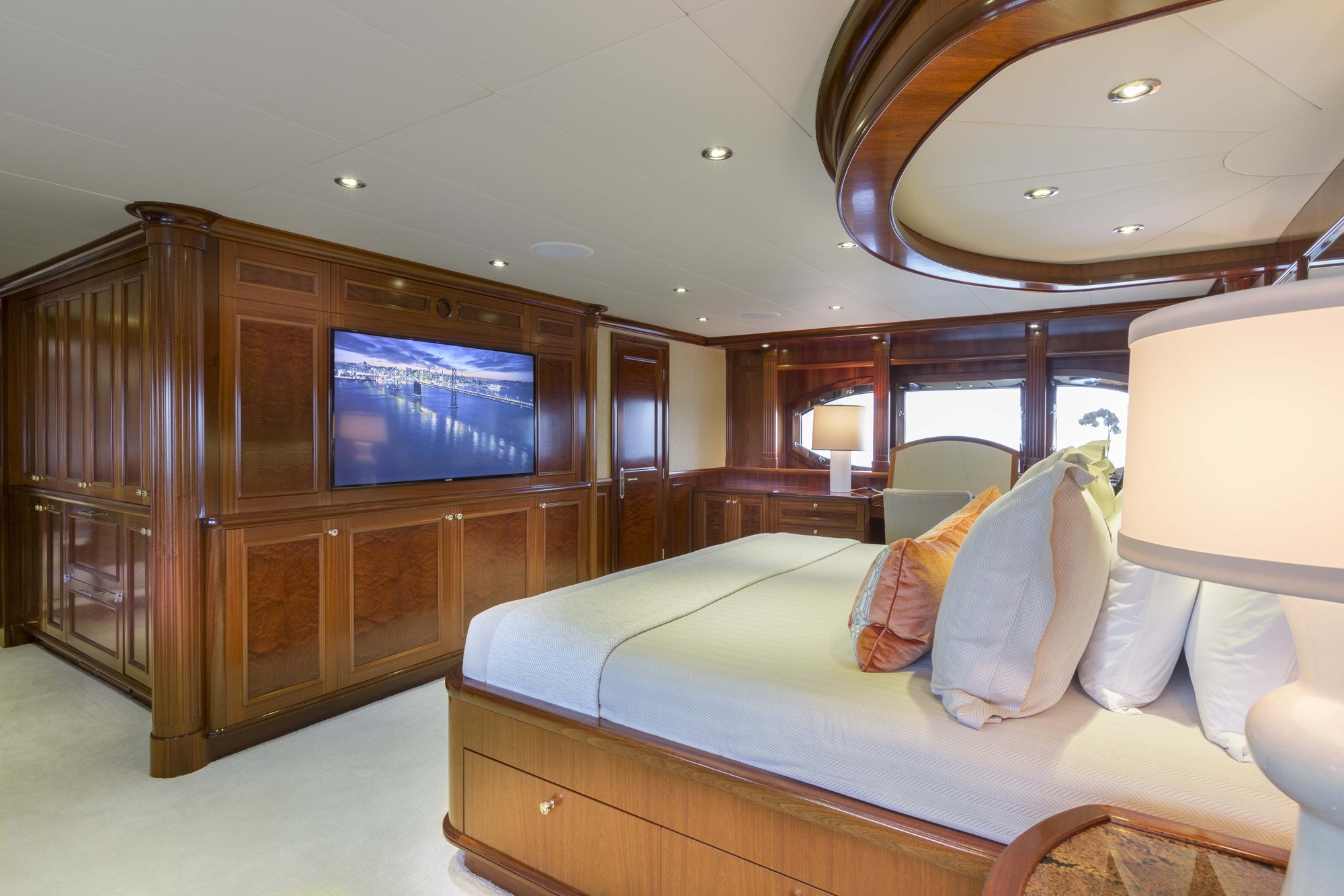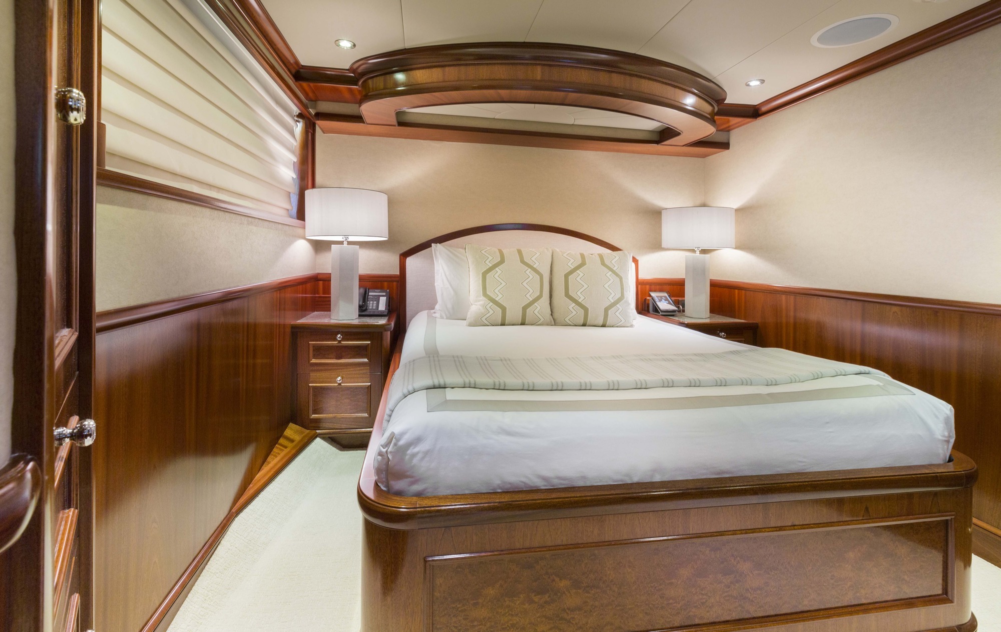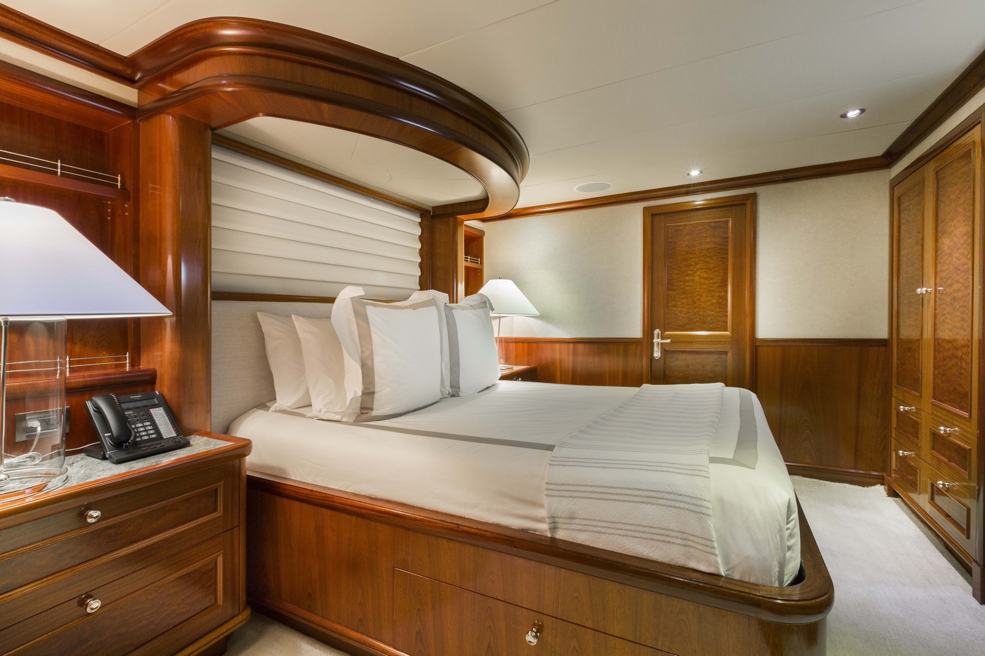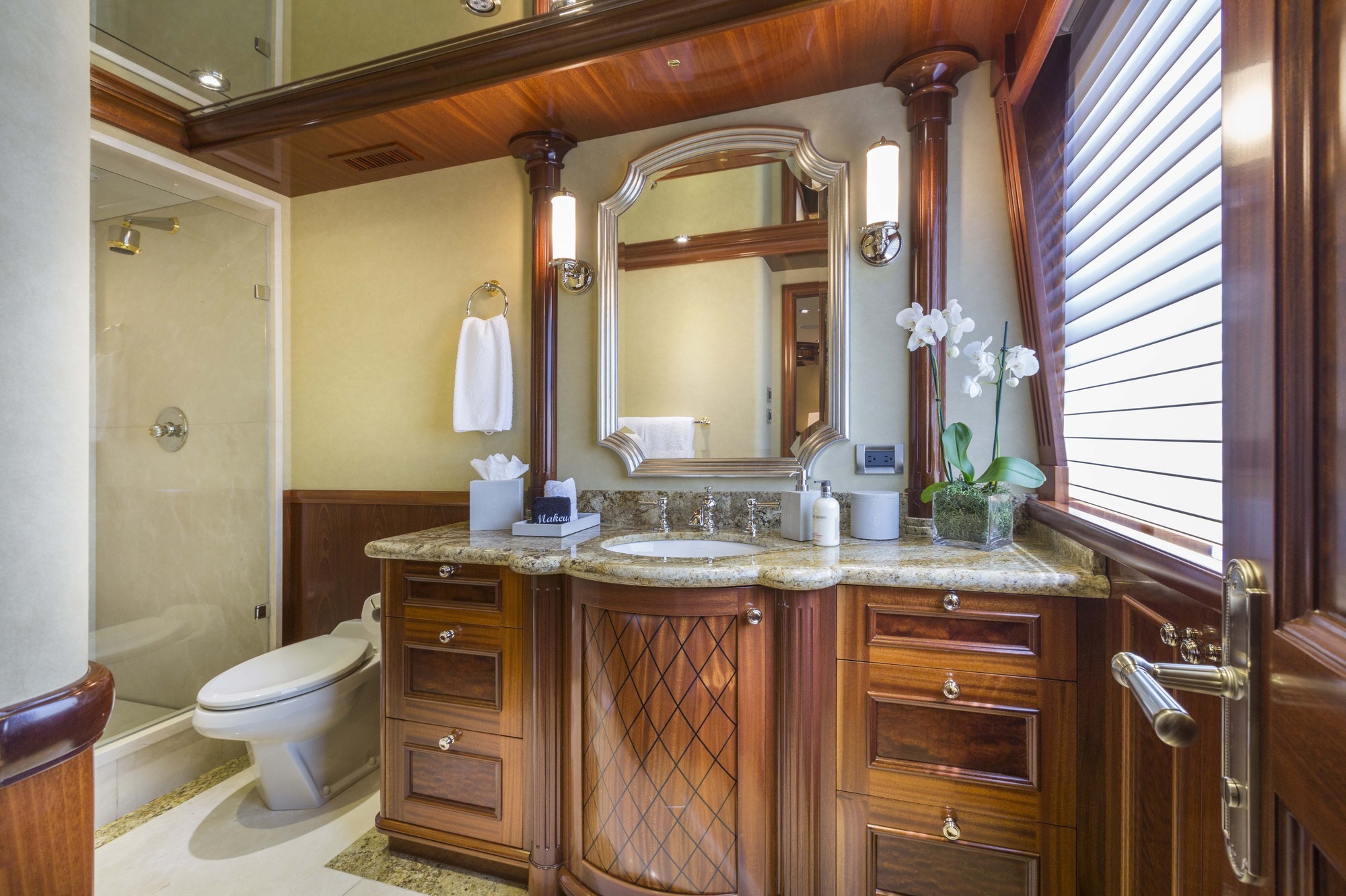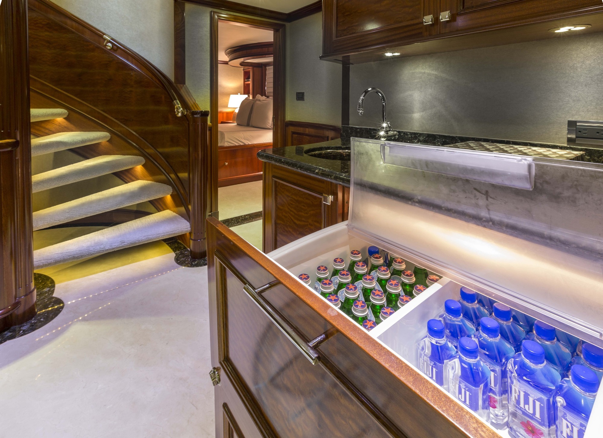 MASTER STATEROOM Forward to starboard on the main deck, past the powder room is the on deck master suite. As you enter the suite, to starboard there is a builtin desk and bookshelf/office area with a TV and a Subzero two drawer refreshment center. Continuing forward you walk into the master stateroom, featuring a center line king size bed with a lounge to starboard and dresser with vanity to port. A full entertainment system is hidden in cabinetry opposite the bed, with a 50” Samsung LCD TV. Forward of the bed are his (starboard) and her (port) bathrooms, his has a dual head steam shower, hers a large Jacuzzi tub and bidet. Both have W.C’s. Both bathrooms have TV’s hidden behind two way mirrors and the port bathroom has an emergency escape for’d, hidden behind another mirror. GUEST STATEROOMS Descending the starboard main foyer stairwell to the lower foyer, there is access to four large guest staterooms. Three staterooms feature Queen size beds, two aft are mirror images, with tub/shower combinations, except for the forward stateroom which features a stall shower. The fourth stateroom features 2 Twin beds, with stall shower. Every stateroom has a beautifully appointed en suite bathroom with slab marble and granite counter tops. The lower foyer also includes a refreshment bar with a Subzero two drawer refrigerator and ice maker. There is a hidden crew door that allows ease of access for the crew into the guest foyer, to service the lower deck with minimal intrusion on the guests. The crew passageway has a watertight door to ensure sound insulation between crew and guest areas.