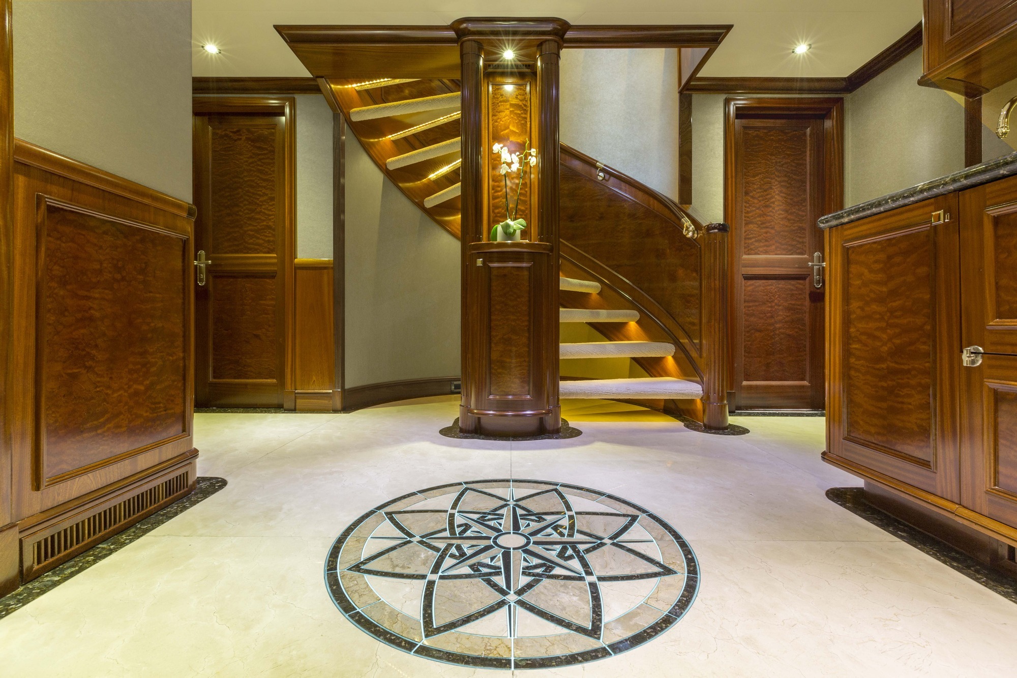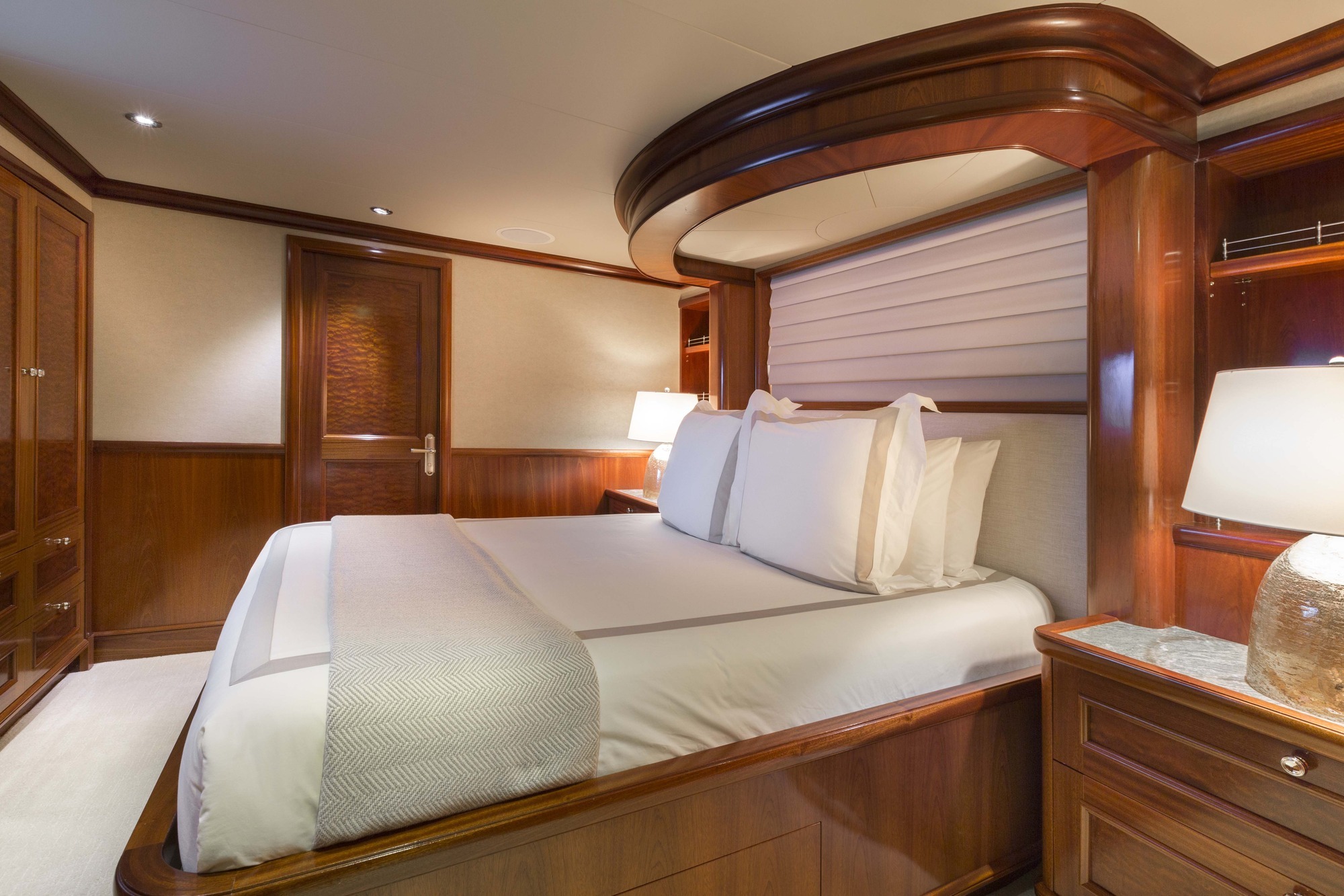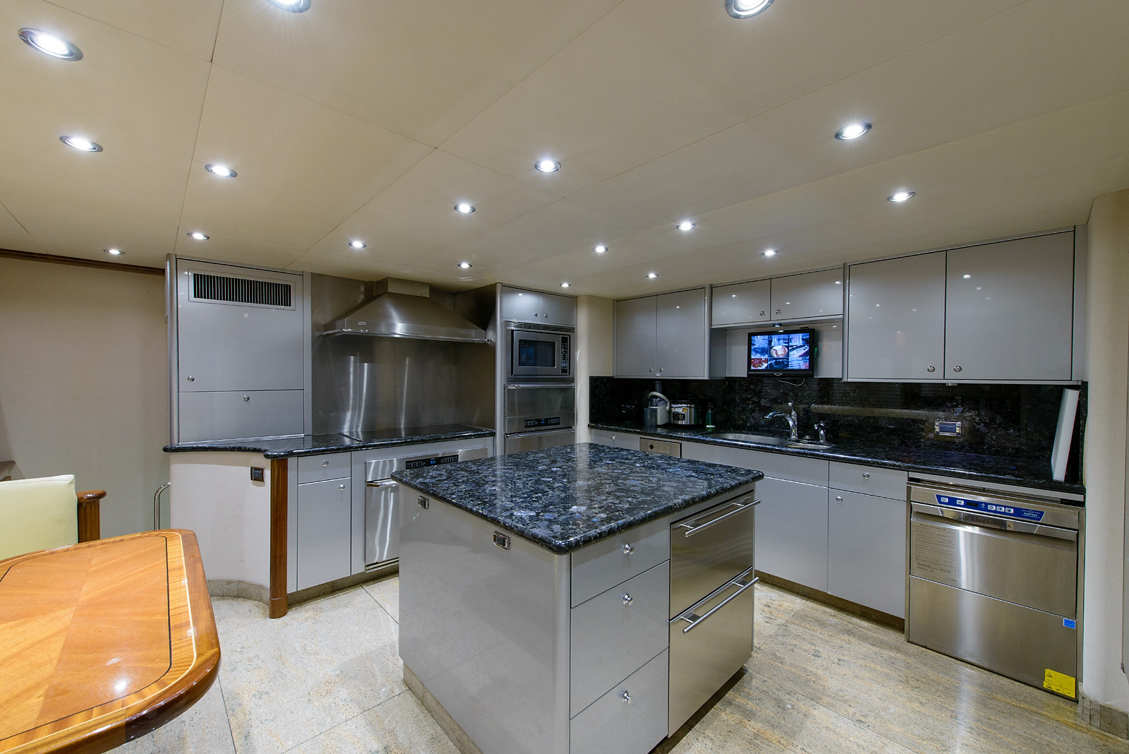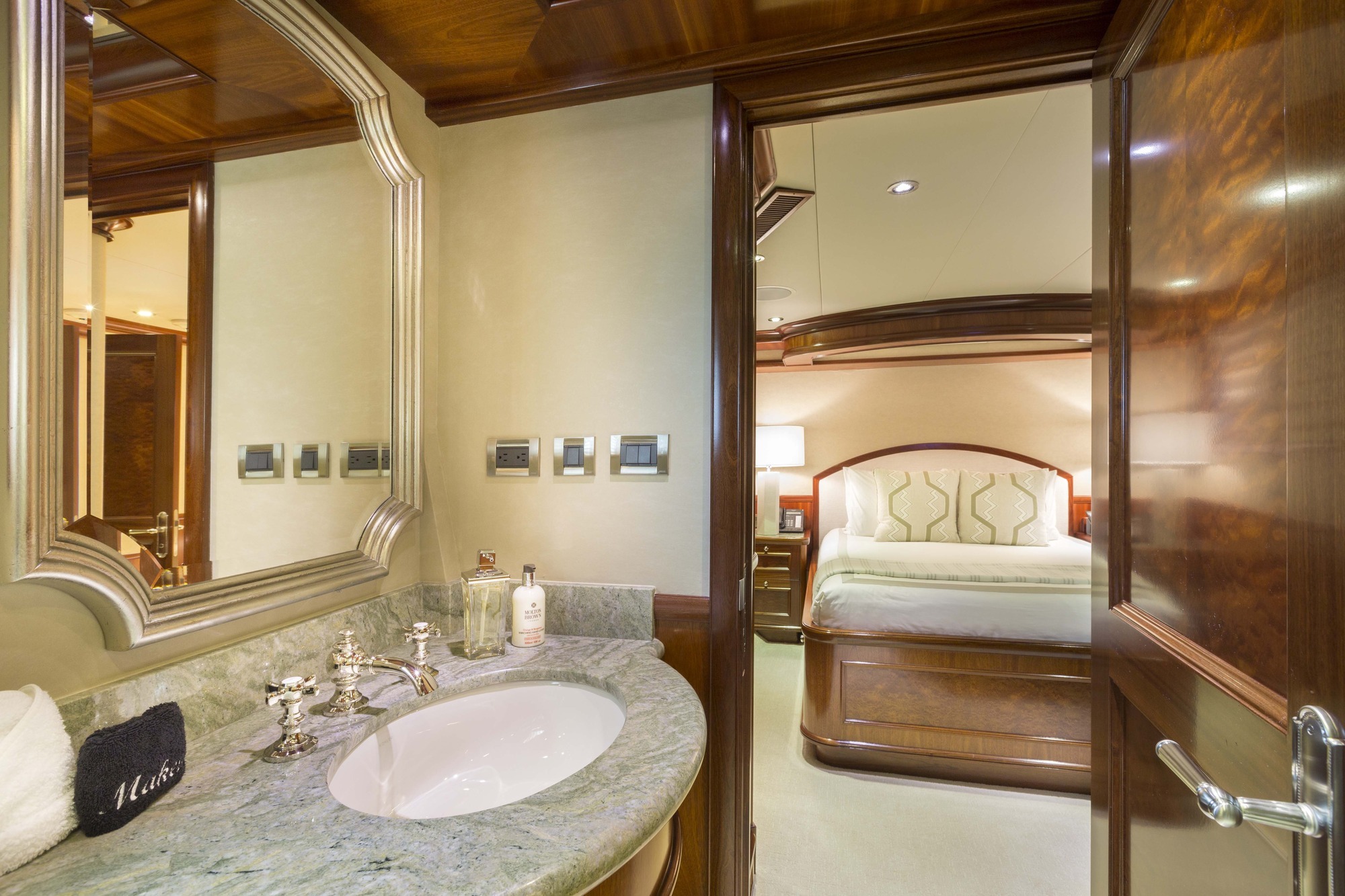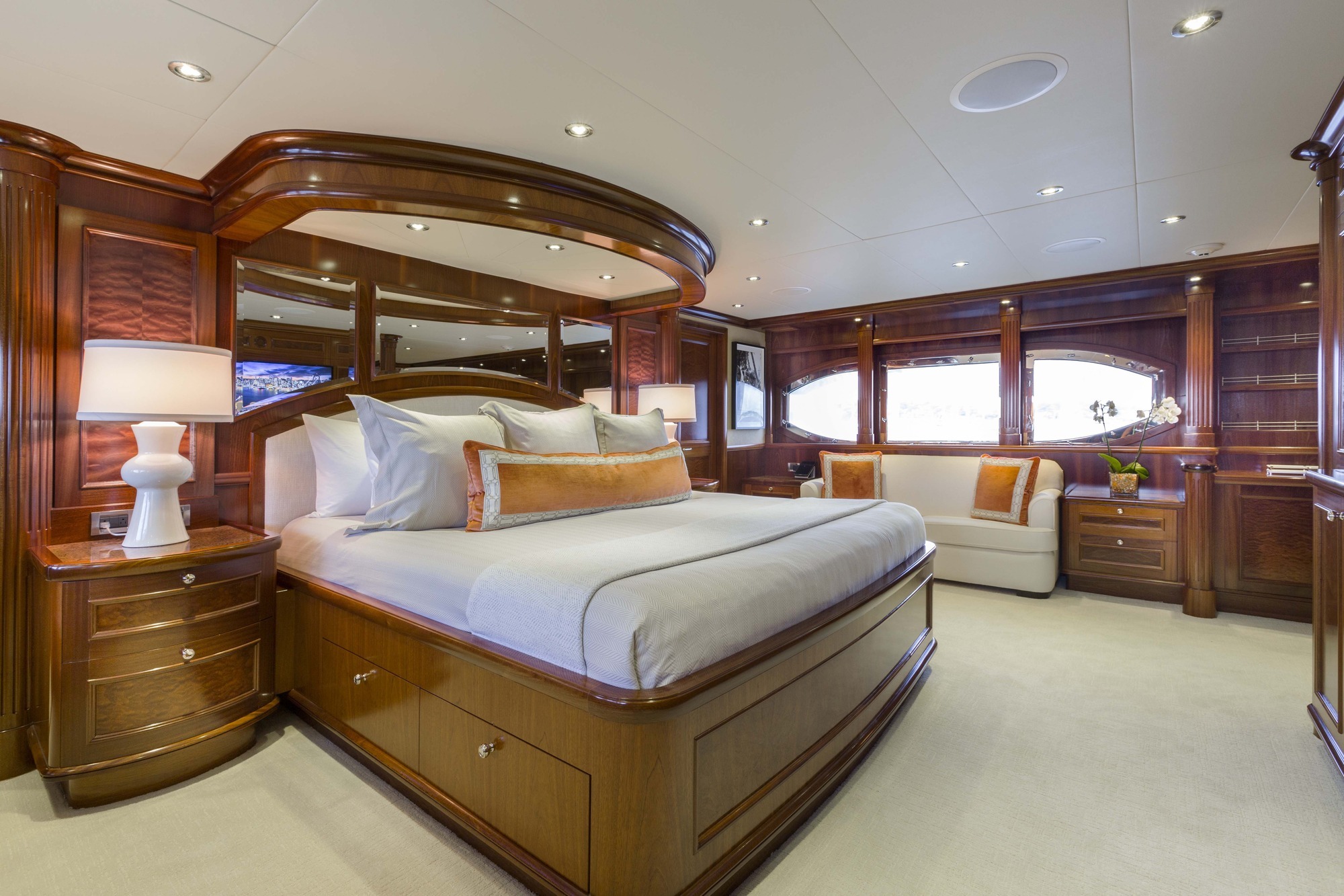 MASTER STATEROOM Forward to starboard on the main deck, past the powder room is the on deck master suite. As you enter the suite, to starboard there is a builtin desk and bookshelf/office area with a TV and a Subzero two drawer refreshment center. Continuing forward you walk into the master stateroom, featuring a center line king size bed with a lounge to starboard and dresser with vanity to port. A full entertainment system is hidden in cabinetry opposite the bed, with a 50” Samsung LCD TV. Forward of the bed are his (starboard) and her (port) bathrooms, his has a dual head steam shower, hers a large Jacuzzi tub and bidet. Both have W.C’s. Both bathrooms have TV’s hidden behind two way mirrors and the port bathroom has an emergency escape for’d, hidden behind another mirror. GUEST STATEROOMS Descending the starboard main foyer stairwell to the lower foyer, there is access to four large guest staterooms. Three staterooms feature Queen size beds, two aft are mirror images, with tub/shower combinations, except for the forward stateroom which features a stall shower. The fourth stateroom features 2 Twin beds, with stall shower. Every stateroom has a beautifully appointed en suite bathroom with slab marble and granite counter tops. The lower foyer also includes a refreshment bar with a Subzero two drawer refrigerator and ice maker. There is a hidden crew door that allows ease of access for the crew into the guest foyer, to service the lower deck with minimal intrusion on the guests. The crew passageway has a watertight door to ensure sound insulation between crew and guest areas.