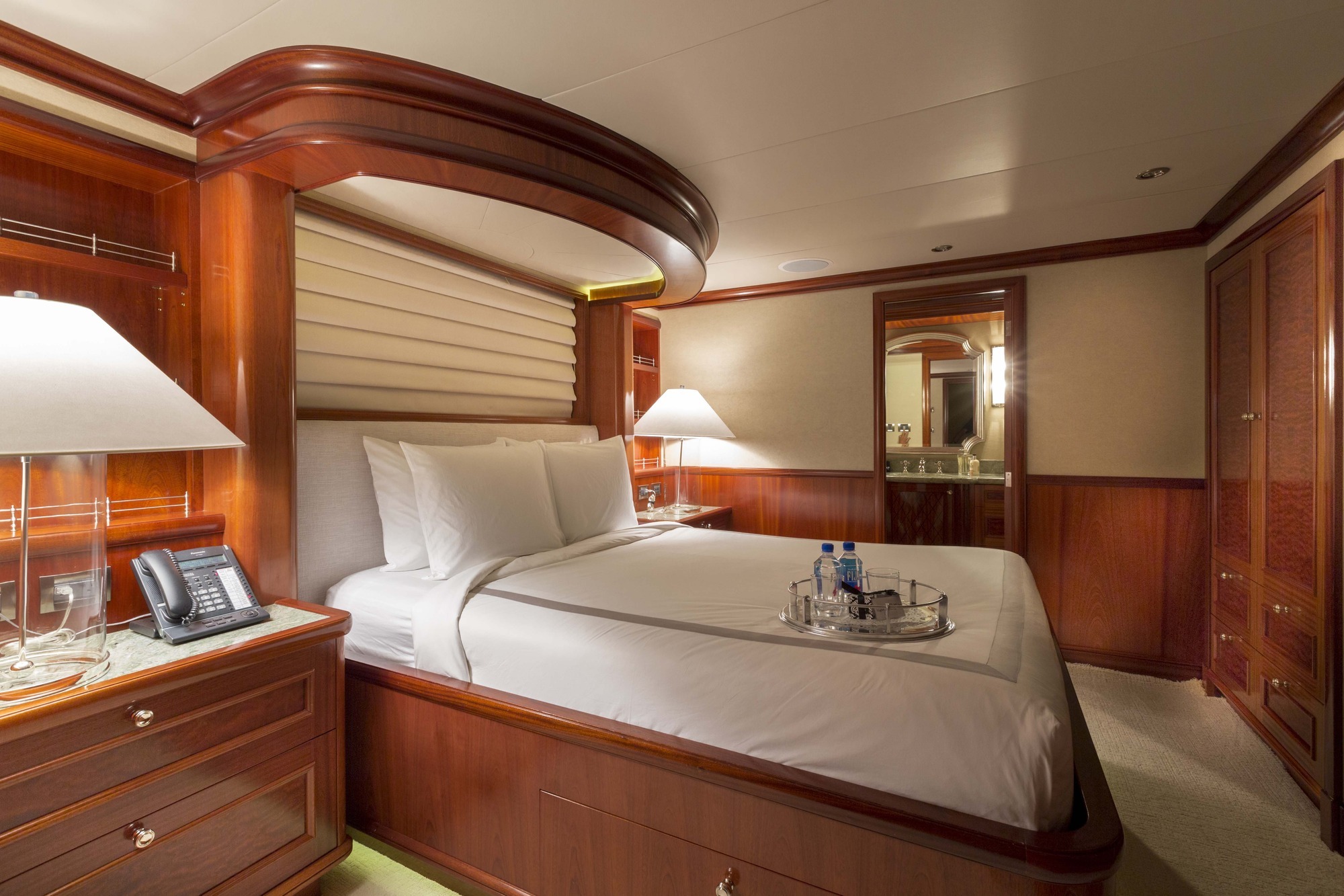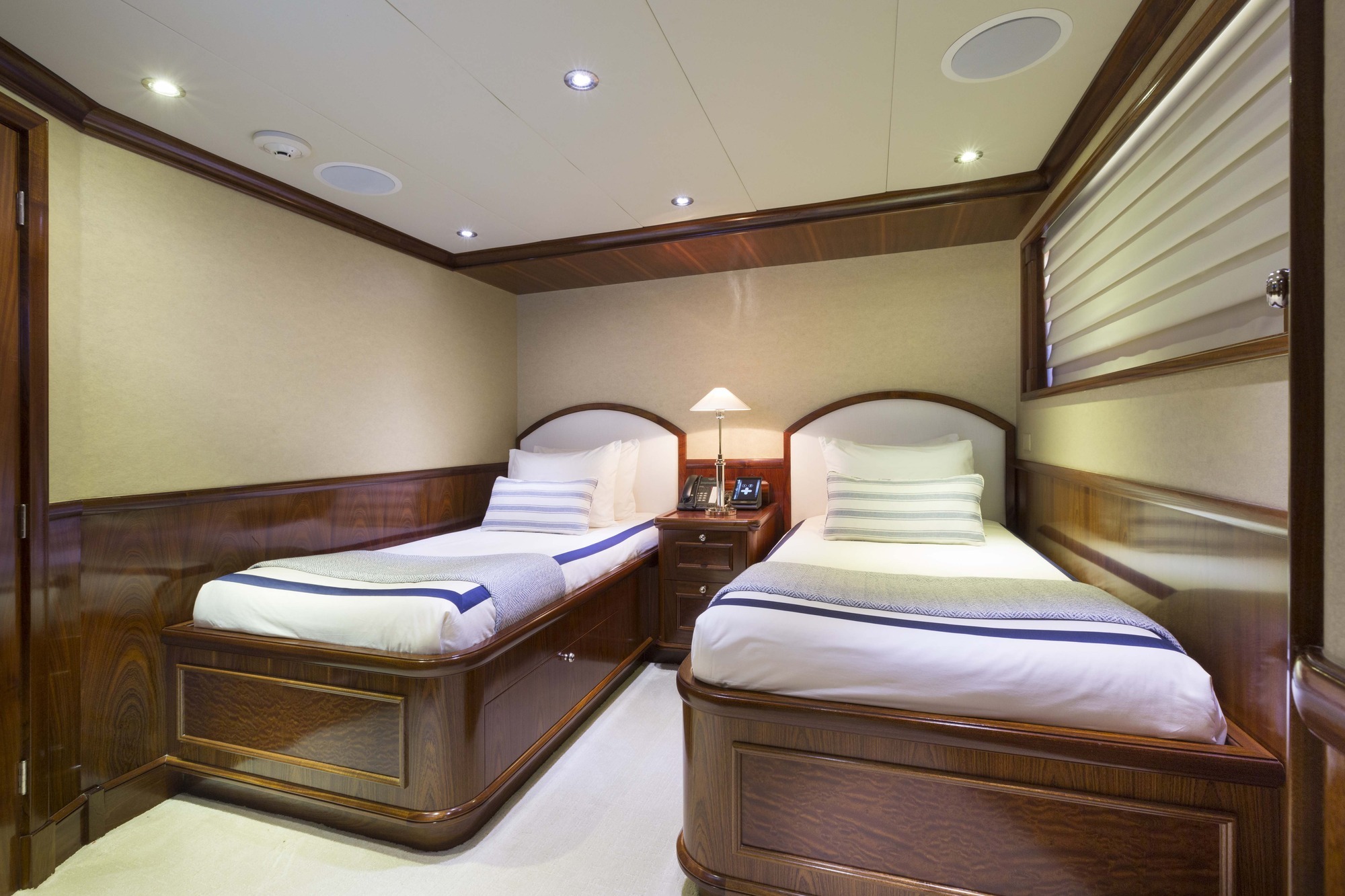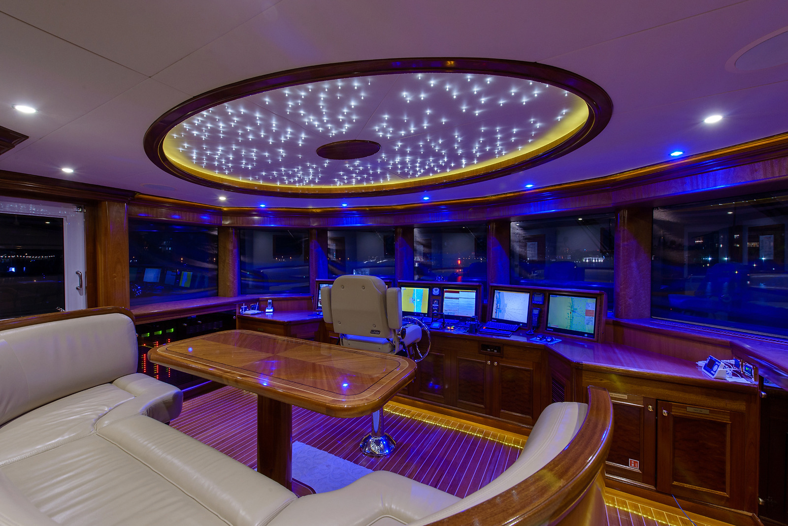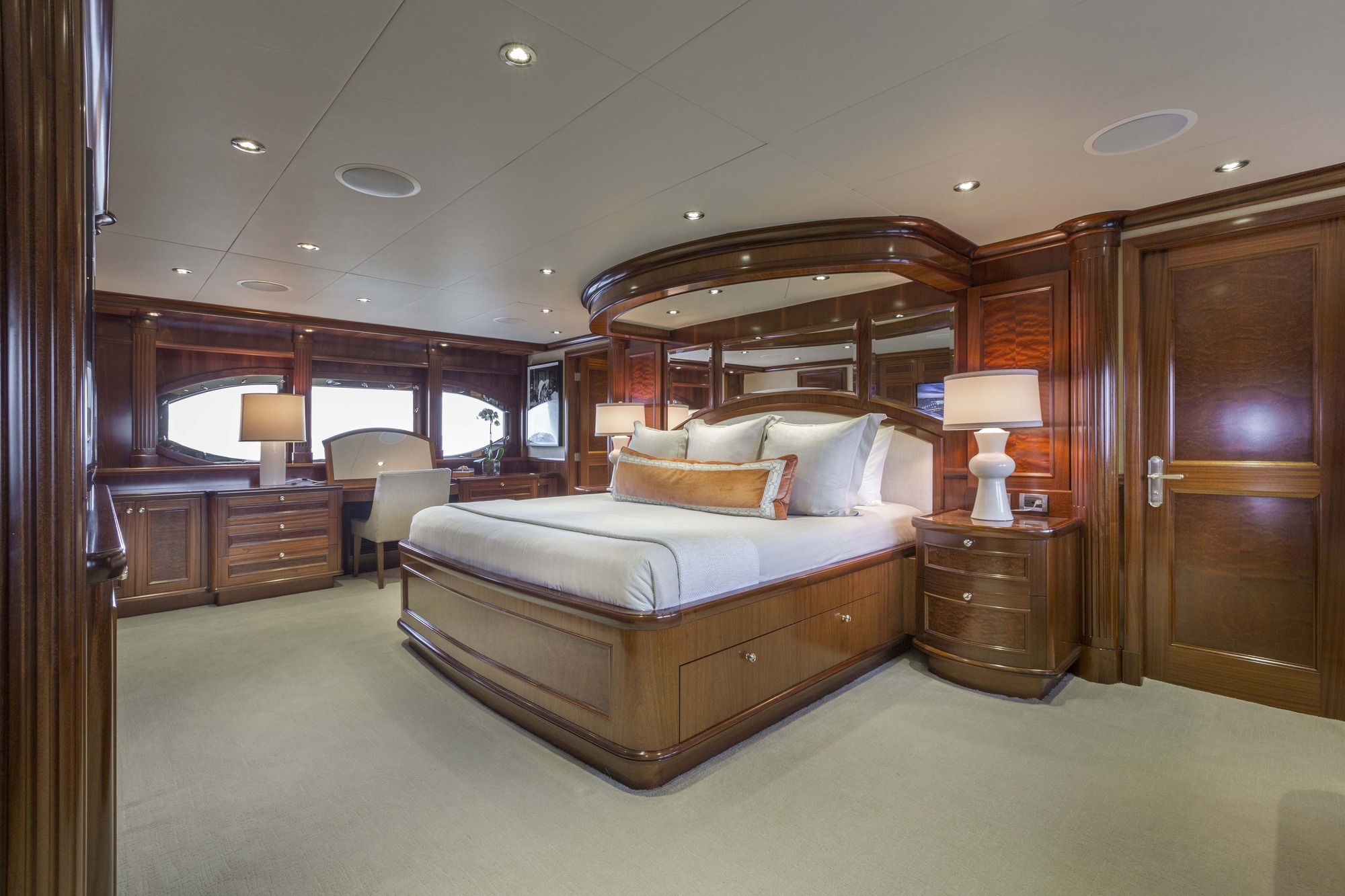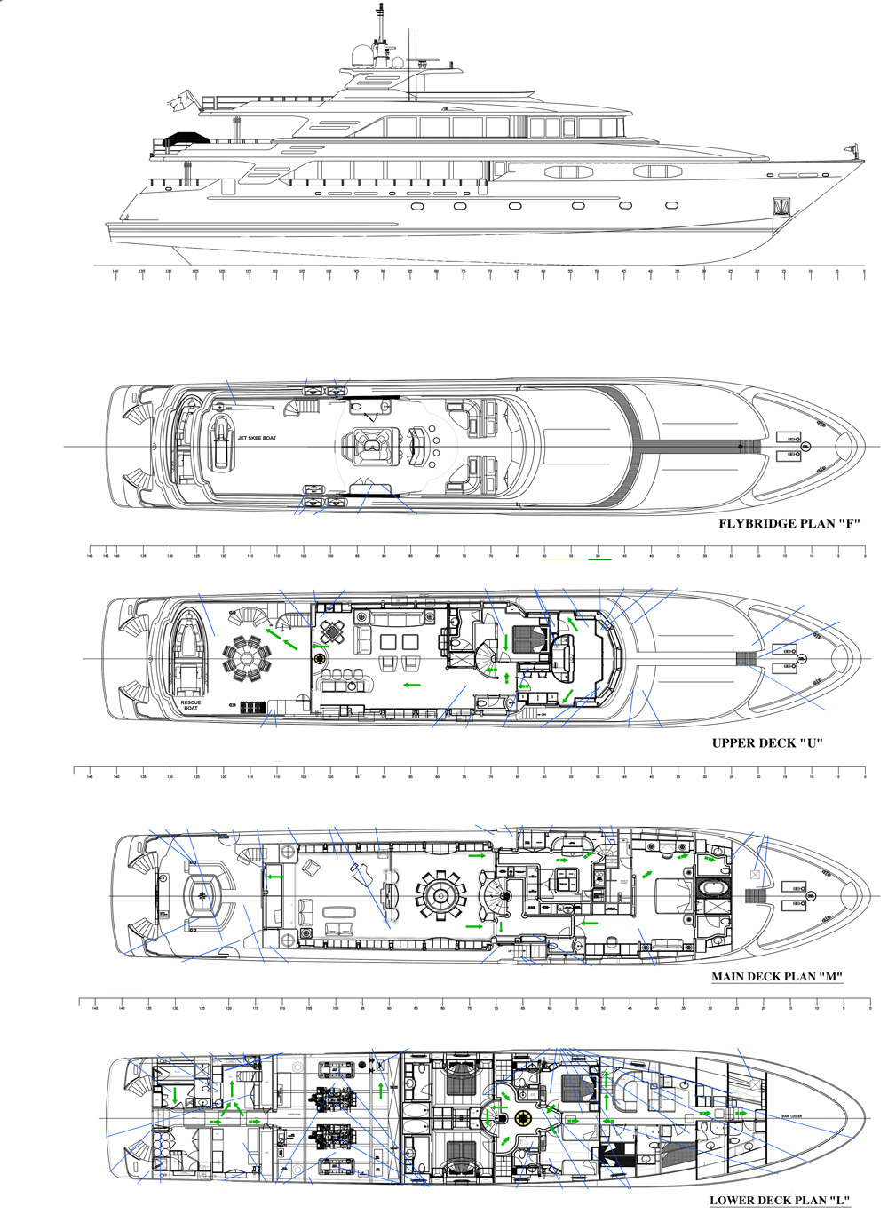 MASTER STATEROOM Forward to starboard on the main deck, past the powder room is the on deck master suite. As you enter the suite, to starboard there is a builtin desk and bookshelf/office area with a TV and a Subzero two drawer refreshment center. Continuing forward you walk into the master stateroom, featuring a center line king size bed with a lounge to starboard and dresser with vanity to port. A full entertainment system is hidden in cabinetry opposite the bed, with a 50” Samsung LCD TV. Forward of the bed are his (starboard) and her (port) bathrooms, his has a dual head steam shower, hers a large Jacuzzi tub and bidet. Both have W.C’s. Both bathrooms have TV’s hidden behind two way mirrors and the port bathroom has an emergency escape for’d, hidden behind another mirror. GUEST STATEROOMS Descending the starboard main foyer stairwell to the lower foyer, there is access to four large guest staterooms. Three staterooms feature Queen size beds, two aft are mirror images, with tub/shower combinations, except for the forward stateroom which features a stall shower. The fourth stateroom features 2 Twin beds, with stall shower. Every stateroom has a beautifully appointed en suite bathroom with slab marble and granite counter tops. The lower foyer also includes a refreshment bar with a Subzero two drawer refrigerator and ice maker. There is a hidden crew door that allows ease of access for the crew into the guest foyer, to service the lower deck with minimal intrusion on the guests. The crew passageway has a watertight door to ensure sound insulation between crew and guest areas.