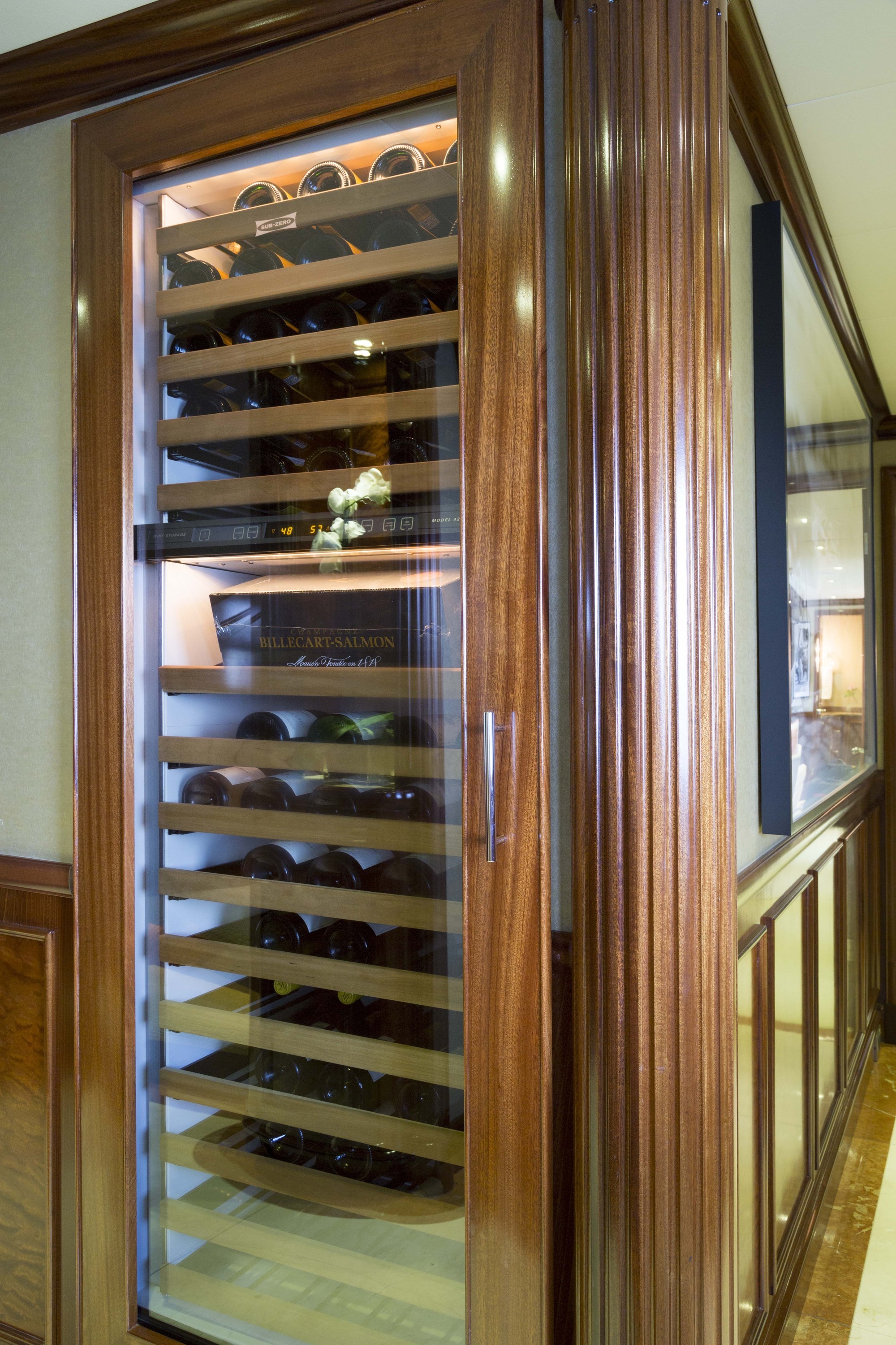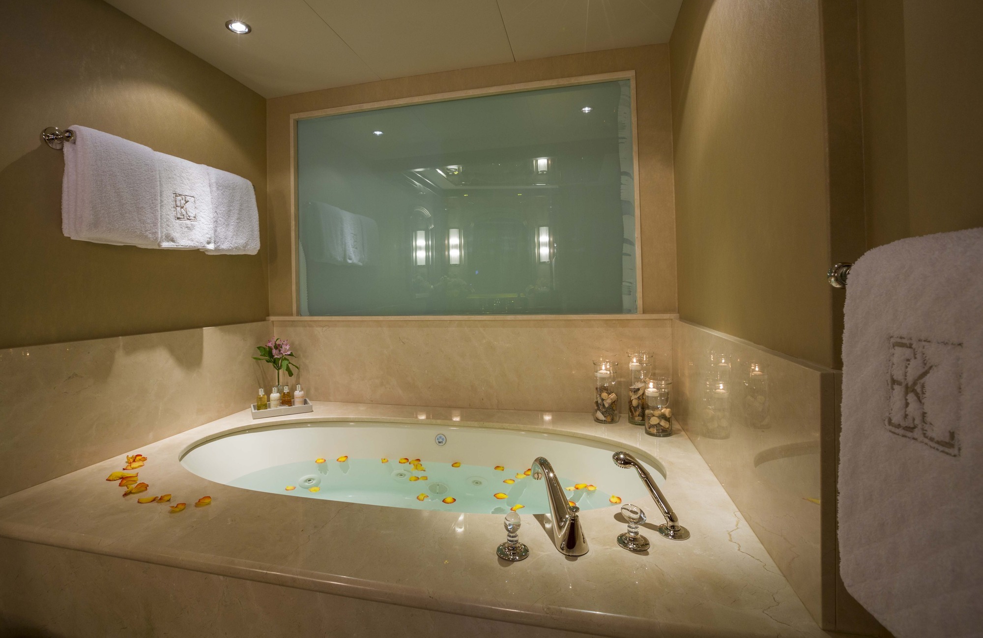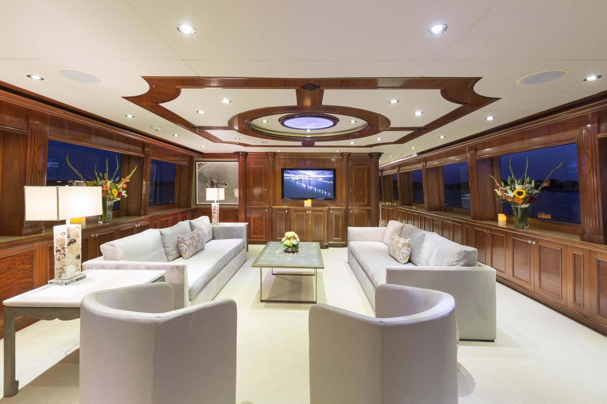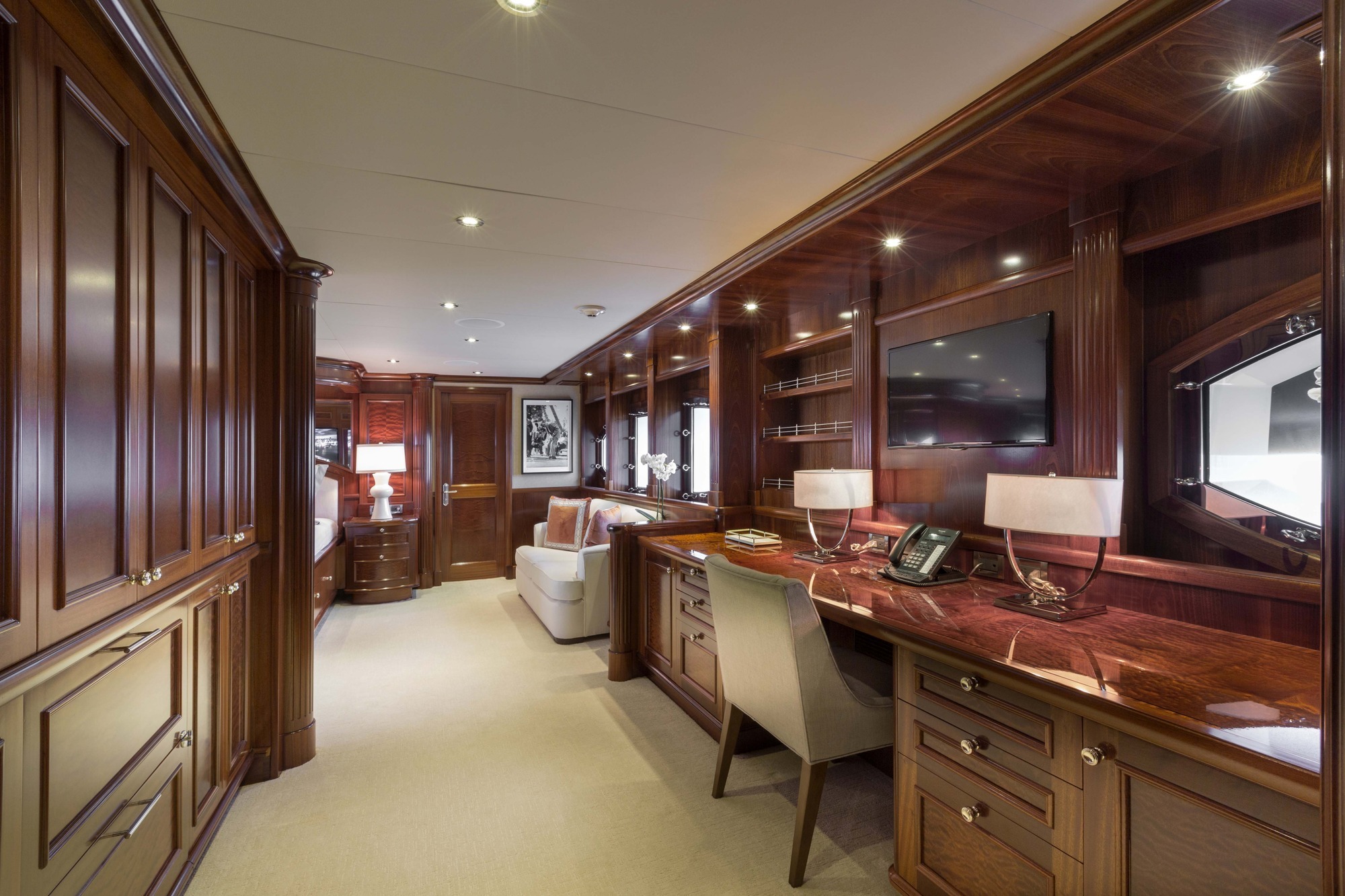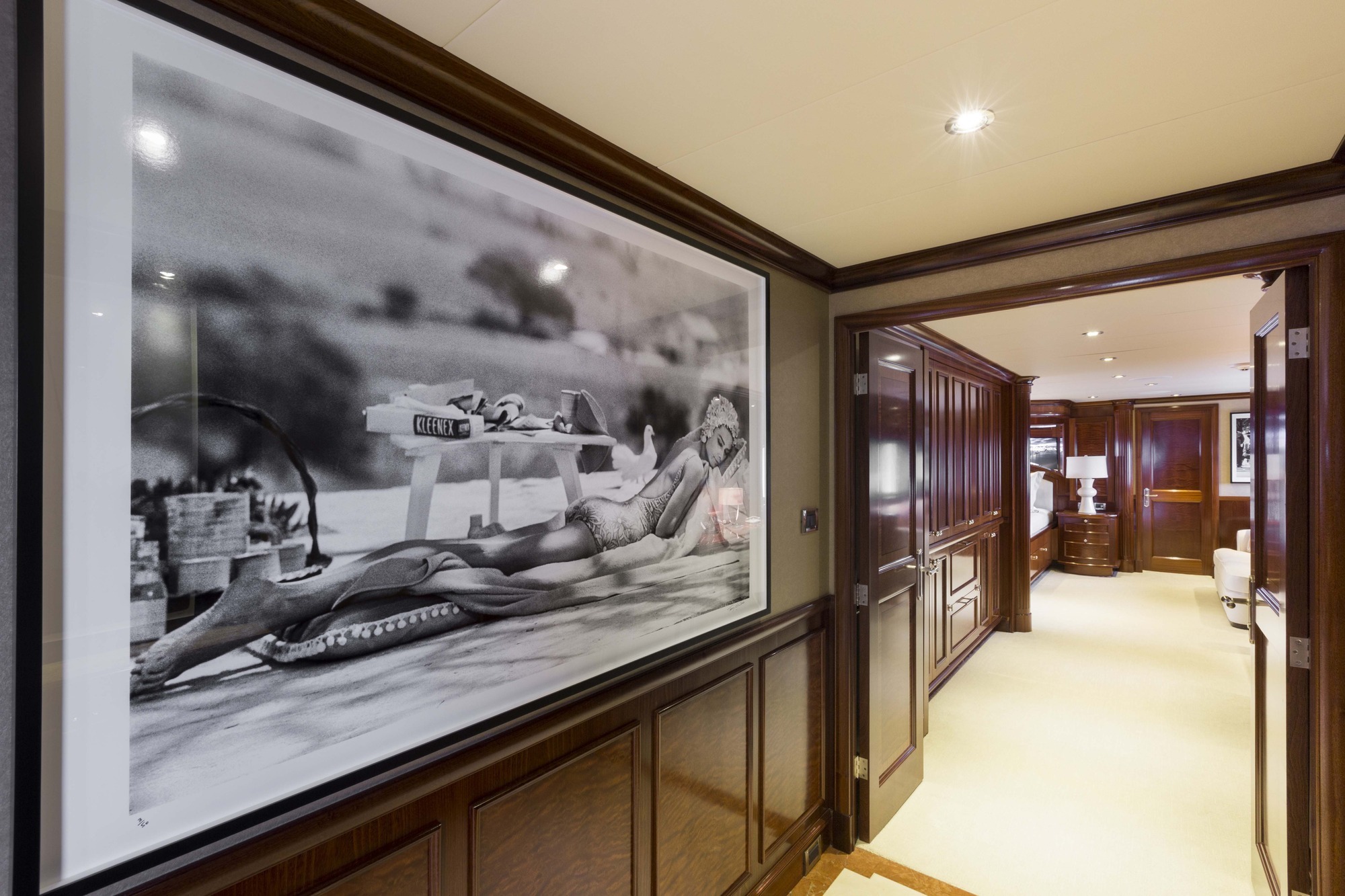 MASTER STATEROOM Forward to starboard on the main deck, past the powder room is the on deck master suite. As you enter the suite, to starboard there is a builtin desk and bookshelf/office area with a TV and a Subzero two drawer refreshment center. Continuing forward you walk into the master stateroom, featuring a center line king size bed with a lounge to starboard and dresser with vanity to port. A full entertainment system is hidden in cabinetry opposite the bed, with a 50” Samsung LCD TV. Forward of the bed are his (starboard) and her (port) bathrooms, his has a dual head steam shower, hers a large Jacuzzi tub and bidet. Both have W.C’s. Both bathrooms have TV’s hidden behind two way mirrors and the port bathroom has an emergency escape for’d, hidden behind another mirror. GUEST STATEROOMS Descending the starboard main foyer stairwell to the lower foyer, there is access to four large guest staterooms. Three staterooms feature Queen size beds, two aft are mirror images, with tub/shower combinations, except for the forward stateroom which features a stall shower. The fourth stateroom features 2 Twin beds, with stall shower. Every stateroom has a beautifully appointed en suite bathroom with slab marble and granite counter tops. The lower foyer also includes a refreshment bar with a Subzero two drawer refrigerator and ice maker. There is a hidden crew door that allows ease of access for the crew into the guest foyer, to service the lower deck with minimal intrusion on the guests. The crew passageway has a watertight door to ensure sound insulation between crew and guest areas.