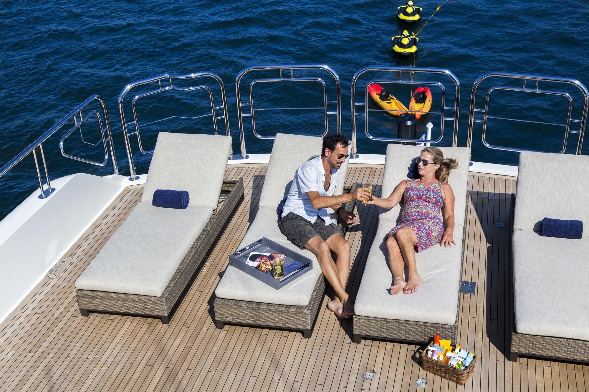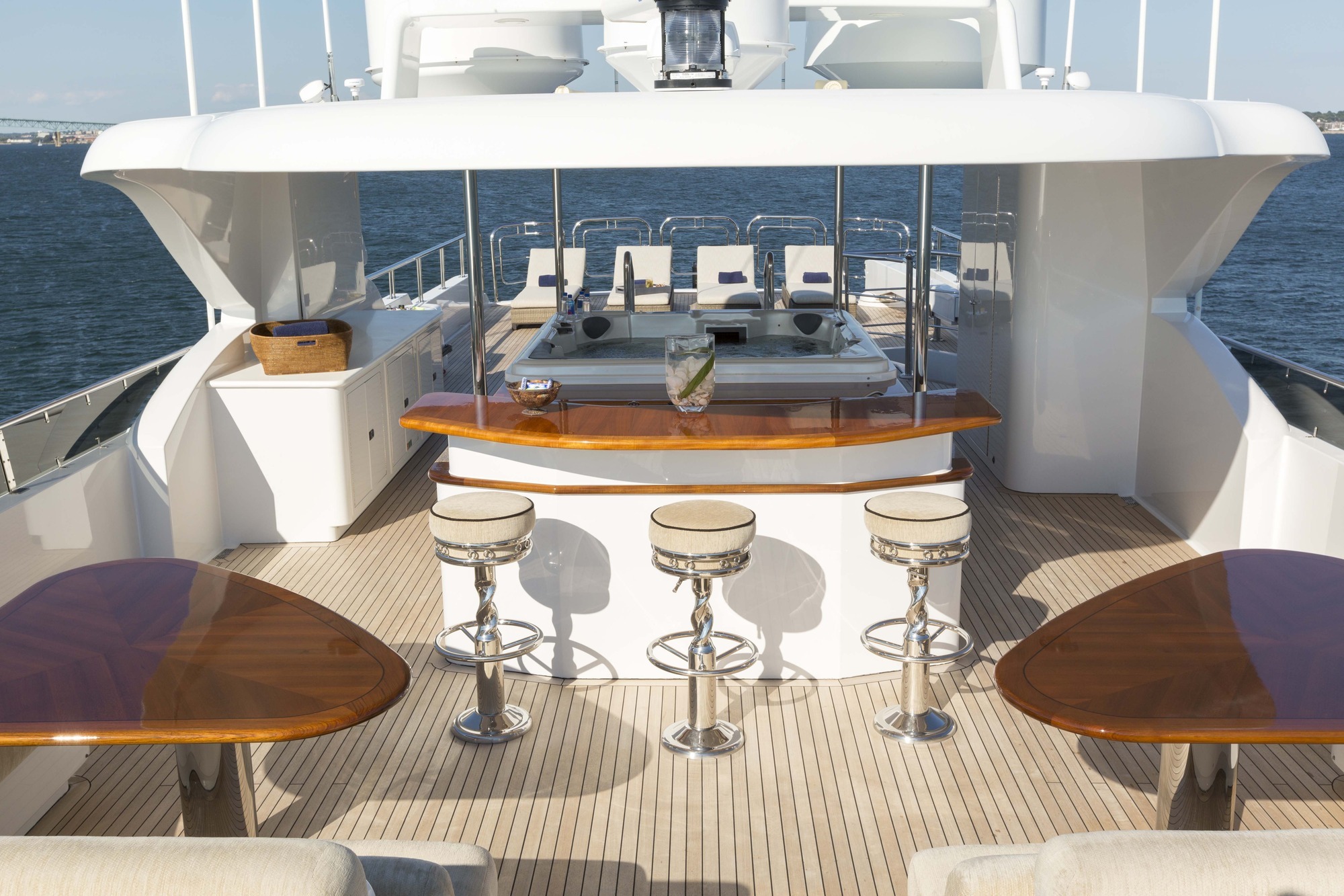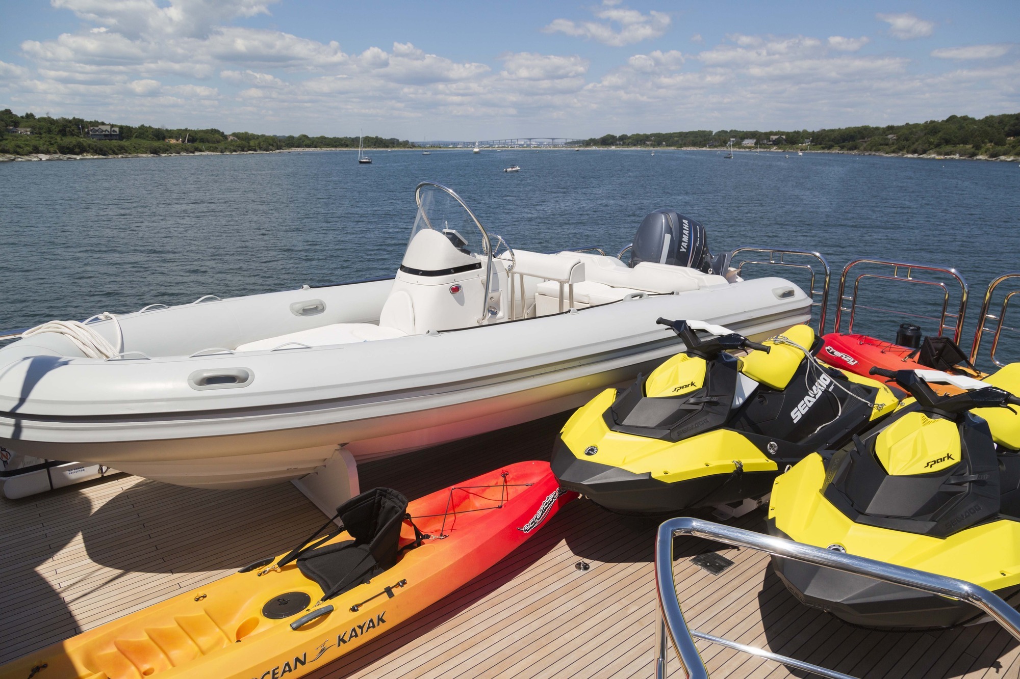 Tenders & Toys: 33' Boston Whaler (NEW 2017) 18' (5.7m) RIB with 115 hp Yamaha (2) SeaDoo Spark Wave runners (2) SeaBobs (2) Paddleboards (2) Wakeboards (men and women) (2) Kayaks - one person each Water skis Floating trampoline Dive compressor Snorkel gear Towable Toys Audio Visual Equipment and Deck Facilities: All new AV equipment.SONAS music system and Apple TV throughout the vessel. Every cabin has a TV, including, aft deck, upper aft deck, sky lounge and salon.