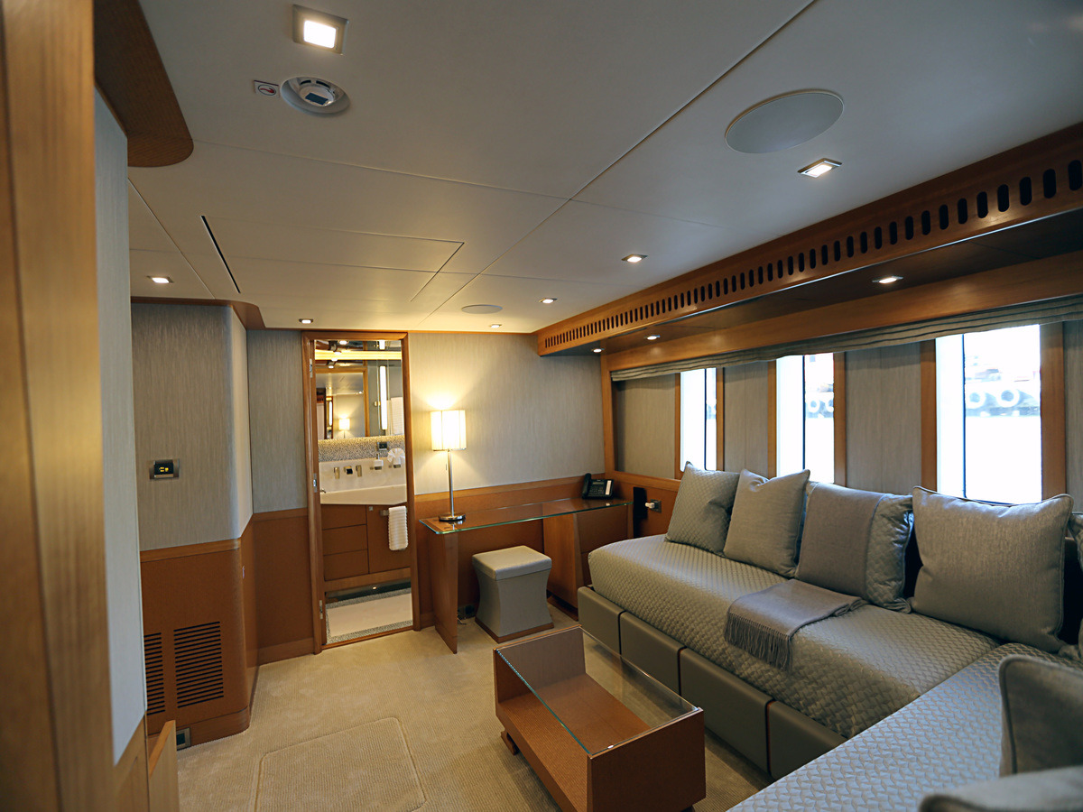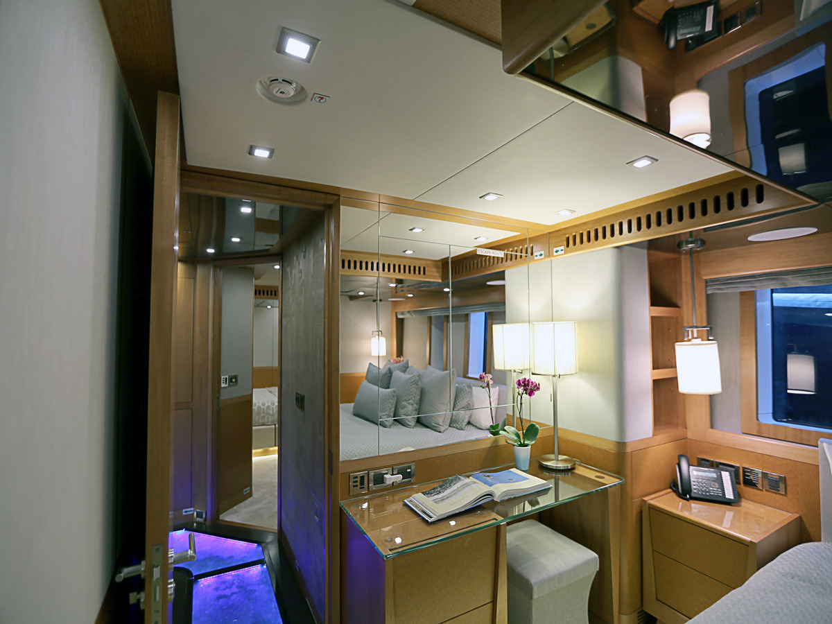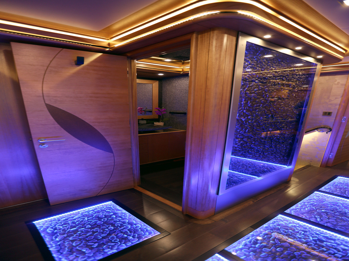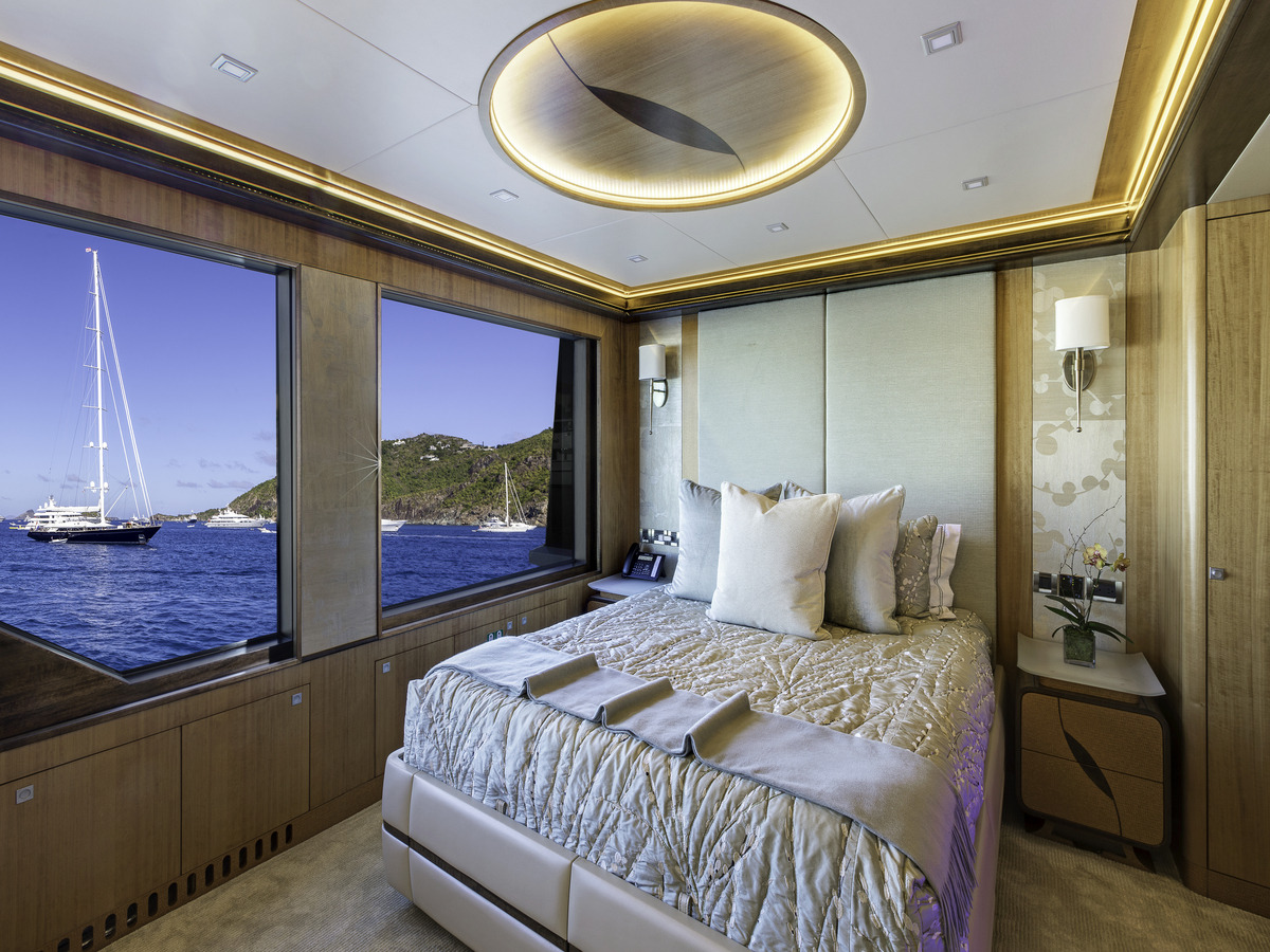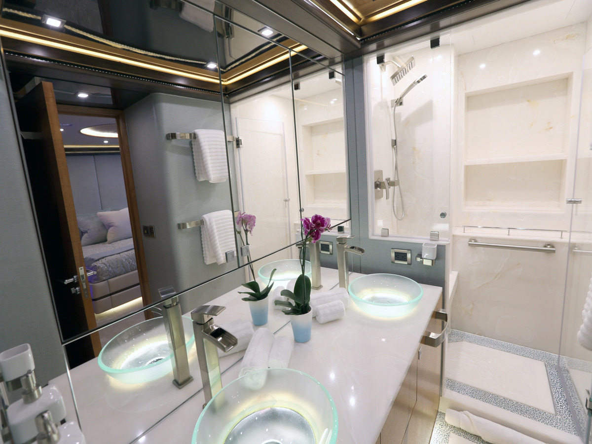 All accommodations are equipped with: TV, iPads, individual climate control, individual satellite receivers, complete blackout, iPod docking stations, reading lights, robes, slippers, hair-dryers, telephone, safe and Wi-Fi access. SERENITY is equipped with an elevator from below desk accommodations to the sun deck. MASTER STATEROOM SUITE The Master Stateroom is situated forward on the Main Deck measuring approximately 900 sq. ft. and features a “Terrazza” outdoor balcony on the starboard side. Upon entry a sitting table for 2 is located to starboard and can be closed off for private service. This stateroom also offers a walk-around King bed, 52” flat screen TV, surround sound, a vanity on Port side, and a safe. Forward guests can access the en-suite bath – His & Hers side with a large European rainfall shower in the center, 2 sinks, toilet, and bidet. The entire Master suite features oversized windows offering plenty of natural light with stunning views. BELOW DECK: Access to the 5 below guest staterooms is lead by a braided leather spiral stairwell. SERENITY's exquisitely decorated staterooms are positioned at water level offering tranquil views. Ample locker/storage space can be found in all guest staterooms. GUEST STATEROOM #1 Features a walk around Queen size bed, 52” flat screen TV. The en-suite bath features a large rainfall shower with a 2ft. bench, 2 sinks, and a toilet. This stateroom can also be converted into an en-suite full width lounge with #2 stateroom. GUEST STATEROOM #2 Features Twin beds which can convert to a queen and features a 48” flat screen TV. The en-suite bath features a large rainfall shower with a 2ft. bench, 2 sinks, and a toilet. This stateroom can also be converted into an en-suite full width lounge with stateroom #1. GUEST STATEROOM #3 Features a walk around Queen size bed and 48” flat screen TV. The en-suite bath features a large rainfall shower with a 2ft. bench, 2 sinks, and a toilet. GUEST STATEROOM #4 Features a walk around Queen size bed and 48” flat screen TV. The en-suite bath features a large rainfall shower with a 2ft. bench, 2 sinks, and a toilet. VIP #6 STATEROOM ON SKYLOUNGE DECK: Features a walk around Queen size bed and a 48” flat screen TV. The en-suite bath features a large rain shower with a 2ft. bench.