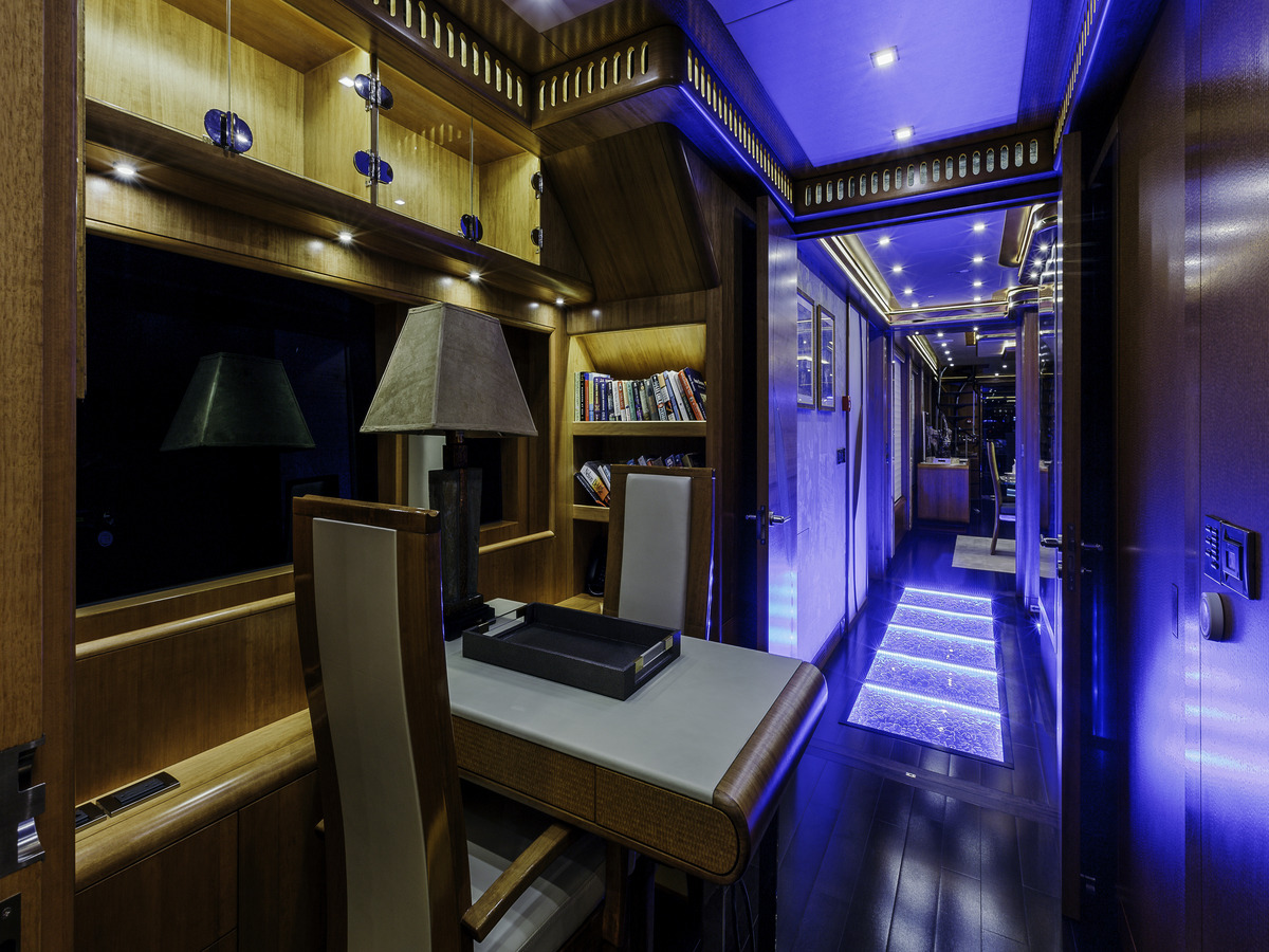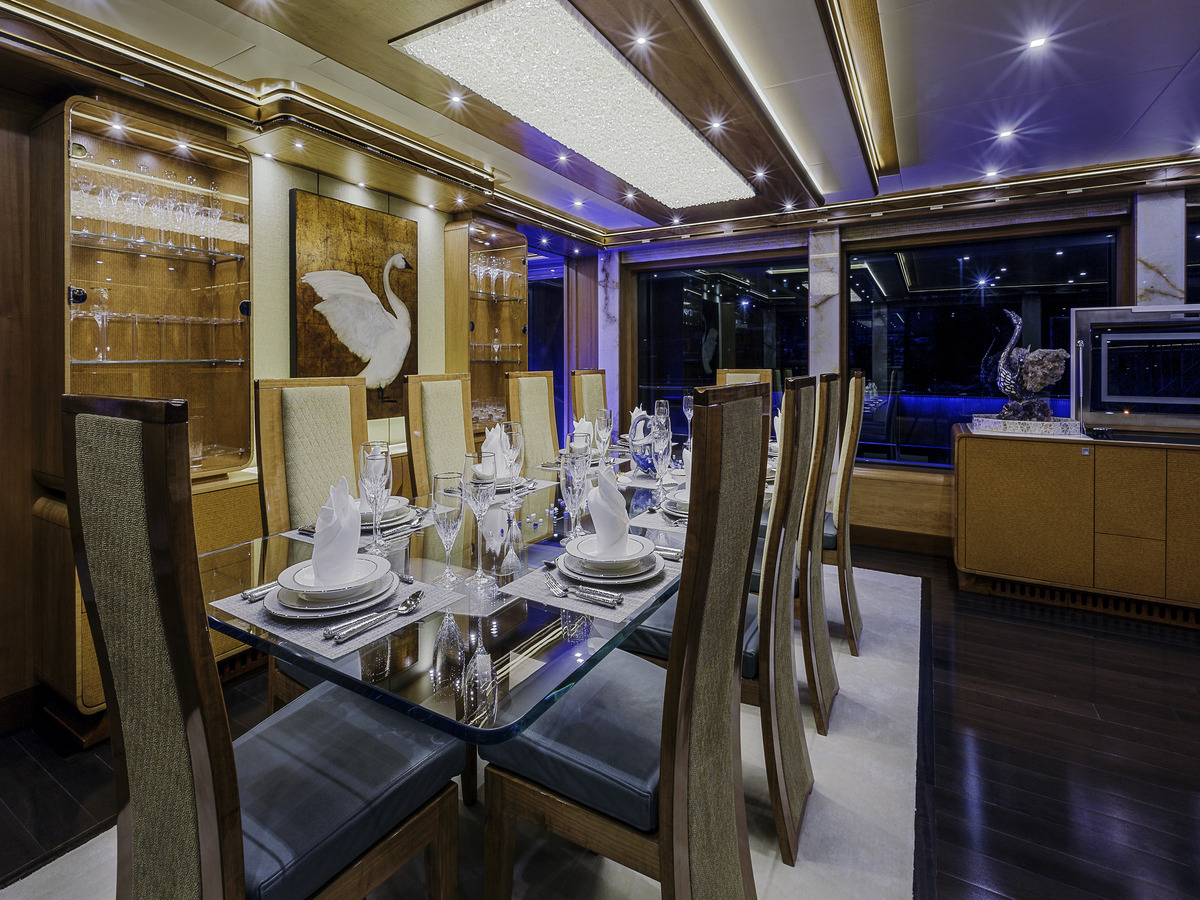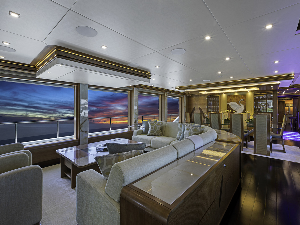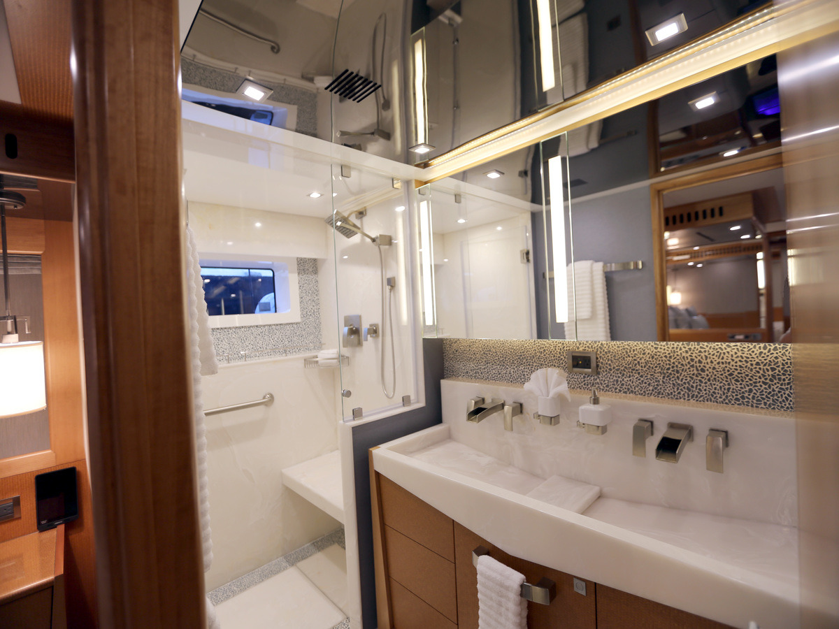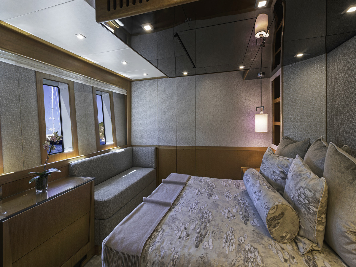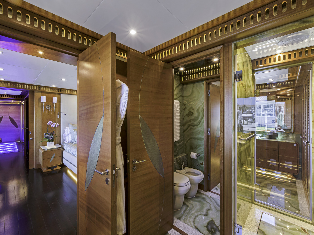 All accommodations are equipped with: TV, iPads, individual climate control, individual satellite receivers, complete blackout, iPod docking stations, reading lights, robes, slippers, hair-dryers, telephone, safe and Wi-Fi access. SERENITY is equipped with an elevator from below desk accommodations to the sun deck. MASTER STATEROOM SUITE The Master Stateroom is situated forward on the Main Deck measuring approximately 900 sq. ft. and features a “Terrazza” outdoor balcony on the starboard side. Upon entry a sitting table for 2 is located to starboard and can be closed off for private service. This stateroom also offers a walk-around King bed, 52” flat screen TV, surround sound, a vanity on Port side, and a safe. Forward guests can access the en-suite bath – His & Hers side with a large European rainfall shower in the center, 2 sinks, toilet, and bidet. The entire Master suite features oversized windows offering plenty of natural light with stunning views. BELOW DECK: Access to the 5 below guest staterooms is lead by a braided leather spiral stairwell. SERENITY's exquisitely decorated staterooms are positioned at water level offering tranquil views. Ample locker/storage space can be found in all guest staterooms. GUEST STATEROOM #1 Features a walk around Queen size bed, 52” flat screen TV. The en-suite bath features a large rainfall shower with a 2ft. bench, 2 sinks, and a toilet. This stateroom can also be converted into an en-suite full width lounge with #2 stateroom. GUEST STATEROOM #2 Features Twin beds which can convert to a queen and features a 48” flat screen TV. The en-suite bath features a large rainfall shower with a 2ft. bench, 2 sinks, and a toilet. This stateroom can also be converted into an en-suite full width lounge with stateroom #1. GUEST STATEROOM #3 Features a walk around Queen size bed and 48” flat screen TV. The en-suite bath features a large rainfall shower with a 2ft. bench, 2 sinks, and a toilet. GUEST STATEROOM #4 Features a walk around Queen size bed and 48” flat screen TV. The en-suite bath features a large rainfall shower with a 2ft. bench, 2 sinks, and a toilet. VIP #6 STATEROOM ON SKYLOUNGE DECK: Features a walk around Queen size bed and a 48” flat screen TV. The en-suite bath features a large rain shower with a 2ft. bench.