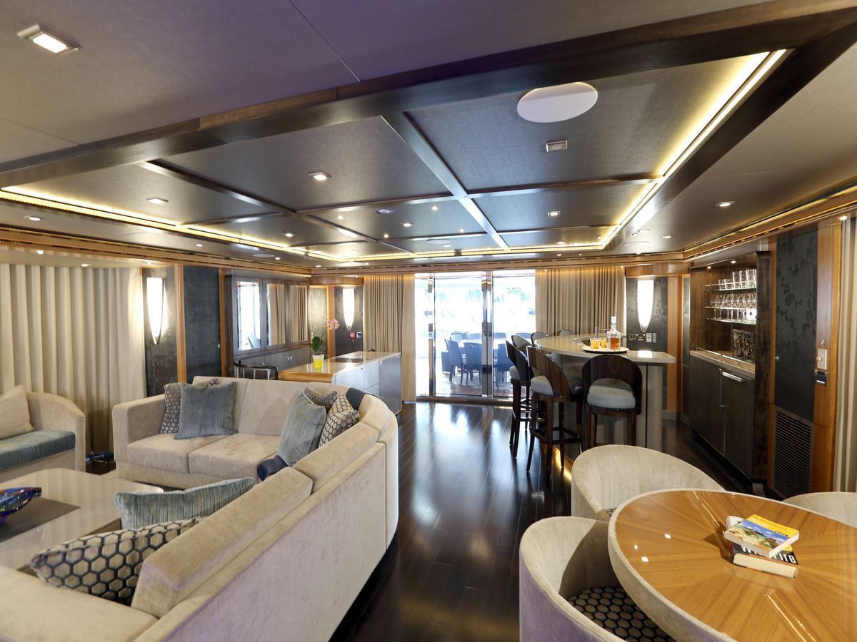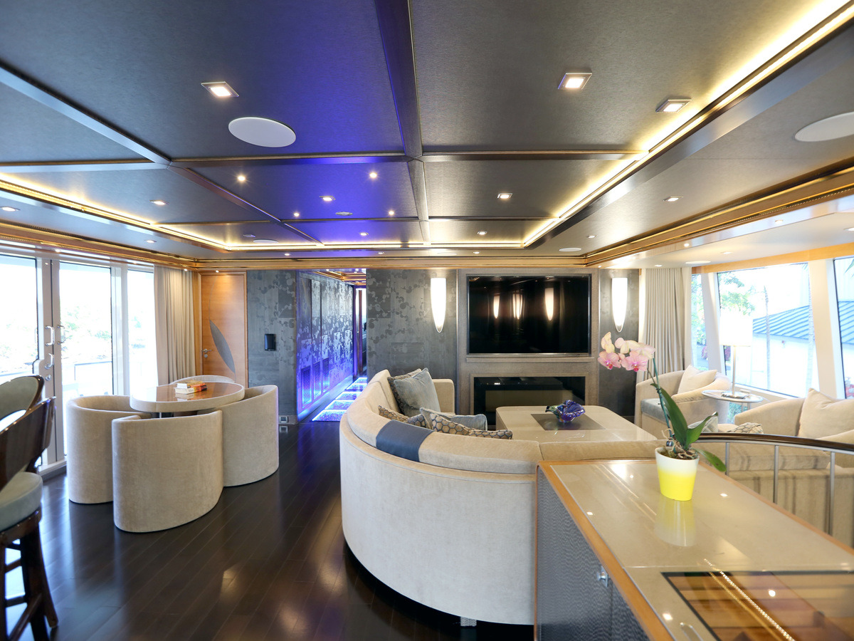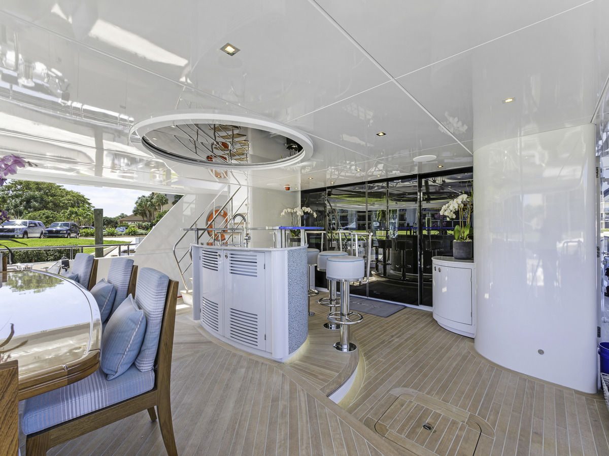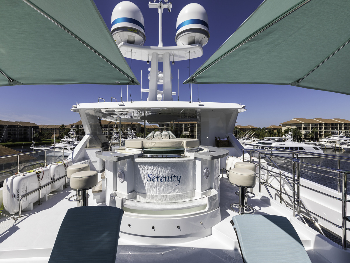 Serenity was created by Evan K. Marshall (EKM) design for charter or private use. She is a spectacular Tri-Deck Motor Yacht, the latest in EKM design. The systems are top brand US purchased for good service. Her fit and finish are sure to impress the most discriminating yacht connoisseur. Major highlights include an interior 4-Level elevator, floor to ceiling windows, multiple balconies (Salon, Master, and Skylounge), light box flooring, backlit onyx, and multiple entertaining spaces and private areas for 12 guests. A spectacular waterfall jacuzzi on the Flybridge and wading pool with backlit skylights showing through the ceiling of the 01 deck are designs unique to Serenity. Garage/Beach with exclusive Z-Lift Sytem that creates a perfect underwater beach allowing easier egress from the water for divers or swimmers. It may double as a passerelle or be conveniently stored creating a regular swim platform.