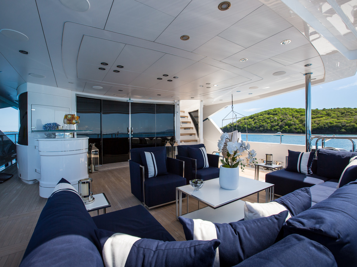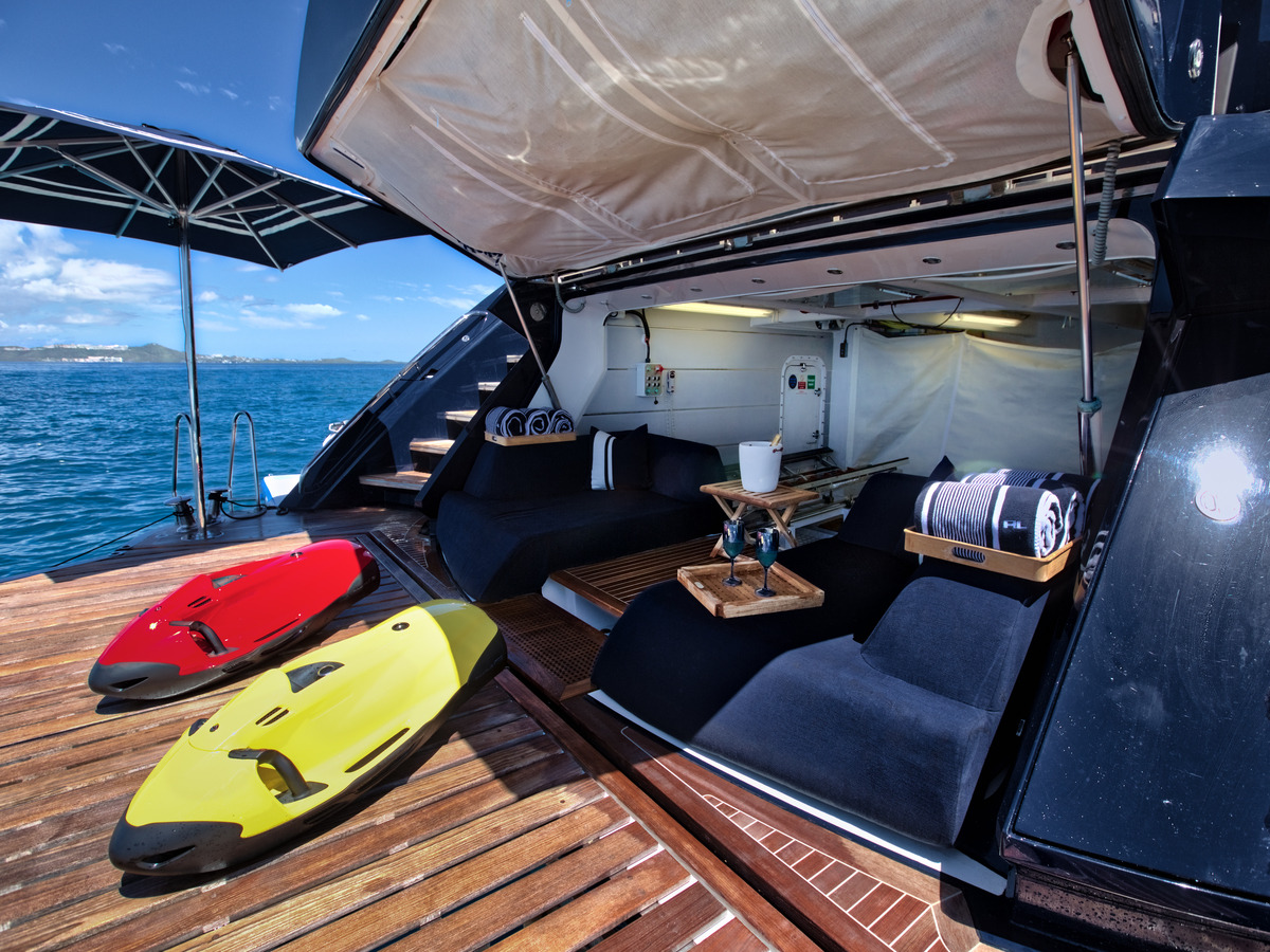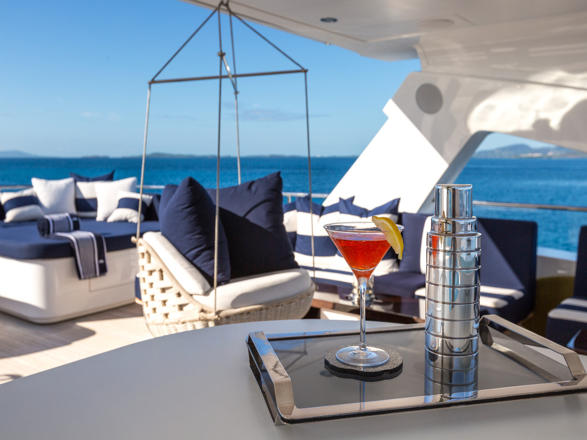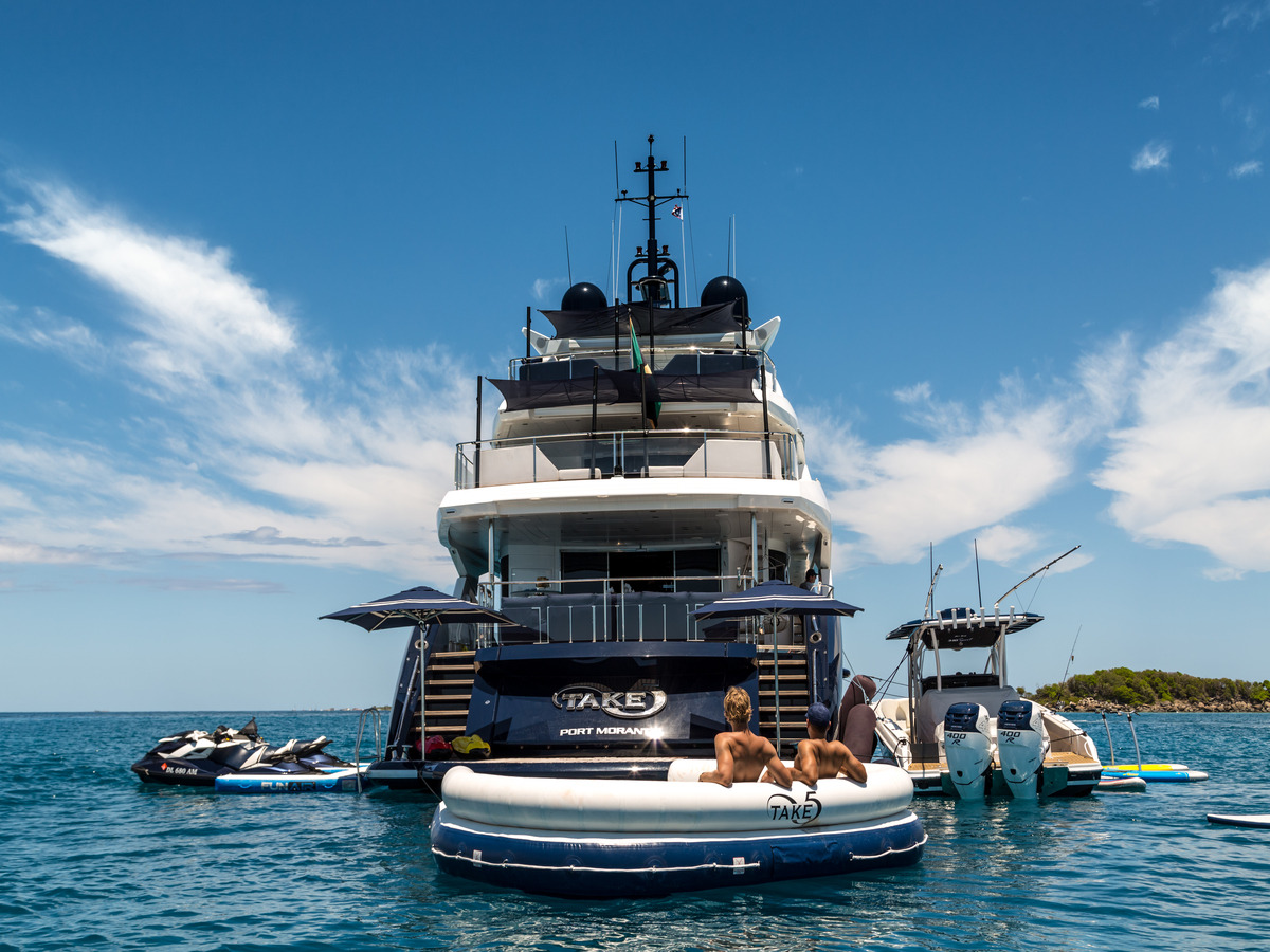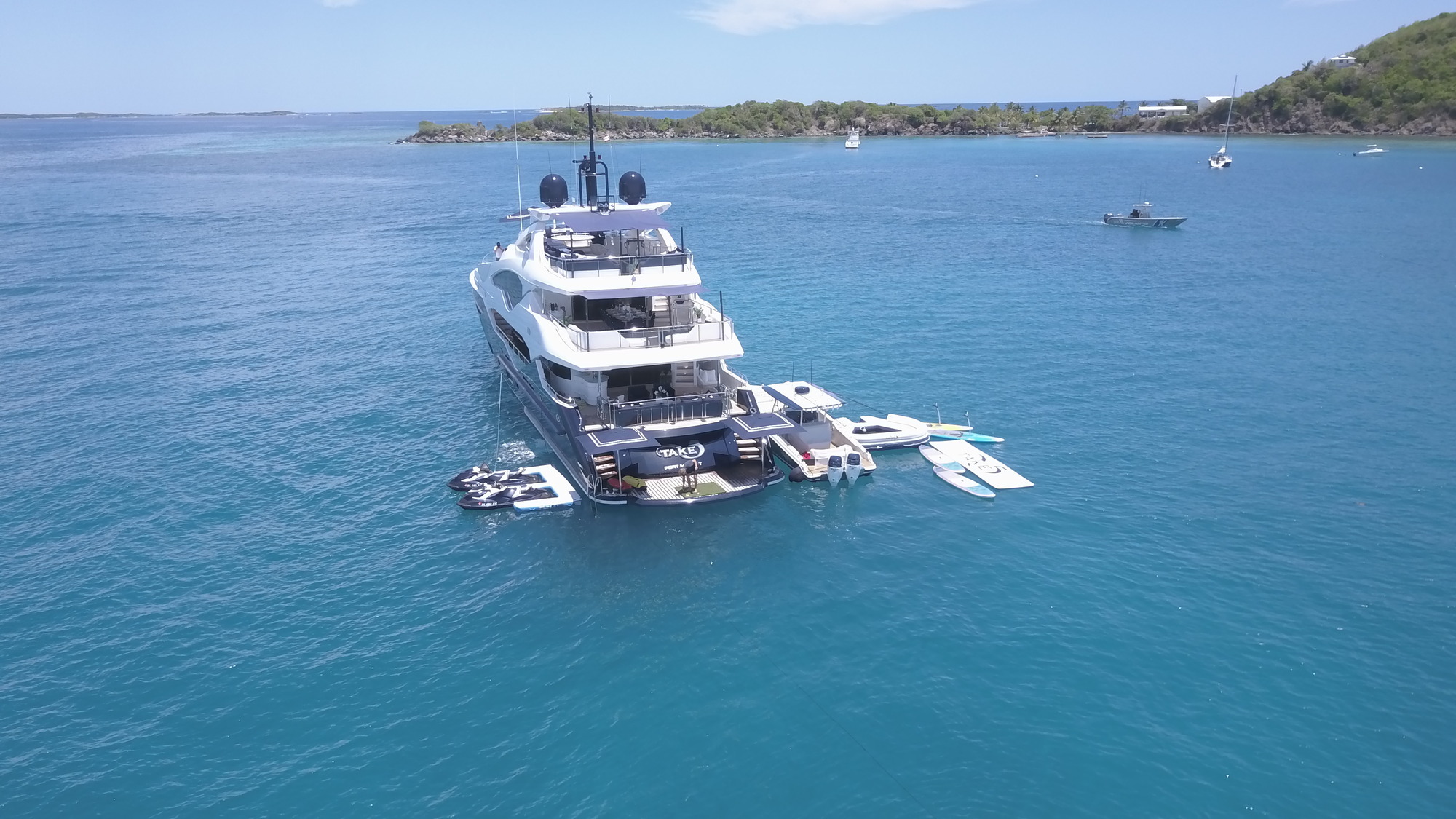 Tenders & Toys: 34’ Nortec towed tender 2 x 400hp engines 18’ Williams Tender 180hp Waterslide 2 two-person Sea-Doo Jet Skis: 1 x 2 seater RXP model, 1 x 3 seater GTIR model *Floating Sea-Doo Jet Ski dock so Sea-Doos are readily available for guests 2 Seabobs 4 x Stand-up inflatable paddle boards & 2 elliptical paddle boards 1 x Inflatable 2 person kayak Wakeboards & Kneeboards Towable toys Fun Floating Oasis Floating Splash Pad “Yacht Golf” PVC with special netting Snorkeling gear (adults & children) Assorted fishing equipment Basketball hoop on Sundeck Bocce Ball Rendezvous diving only Drone Exercise Equipment: Treadmill Yoga mats Free weights Massage table Audio Visual Equipment and Deck Facilities: MAIN SALON Elegant, luxury at its finest, glamorous decor. Ample lounge areas. 80" flat screen retractable TV with surround sound. Dayhead forward on Stbd side. Easy "1 touch button" for access to Aft Deck. Six floor to ceiling windows offering fantastic views. MAIN AFT DECK Aft settee lounge seating with table for cocktails. Access to Beach Club & Skylounge Deck. Below the Aft Deck is TAKE 5's Beach Club which houses all the water toys. This is a multipurpose activity center that can be converted into a recreational area when all the water toys are out at sea. The massive swim platform serves as an extra deck near the water level, and a place for the crew to setup a private beach club. SKYLOUNGE Ample lounge spaces with 3 large couches. Full bar. 103" flat screen TV. Dayhead on Port side, Stew pantry with dumbwaiter. Massive windows offering sweeping views. "Zen-like" custom wall fountain. Game table for 4. Easy "1 touch button" for access to Skylounge Deck & Main Aft Deck. SKYLOUNGE DECK Alfresco dining for 12 on a stunning teak table. Chic lounge area Aft. Optional awning is available for extra shade. SUN DECK DREW’s massive Sun Deck is divided into 2 sections: AFT: 2 GIANT sunpads with optional sun triangle shading. FORWARD: Large bar with bar stool seating for 2. Port settee casual dining & cocktails for 10. 42” flat screen TV. Jacuzzi perfectly positioned all the way forward for sensational views. PORTUGUESE DECK Massive U-shaped settee dining for 8. Large sun pad behind. Communications: VSAT WiFi Satellite phone Satellite TV Cell phone