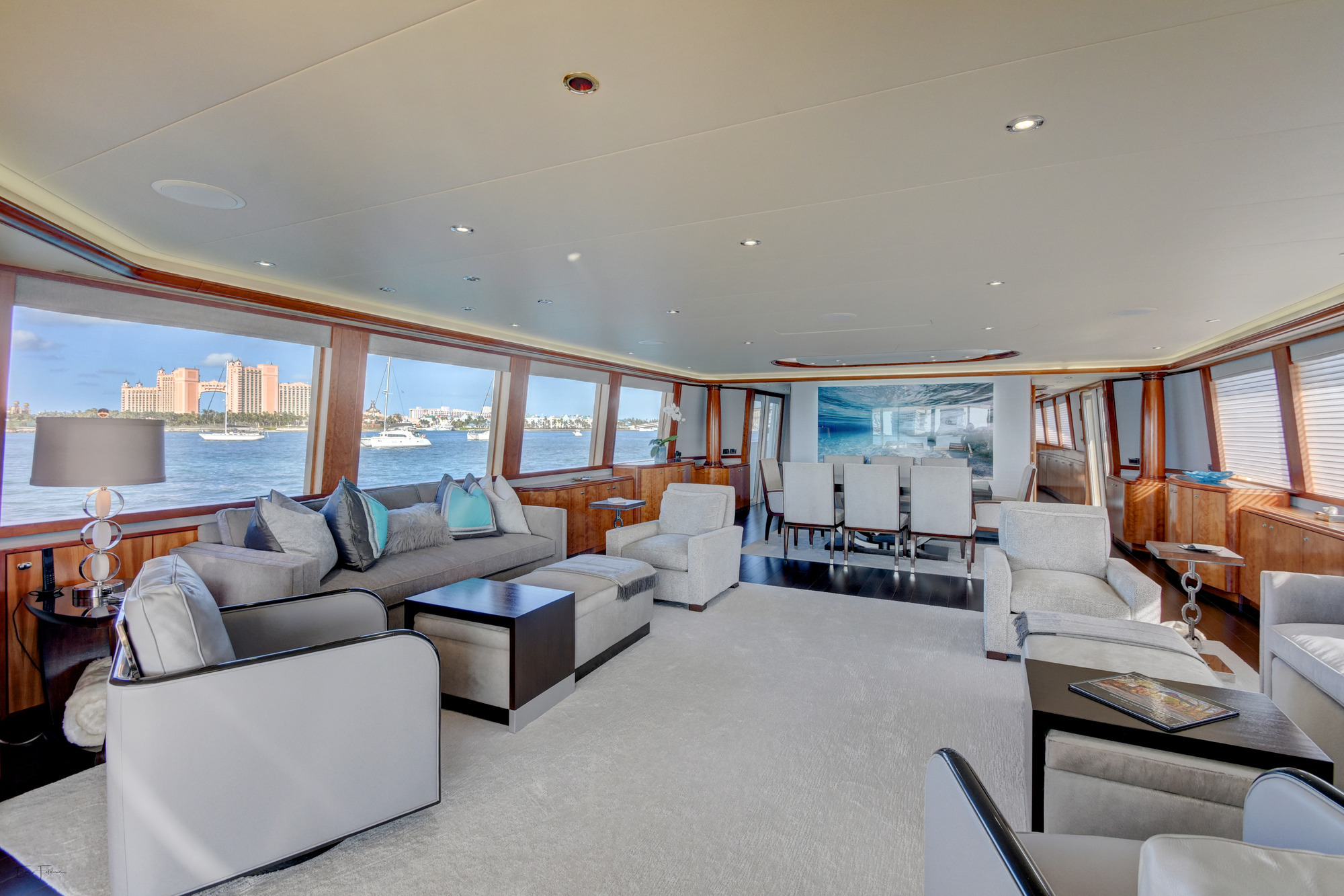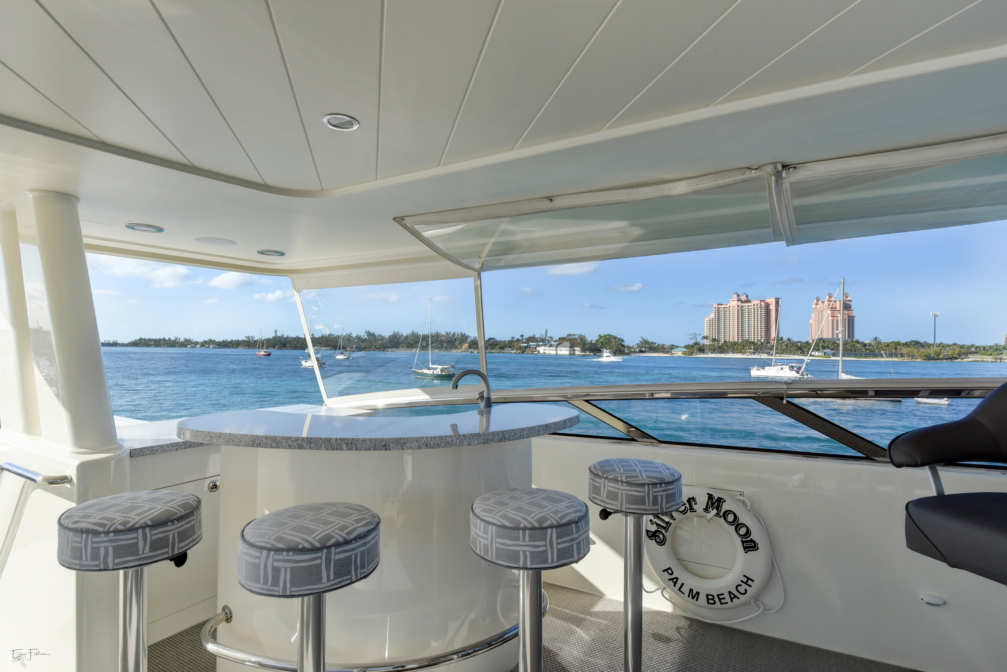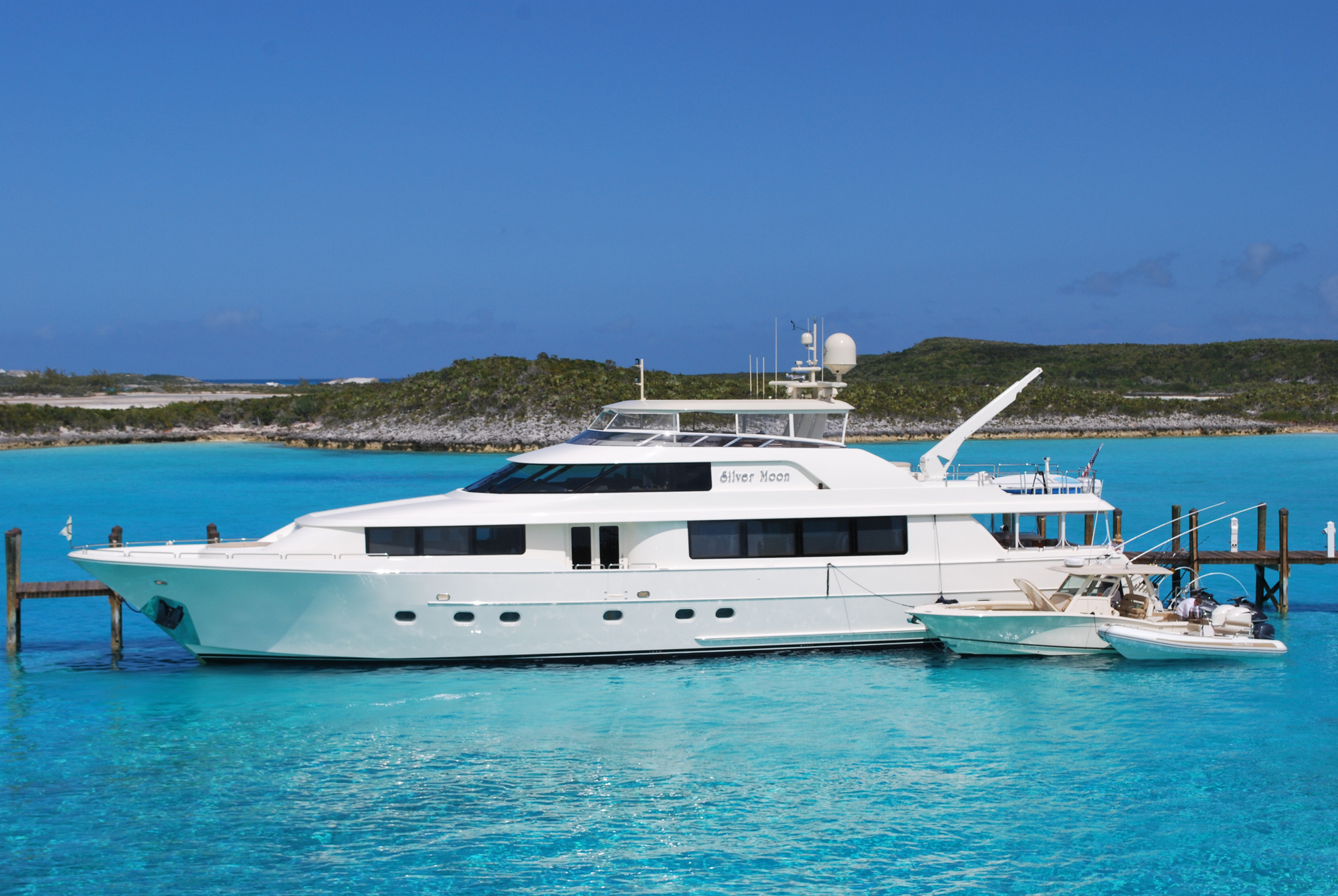Motor yacht SILVER MOON was designed by Jack Sarin Naval Architects and built by Westport shipyard of the USA in 2004 and underwent an extensive refit in 2017. M/Y SILVER MOON measures 34.11m (112ft) and is available for charter for up to 8 guests in the Bahamas year round. Charter yacht SILVER MOON has a contemporary warm interior. The salon and dining are an open plan, the relaxing lounge is aft and offers a plush sofa on the starboard side and 2 reclining leather chairs on the port. Cream carpets and ceilings enhance the warm wood panels, large panoramic windows allow ample natural in light creating a spacious yet cozy ambiance. Forward of the lounge a sophisticated clear glass oval dining table is flanked by 8 high back suede chairs ideal for both formal and informal occasions. Guest accommodation aboard the M/Y SILVER MOON is accessed forward of the salon and dining below decks through a stylish foyer. Motor yacht SILVER MOON has plenty of deck space to relax, soak up the sun and entertain. The aft deck is adjacent to the salon and offers an alfresco dining option, built in custom seating. Dual stairways on port and starboard lead to the extended swim platform and water toys area. Side decks wrap around the yacht offering easy access to the foredeck and a unique built in circular seating area and sunpad.