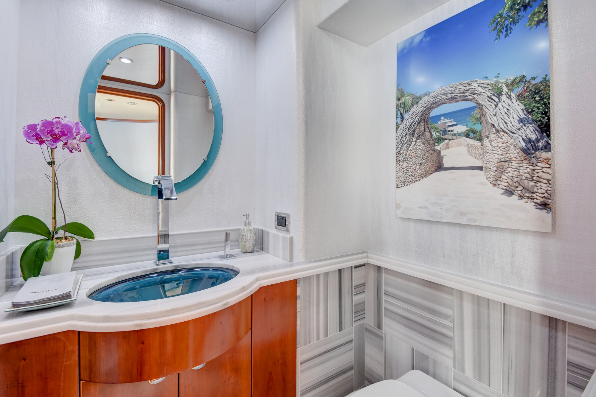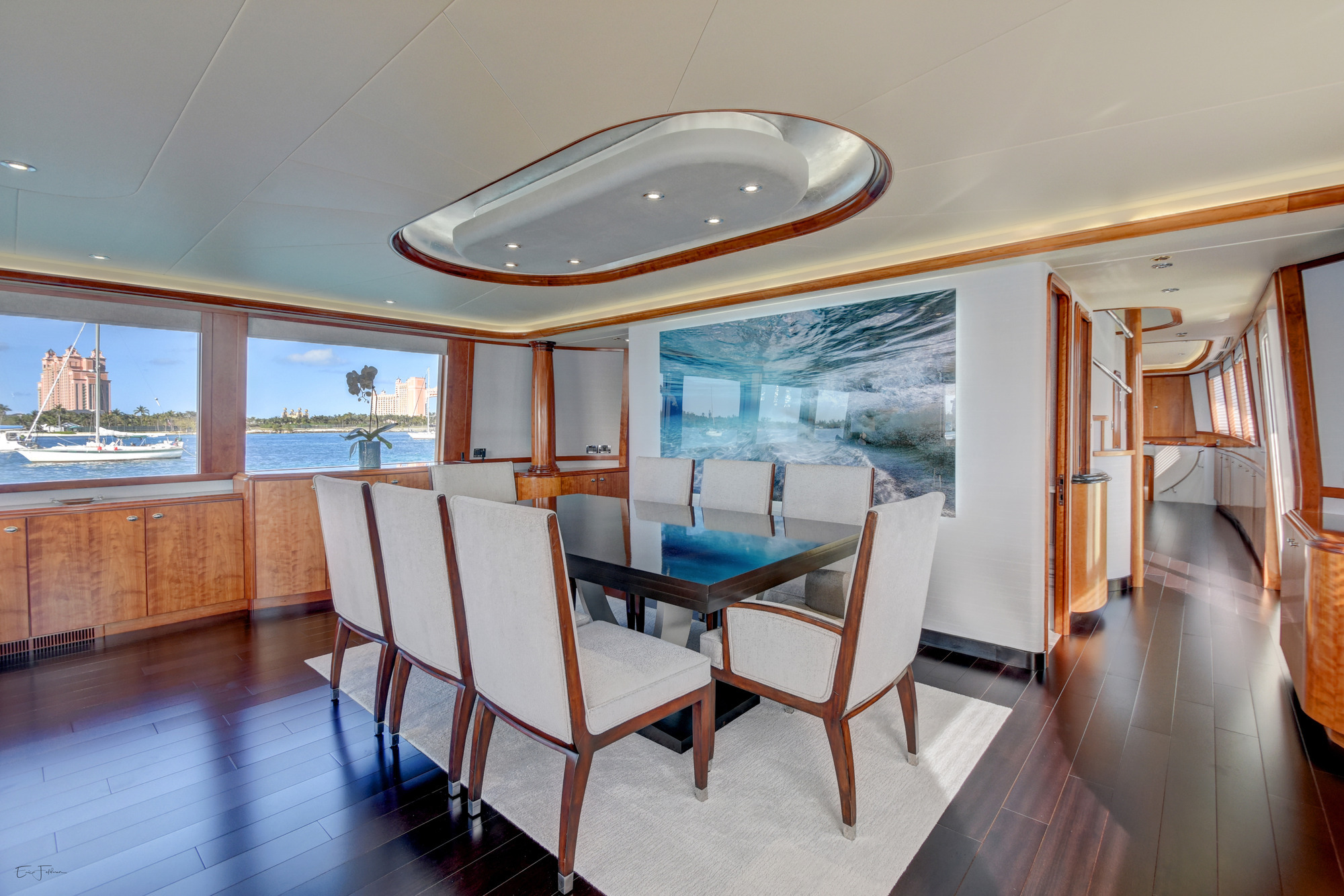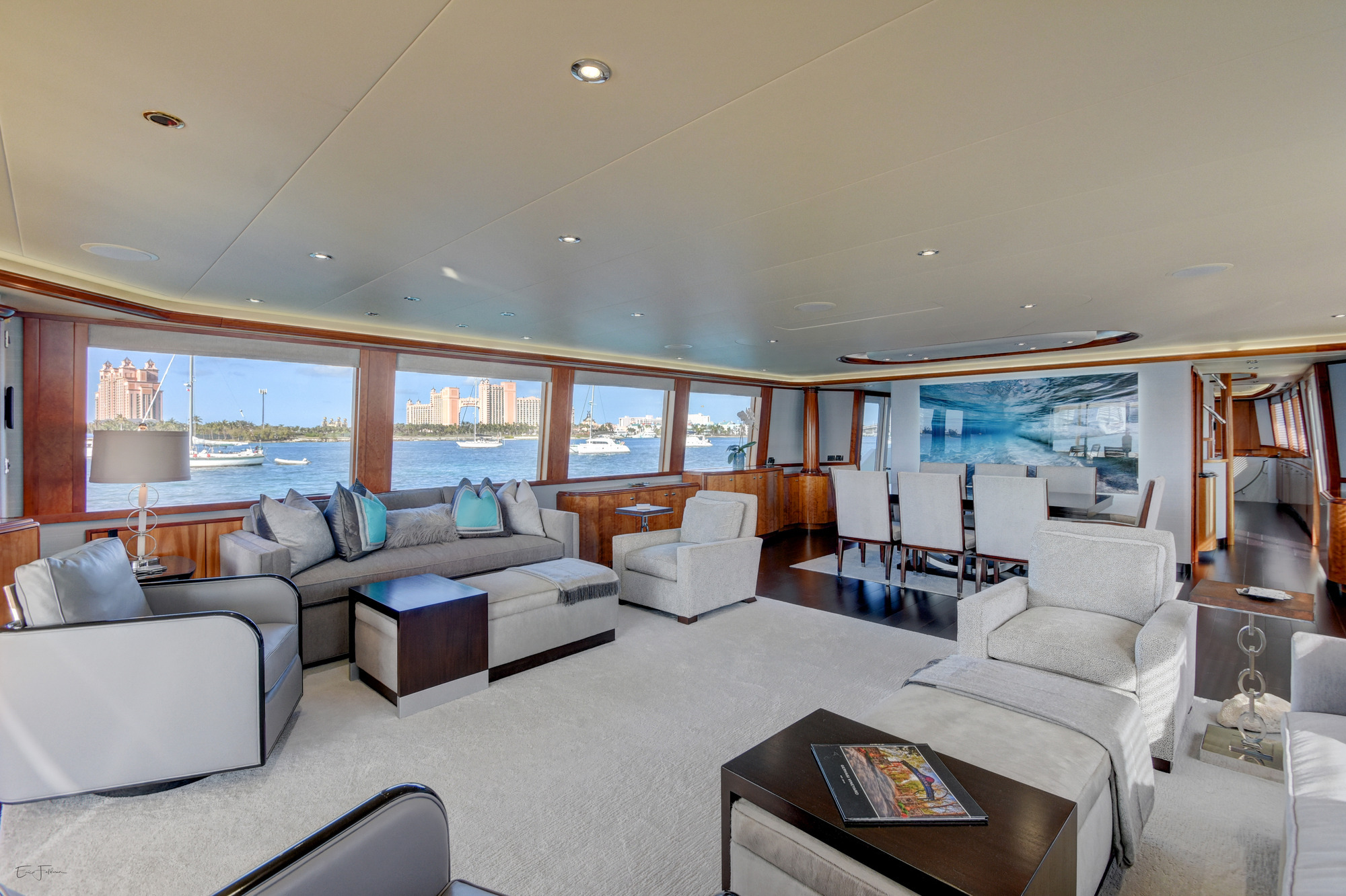 Motor yacht SILVER MOON was designed by Jack Sarin Naval Architects and built by Westport shipyard of the USA in 2004 and underwent an extensive refit in 2017. M/Y SILVER MOON measures 34.11m (112ft) and is available for charter for up to 8 guests in the Bahamas year round. Charter yacht SILVER MOON has a contemporary warm interior. The salon and dining are an open plan, the relaxing lounge is aft and offers a plush sofa on the starboard side and 2 reclining leather chairs on the port. Cream carpets and ceilings enhance the warm wood panels, large panoramic windows allow ample natural in light creating a spacious yet cozy ambiance. Forward of the lounge a sophisticated clear glass oval dining table is flanked by 8 high back suede chairs ideal for both formal and informal occasions. Guest accommodation aboard the M/Y SILVER MOON is accessed forward of the salon and dining below decks through a stylish foyer. Motor yacht SILVER MOON has plenty of deck space to relax, soak up the sun and entertain. The aft deck is adjacent to the salon and offers an alfresco dining option, built in custom seating. Dual stairways on port and starboard lead to the extended swim platform and water toys area. Side decks wrap around the yacht offering easy access to the foredeck and a unique built in circular seating area and sunpad.