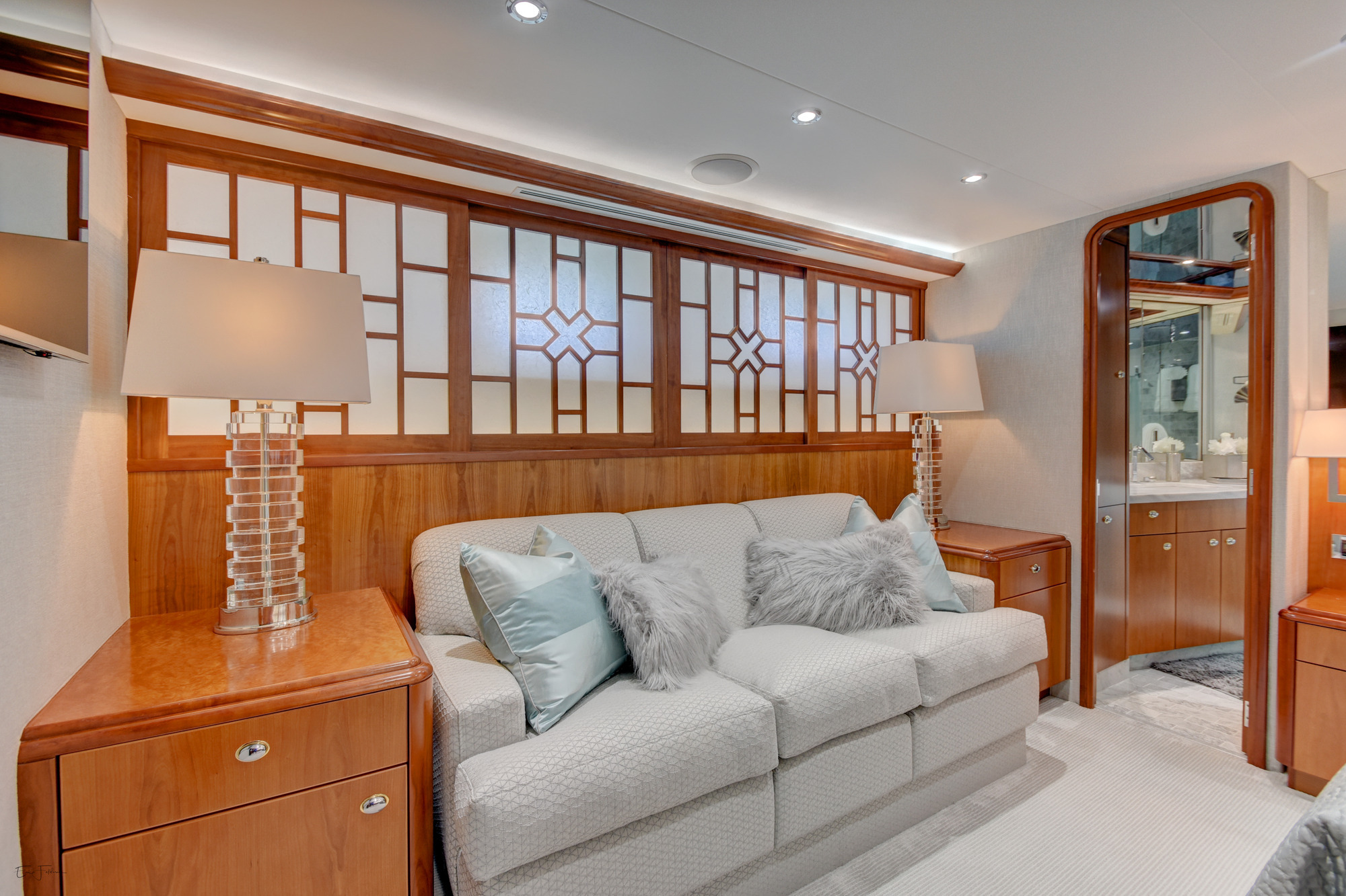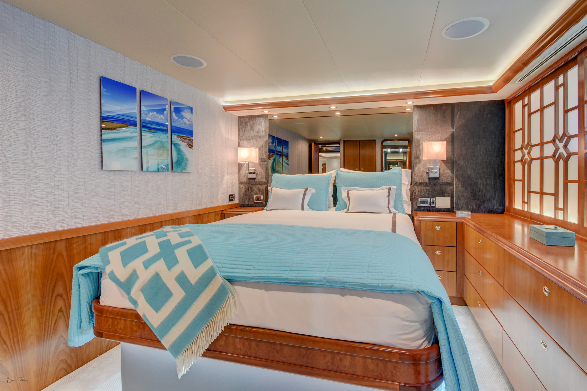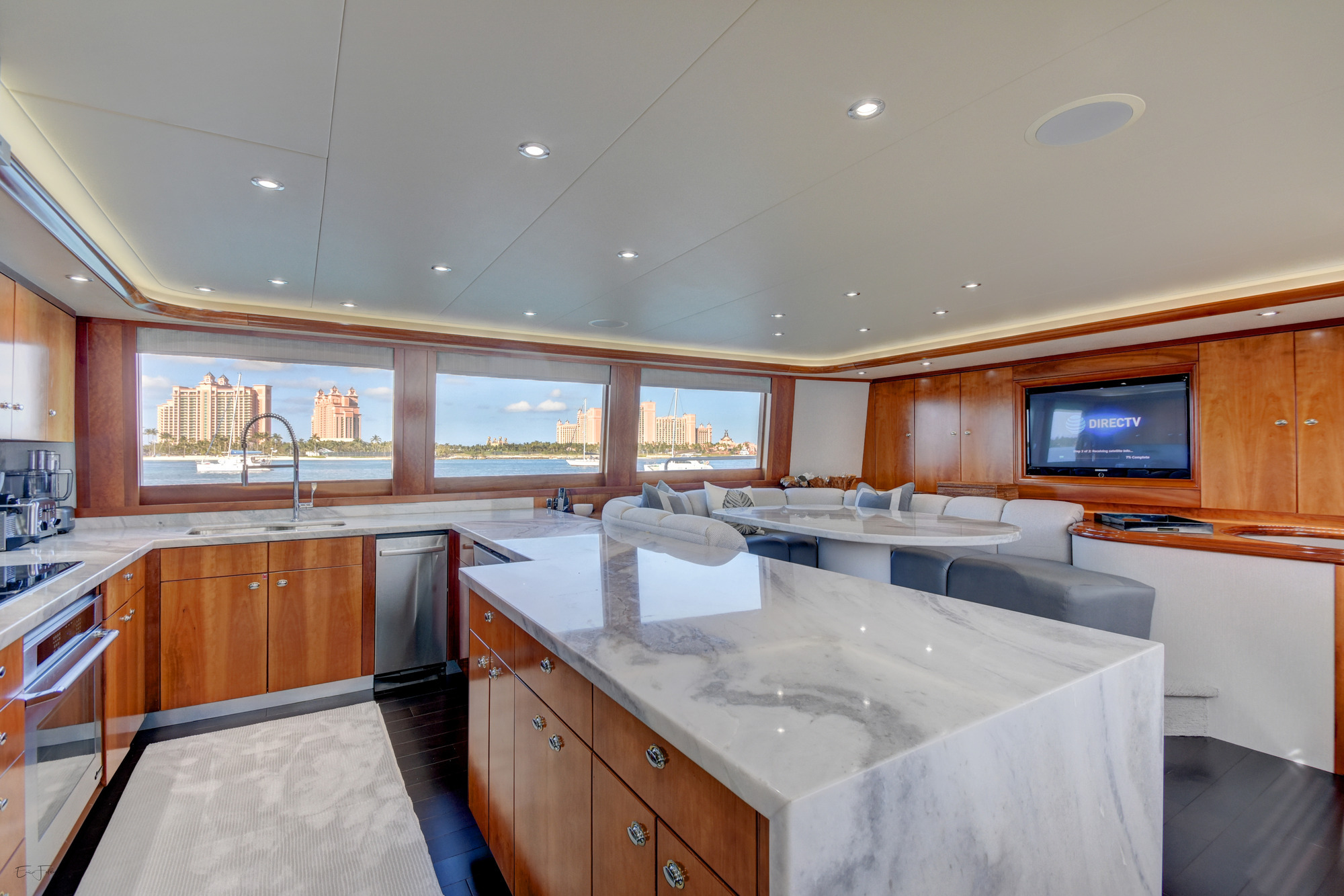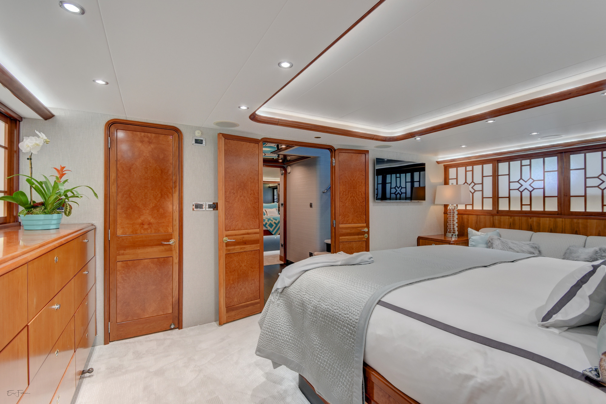 ALL NEW INTERIOR REFIT 2017! All new upgrades, soft goods, carpets and flooring. The master stateroom is located below deck, amidships and forward of the two guest staterooms. The master features a king size bed, his and hers master bath with large shower and Jacuzzi tub, and cedar lined closets. There is a flat screen TV and full entertainment center including: Direct TV / DVD / CD/ Stereo. The VIP stateroom is located below deck and forward of the galley, she features a queen size bed, full bathroom with shower and cedar lined closet. There is a flat screen TV and full entertainment center including: Direct TV / DVD/ CD / Stereo. The port VIP stateroom is located below deck, amidships and aft of the master. She features a queen size bed full bathroom with shower and cedar lined closet. There is a flat screen TV and full entertainment center including: Direct TV / DVD/ CD / Stereo. The starboard guest room is located below deck, amidships and aft of the master. This room can be set up with two twin beds or converted to a king size bed, depending on the guests on board. She features a full bathroom with shower and cedar lined closet. There is a flat screen TV and full entertainment center including: Direct TV / DVD/ CD / Stereo.