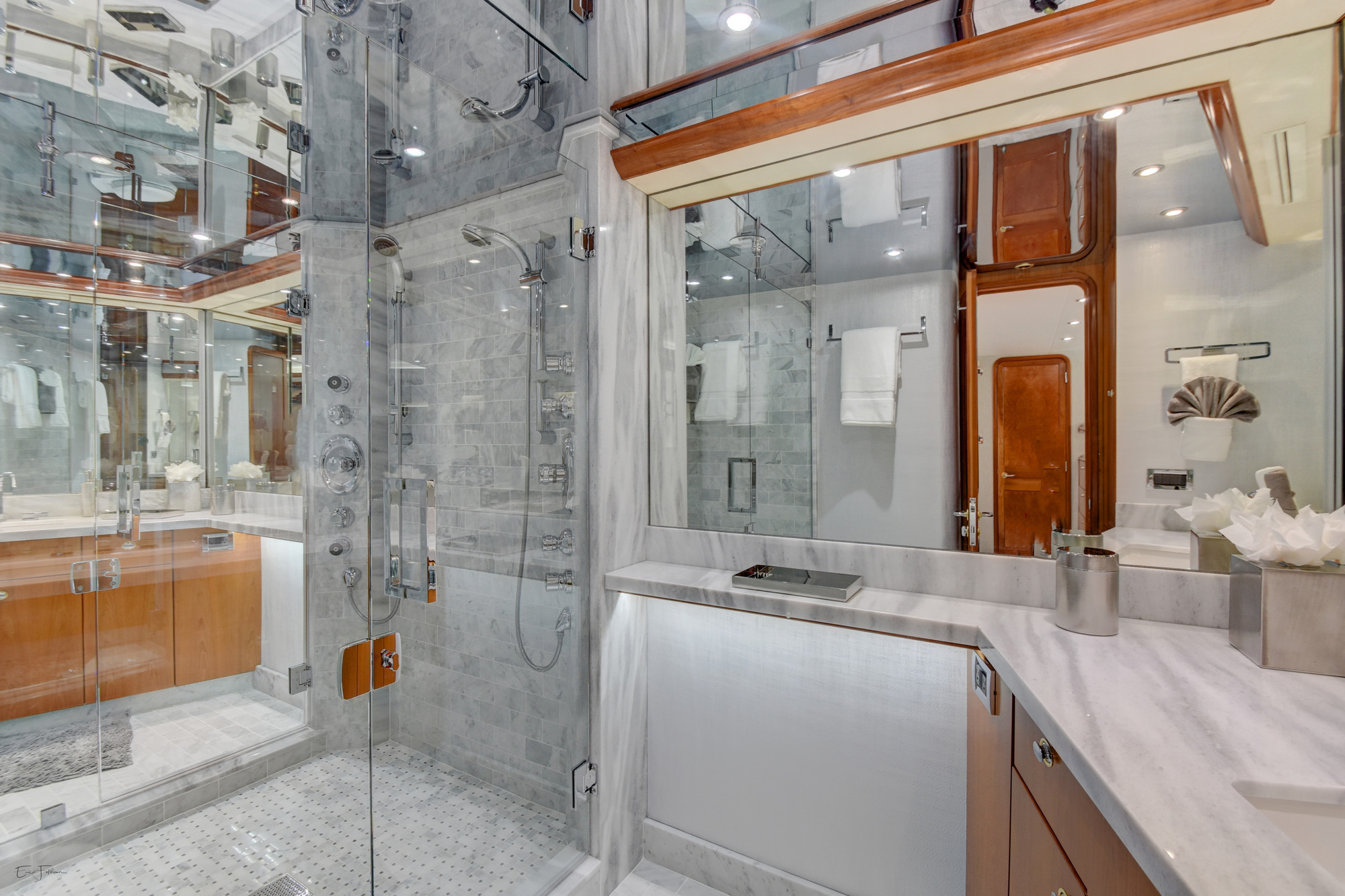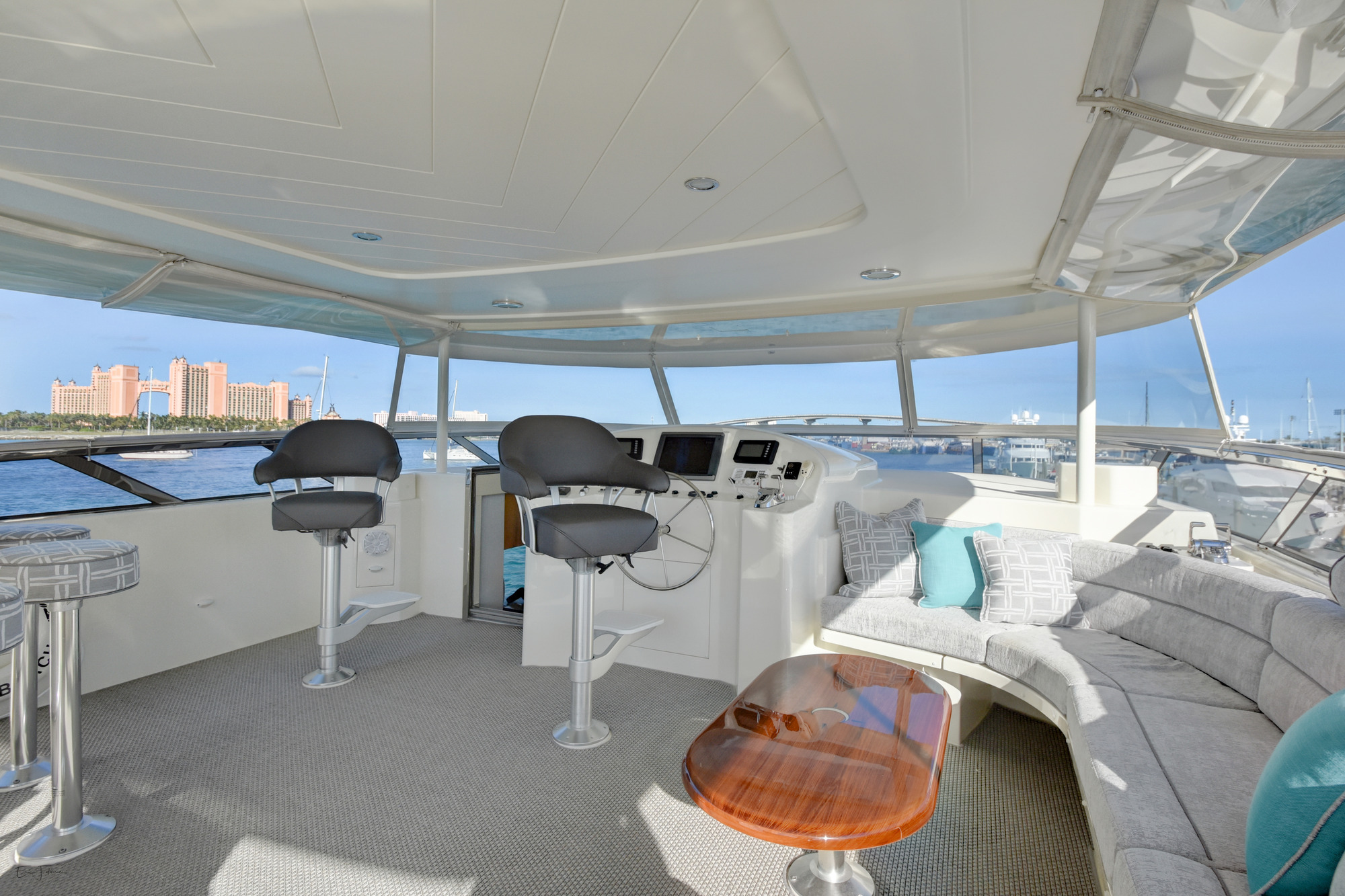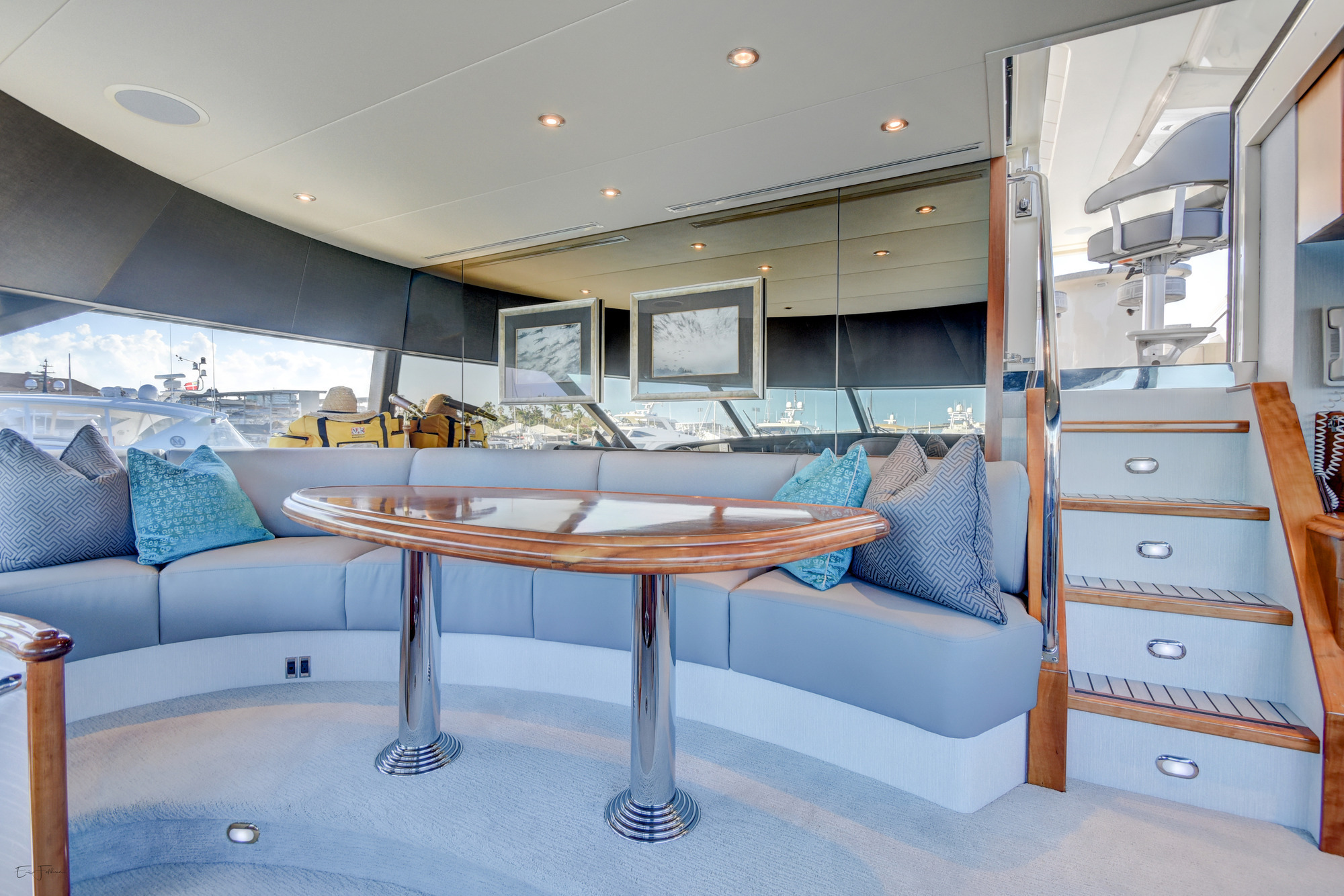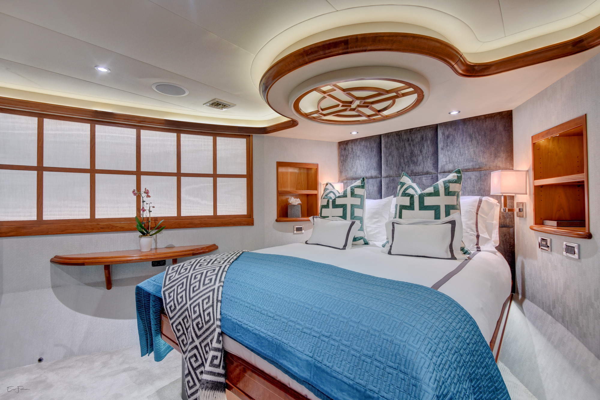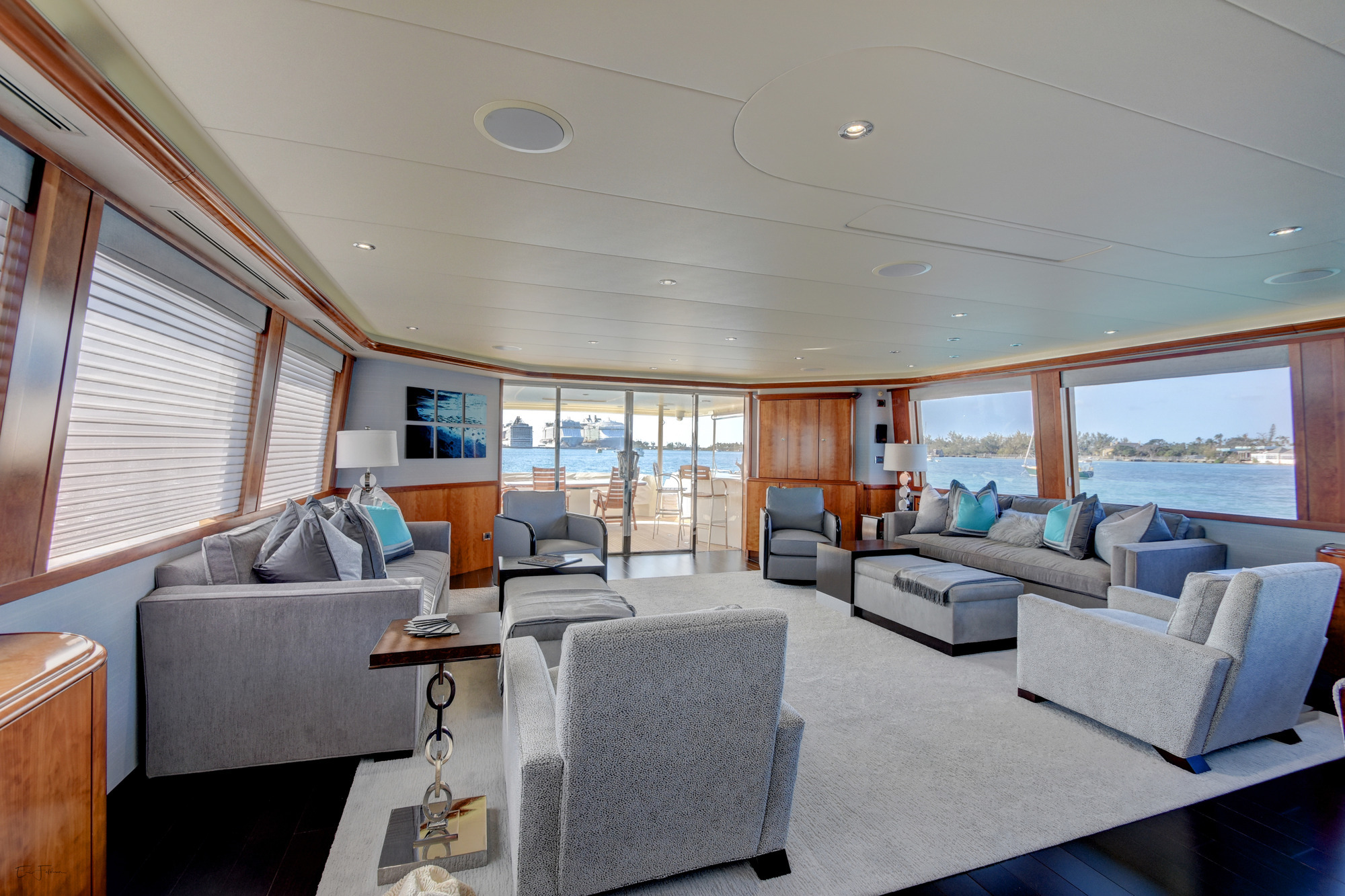 ALL NEW INTERIOR REFIT 2017! All new upgrades, soft goods, carpets and flooring. The master stateroom is located below deck, amidships and forward of the two guest staterooms. The master features a king size bed, his and hers master bath with large shower and Jacuzzi tub, and cedar lined closets. There is a flat screen TV and full entertainment center including: Direct TV / DVD / CD/ Stereo. The VIP stateroom is located below deck and forward of the galley, she features a queen size bed, full bathroom with shower and cedar lined closet. There is a flat screen TV and full entertainment center including: Direct TV / DVD/ CD / Stereo. The port VIP stateroom is located below deck, amidships and aft of the master. She features a queen size bed full bathroom with shower and cedar lined closet. There is a flat screen TV and full entertainment center including: Direct TV / DVD/ CD / Stereo. The starboard guest room is located below deck, amidships and aft of the master. This room can be set up with two twin beds or converted to a king size bed, depending on the guests on board. She features a full bathroom with shower and cedar lined closet. There is a flat screen TV and full entertainment center including: Direct TV / DVD/ CD / Stereo.