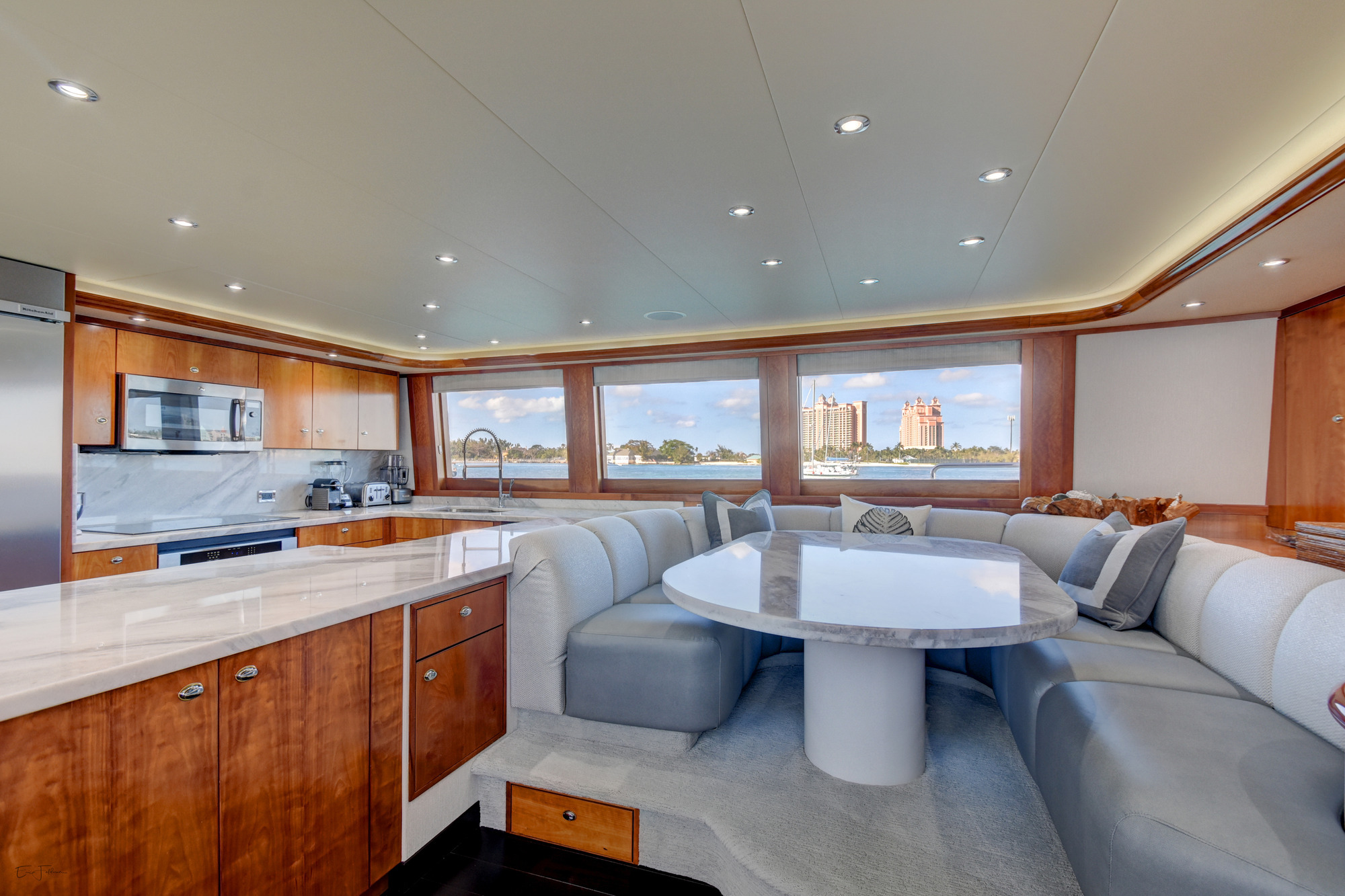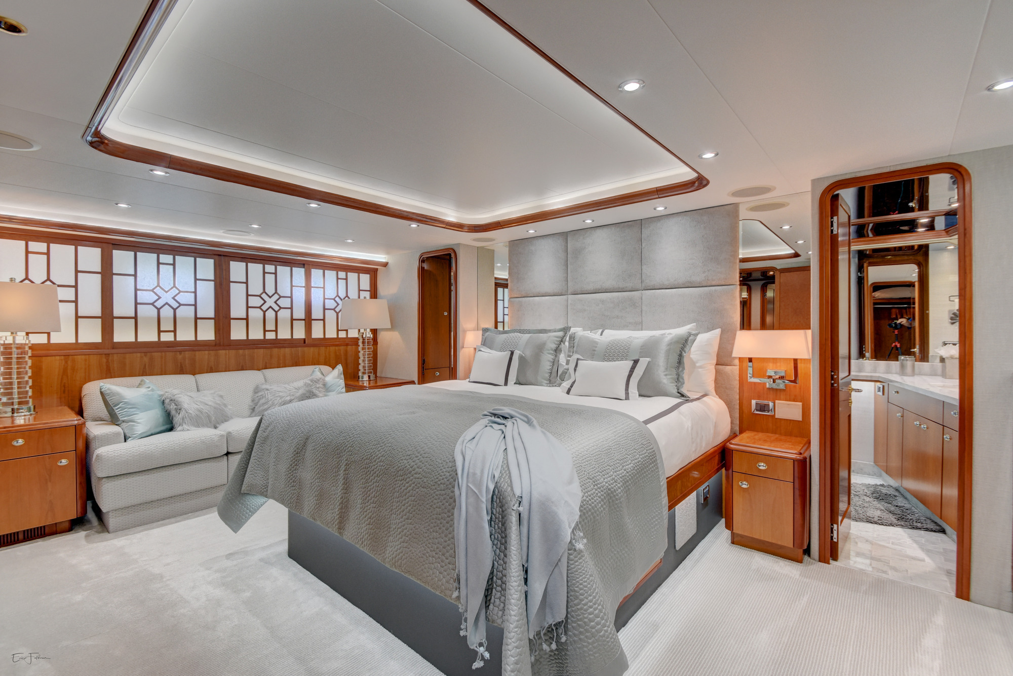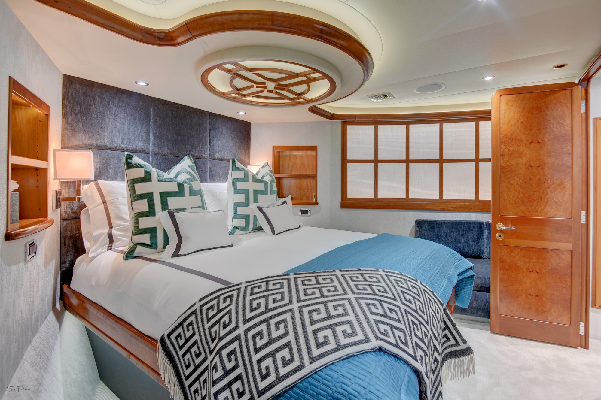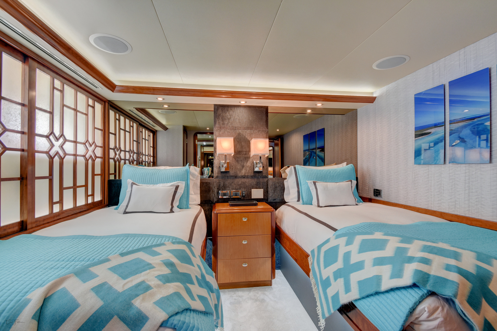 ALL NEW INTERIOR REFIT 2017! All new upgrades, soft goods, carpets and flooring. The master stateroom is located below deck, amidships and forward of the two guest staterooms. The master features a king size bed, his and hers master bath with large shower and Jacuzzi tub, and cedar lined closets. There is a flat screen TV and full entertainment center including: Direct TV / DVD / CD/ Stereo. The VIP stateroom is located below deck and forward of the galley, she features a queen size bed, full bathroom with shower and cedar lined closet. There is a flat screen TV and full entertainment center including: Direct TV / DVD/ CD / Stereo. The port VIP stateroom is located below deck, amidships and aft of the master. She features a queen size bed full bathroom with shower and cedar lined closet. There is a flat screen TV and full entertainment center including: Direct TV / DVD/ CD / Stereo. The starboard guest room is located below deck, amidships and aft of the master. This room can be set up with two twin beds or converted to a king size bed, depending on the guests on board. She features a full bathroom with shower and cedar lined closet. There is a flat screen TV and full entertainment center including: Direct TV / DVD/ CD / Stereo.