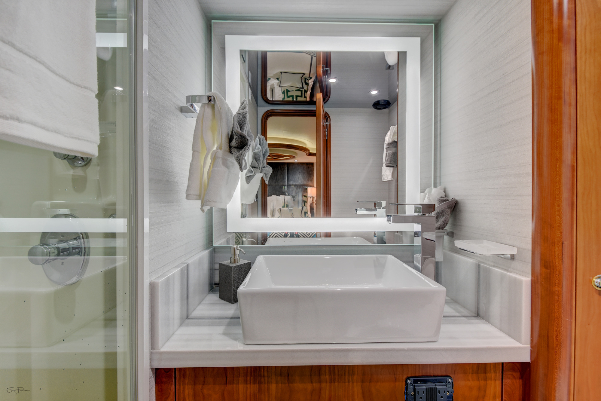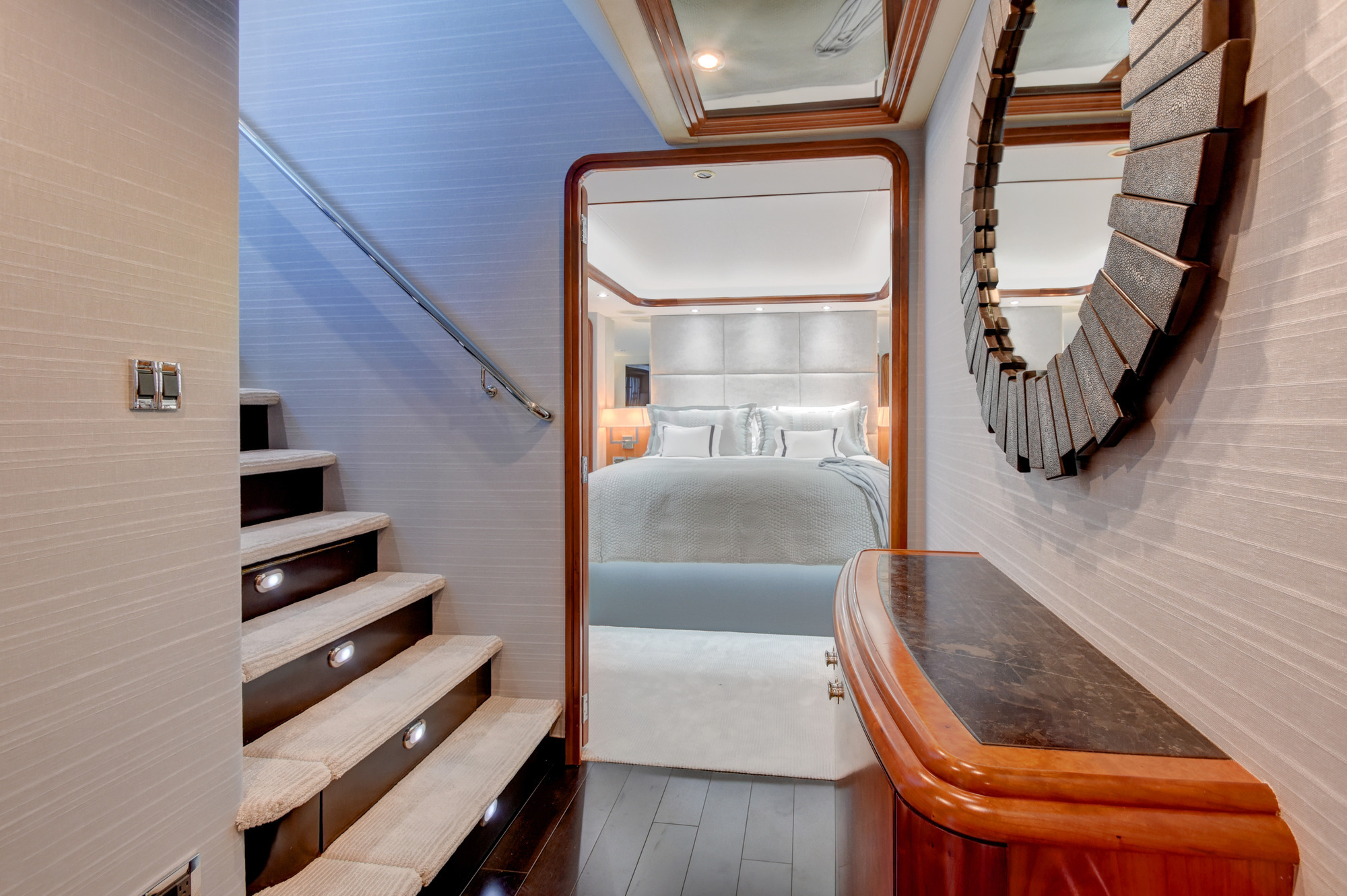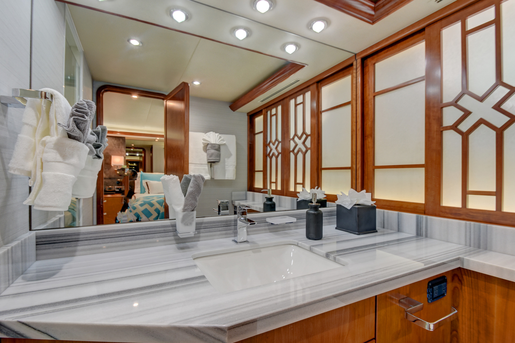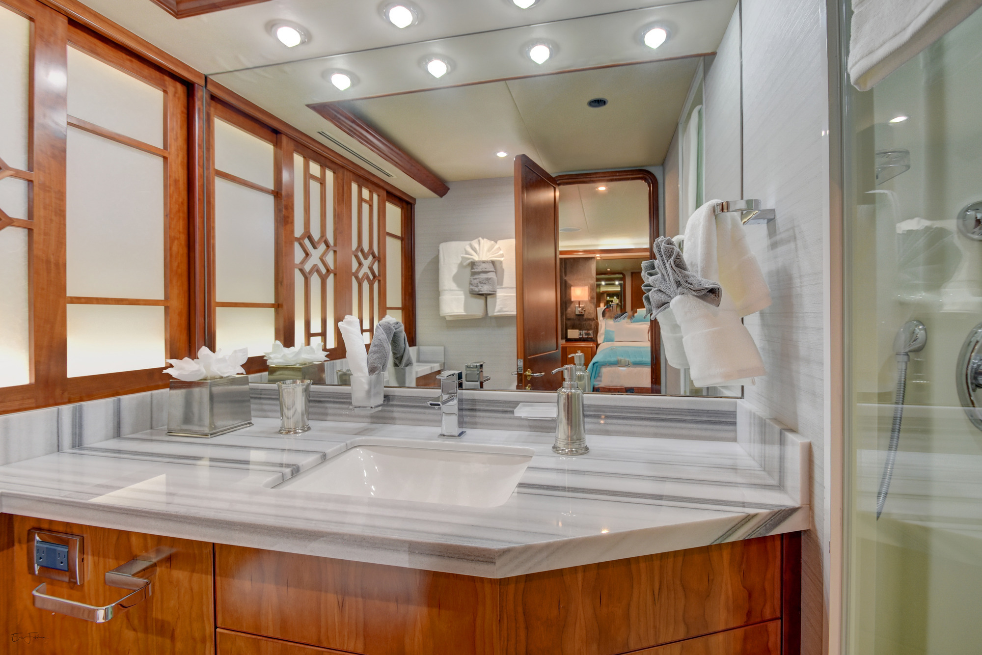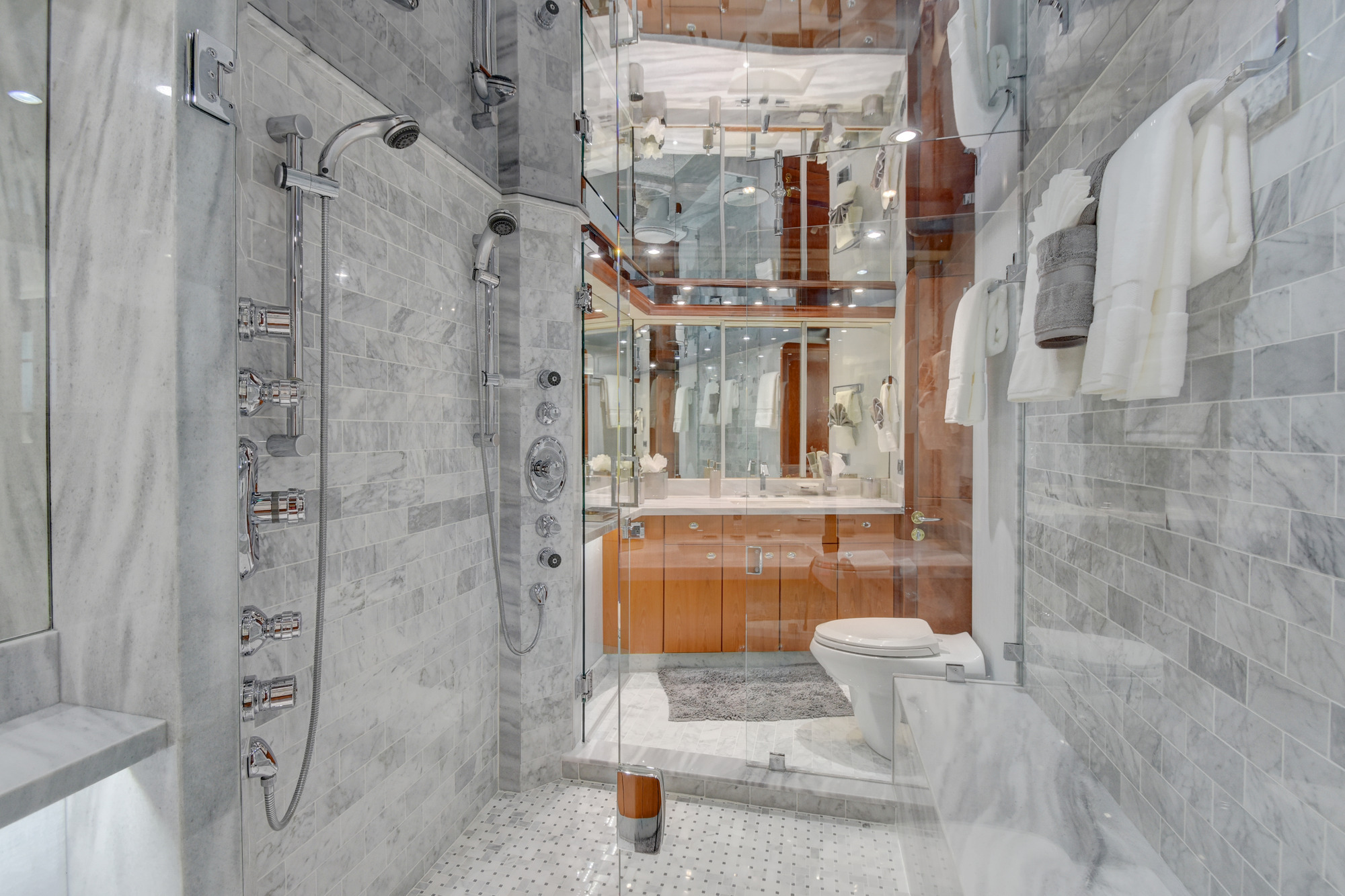ALL NEW INTERIOR REFIT 2017! All new upgrades, soft goods, carpets and flooring. The master stateroom is located below deck, amidships and forward of the two guest staterooms. The master features a king size bed, his and hers master bath with large shower and Jacuzzi tub, and cedar lined closets. There is a flat screen TV and full entertainment center including: Direct TV / DVD / CD/ Stereo. The VIP stateroom is located below deck and forward of the galley, she features a queen size bed, full bathroom with shower and cedar lined closet. There is a flat screen TV and full entertainment center including: Direct TV / DVD/ CD / Stereo. The port VIP stateroom is located below deck, amidships and aft of the master. She features a queen size bed full bathroom with shower and cedar lined closet. There is a flat screen TV and full entertainment center including: Direct TV / DVD/ CD / Stereo. The starboard guest room is located below deck, amidships and aft of the master. This room can be set up with two twin beds or converted to a king size bed, depending on the guests on board. She features a full bathroom with shower and cedar lined closet. There is a flat screen TV and full entertainment center including: Direct TV / DVD/ CD / Stereo.
