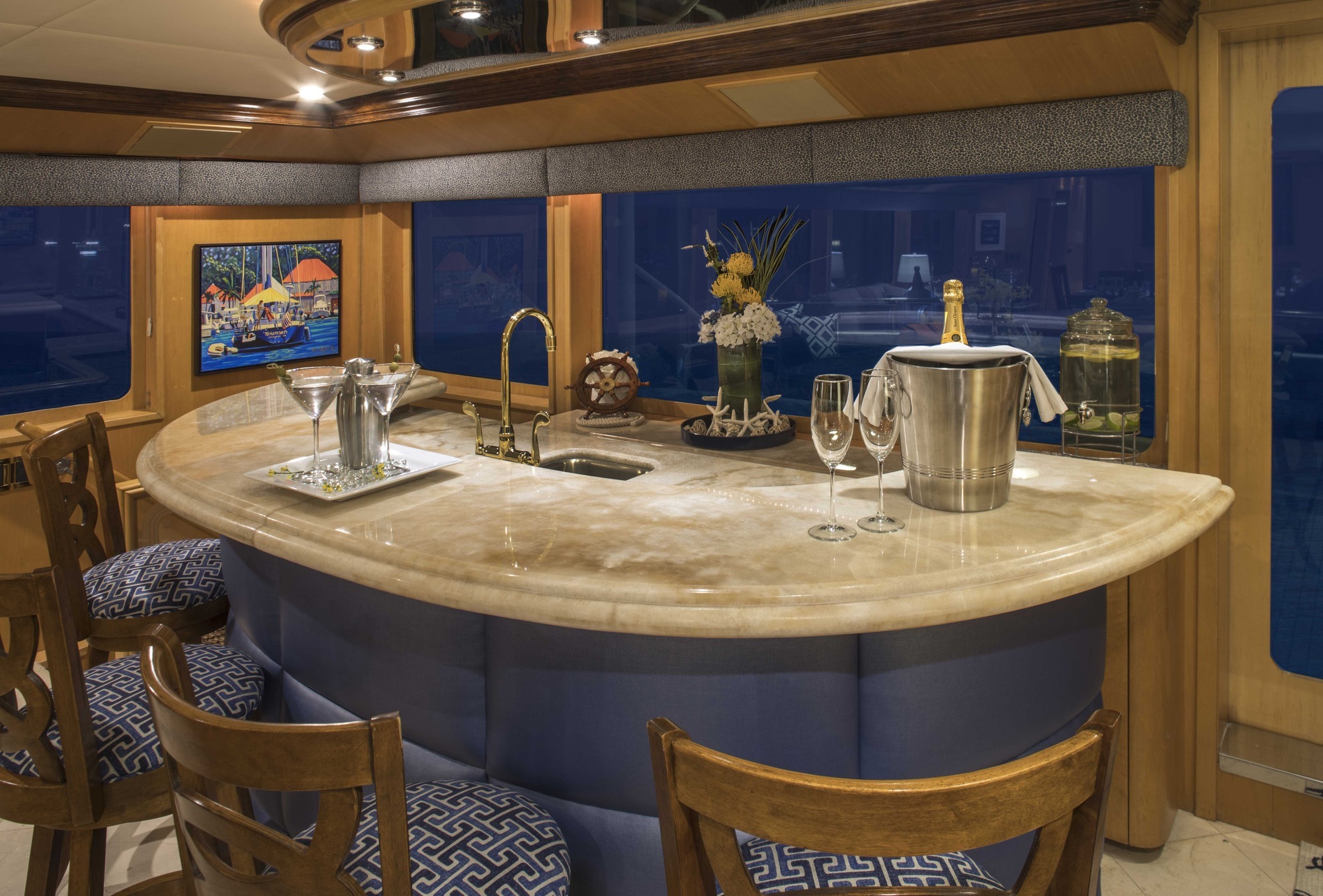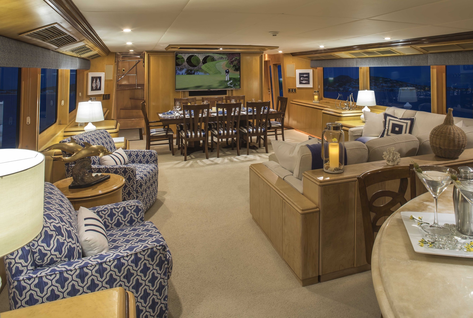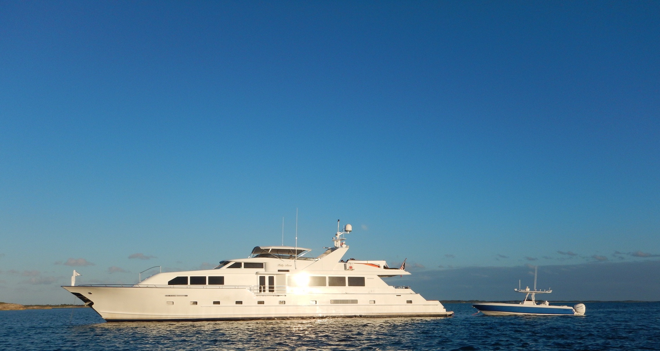 Yacht Kelly Anne is a luxurious 110-foot semi-displacement motor yacht, built in 1995 by Broward Marine. She had several refits with significant updates in 2010 and 2012, 2017 which included an out of the box engines from Detroit, new generators, complete underwater service, new electronics, new air conditioning, new underwater lights, new watermaker, new interior fabrics and reconfiguring the flybridge. refresh and refitted New Galley floorNew Headliners All new cushion interior / exterior New fridge New StoveComplete buff and waxAdded wall paper to the Guest StateroomNew photography. Ten guests can enjoy the fabulous amentities onboard Kelly Anne. Her beautifully-appointed staterooms include a master king suite, a VIP suite with a queen bed, and three twin rooms with two single beds in each. The living areas aboard Kelly Anne are truly amazing. The spacious salon and formal dining area make use of an open layout, providing room for your social get togethers. For a less formal dining experience, choose an al fresco setting on the flybridge or aft deck. Additionally a large country kitchen and galley create a warm and welcoming space that is ideal for sipping coffee while watching the crew prepare a delicious breakfast to start your day. Easy access to the lazarette allows for hours of fun with the tenders and toys. Kelly Anne comes equipped with two Yamaha wave runners, two paddle boards, an ocean kayak, wakeboard, towing tube, and floating mats. Additionally, she is fully-equipped for fishing and snorkeling and offers guests use of the 32-foot Intrepid Center Console. Guests will certainly want to take advantage of the beautiful weather, and Kelly Anne boasts spacious and comfortable outdoor living spaces with numerous amenities. The large aft deck has a settee with a fold-down television, the flybridge has an on-deck Jacuzzi and plenty of seating under the Bimini, and aft is the relaxing boat deck with direct access to the water.