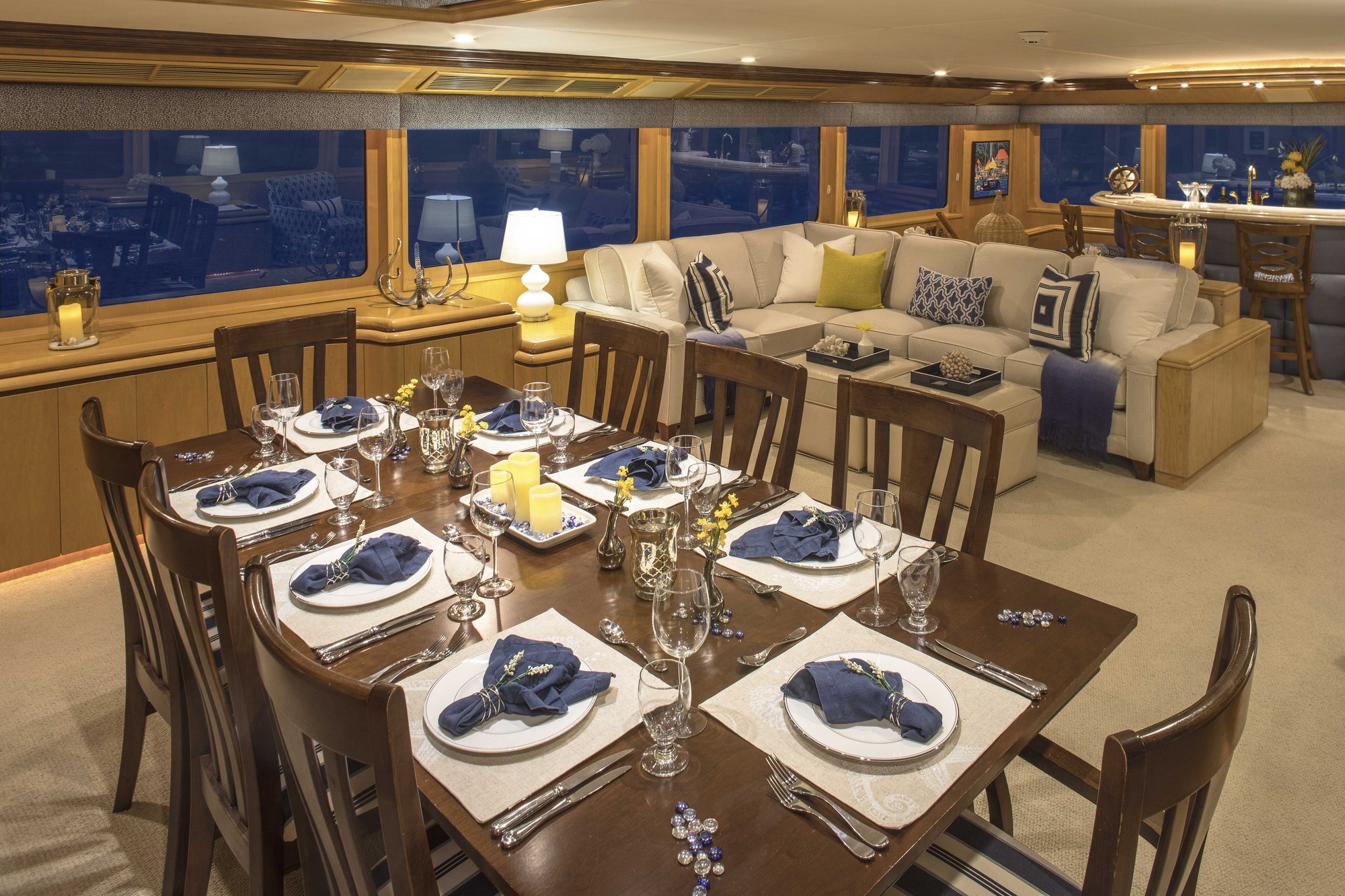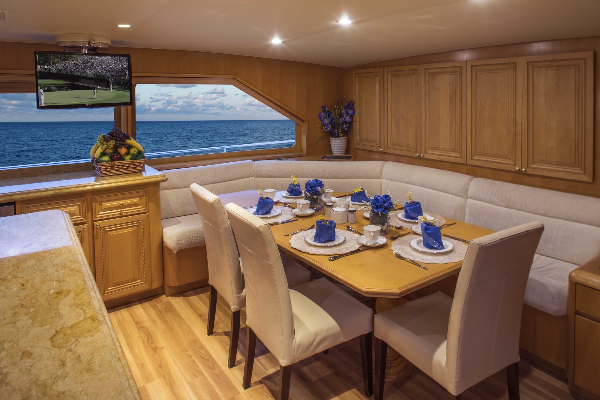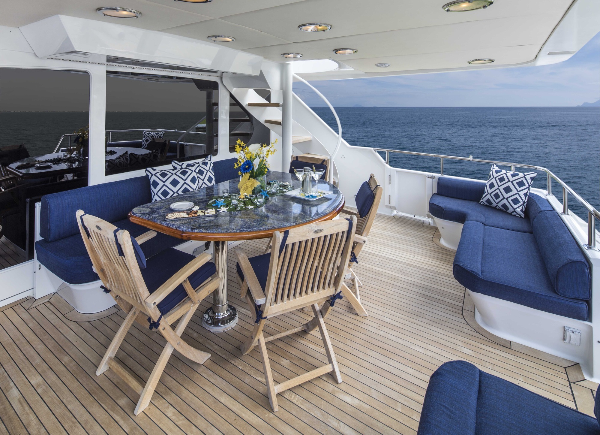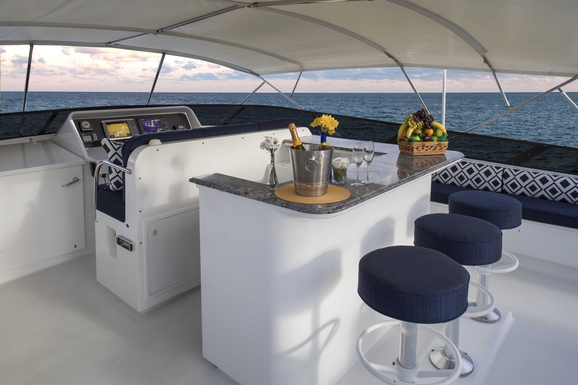 Yacht Kelly Anne is a luxurious 110-foot semi-displacement motor yacht, built in 1995 by Broward Marine. She had several refits with significant updates in 2010 and 2012, 2017 which included an out of the box engines from Detroit, new generators, complete underwater service, new electronics, new air conditioning, new underwater lights, new watermaker, new interior fabrics and reconfiguring the flybridge. refresh and refitted New Galley floorNew Headliners All new cushion interior / exterior New fridge New StoveComplete buff and waxAdded wall paper to the Guest StateroomNew photography. Ten guests can enjoy the fabulous amentities onboard Kelly Anne. Her beautifully-appointed staterooms include a master king suite, a VIP suite with a queen bed, and three twin rooms with two single beds in each. The living areas aboard Kelly Anne are truly amazing. The spacious salon and formal dining area make use of an open layout, providing room for your social get togethers. For a less formal dining experience, choose an al fresco setting on the flybridge or aft deck. Additionally a large country kitchen and galley create a warm and welcoming space that is ideal for sipping coffee while watching the crew prepare a delicious breakfast to start your day. Easy access to the lazarette allows for hours of fun with the tenders and toys. Kelly Anne comes equipped with two Yamaha wave runners, two paddle boards, an ocean kayak, wakeboard, towing tube, and floating mats. Additionally, she is fully-equipped for fishing and snorkeling and offers guests use of the 32-foot Intrepid Center Console. Guests will certainly want to take advantage of the beautiful weather, and Kelly Anne boasts spacious and comfortable outdoor living spaces with numerous amenities. The large aft deck has a settee with a fold-down television, the flybridge has an on-deck Jacuzzi and plenty of seating under the Bimini, and aft is the relaxing boat deck with direct access to the water.