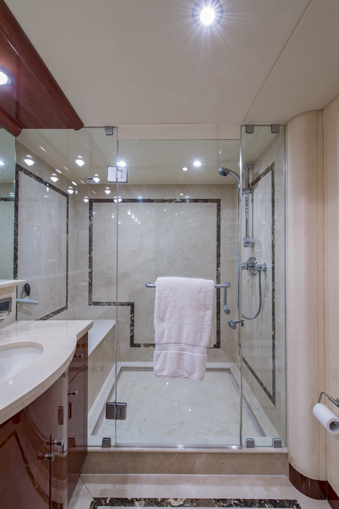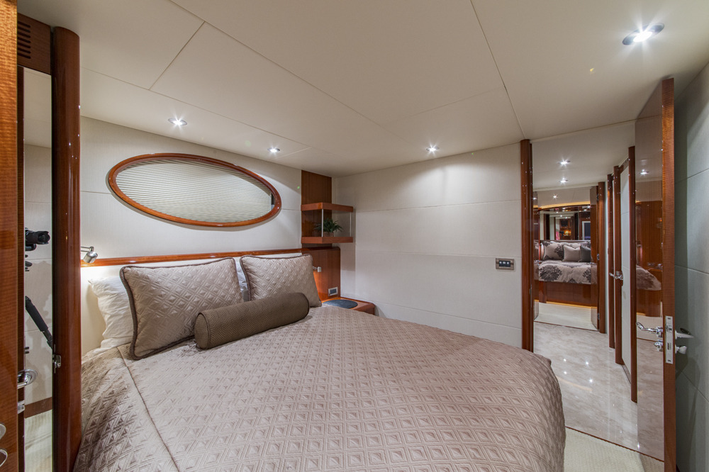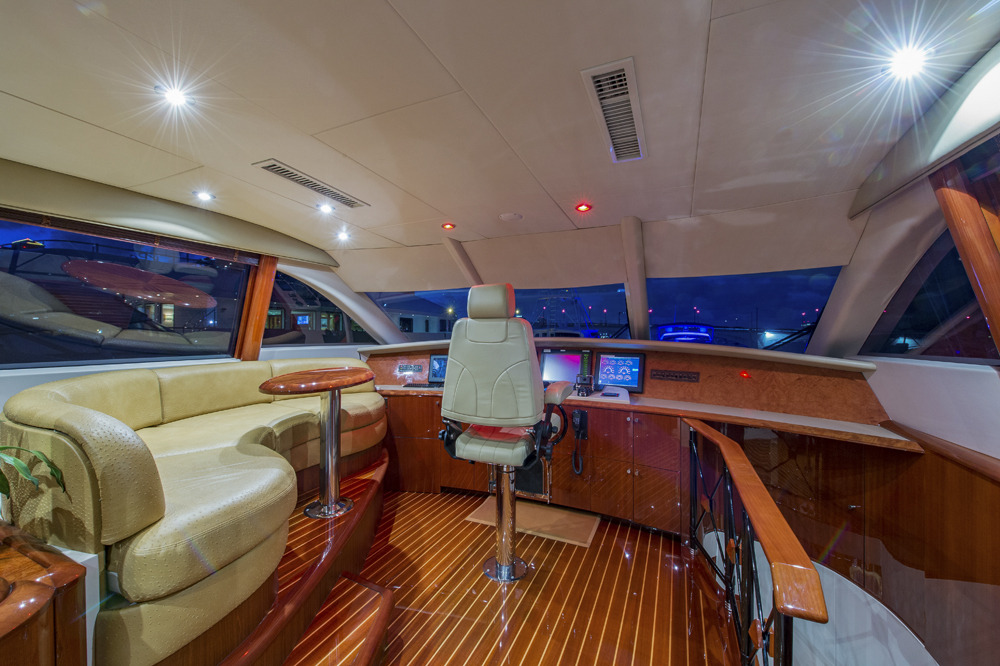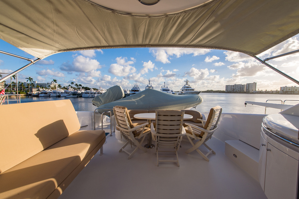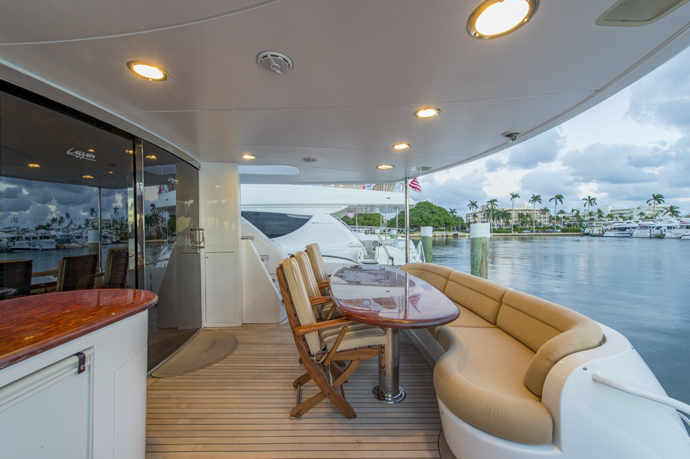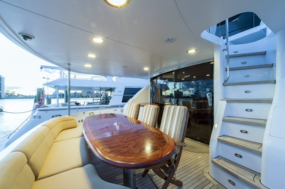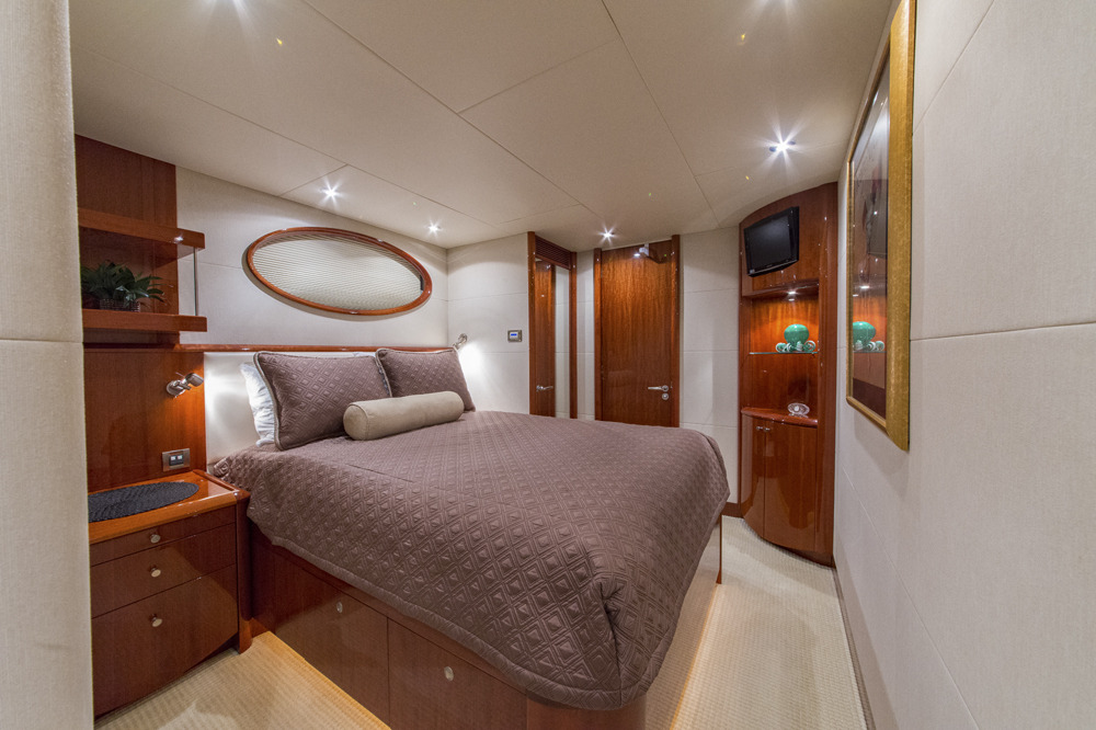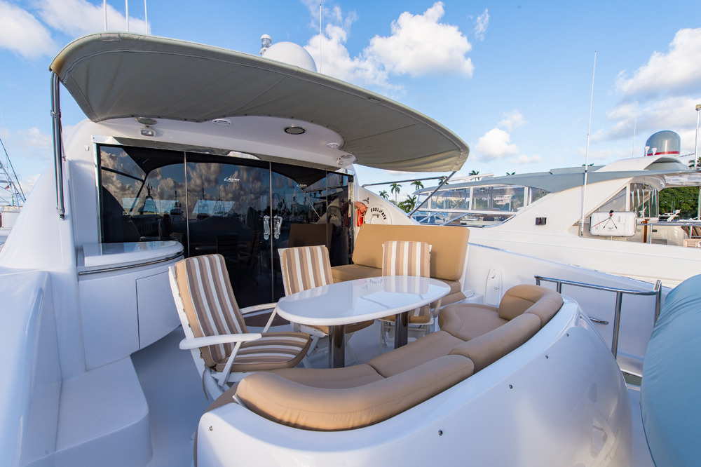 PASTAIO accommodates up to six guests with three double staterooms below. Ideal layout for 3 couples. Master with king, plus two Queen in guest cabins. Separate crew quarters forward. Master stateroom has walk around king size bed. Built in settee plus a vanity/desk with seating. Large cedar lined walk-in closet. En suite bathroom with double sink and large shower with shower bench. Two VIP staterooms with Queen size walk-around beds. Each has en suite bathroom with shower and built in shower bench. Hanging locker/cedar lined with full length mirror. Comfortable main salon with entertainment center and 43" Plasma TV. Formal dining following forward of the salon seats six. Galley forward is well equipped with stainless steel appliances, sub zero two drawer freezer (5.1 cubic feet), granite counter tops and small island. Comfortable dinette has two stools and cushioned bench. There is a 15" flat screen TV flush mounted. Day head next to galley. Main aft deck has oval shaped dinette with 3 teak chairs + cushioned sofa seating and steps leading down to the swim platform. Full walk around decks provide easy access around the main deck and leads forward to the bow where you will find a large sun pad area. Up a level the enclosed sky lounge/flybridge offers a second comfortable, air conditioned indoor lounge option with a 31" Smart TV. While continuing outside the tinted double sliding doors you will find an upper aft flybridge deck area with table and seating for up to six. The cushioned bench to starboard converts to a sun pad. There is a retractable canvas awning for partial shade. Secondary small grill located on the upper aft.
