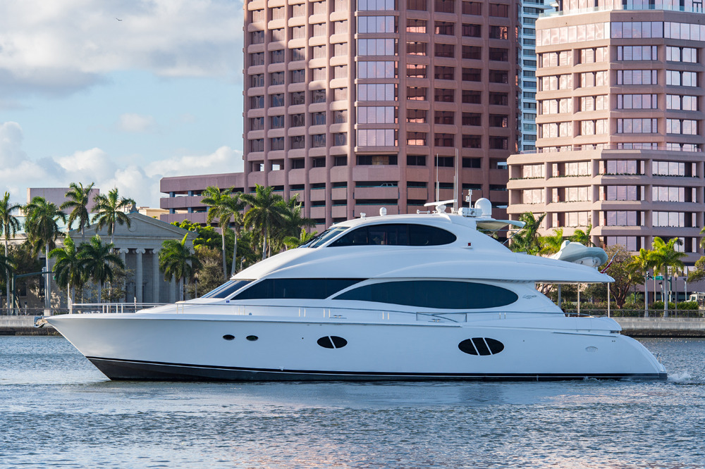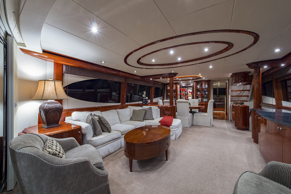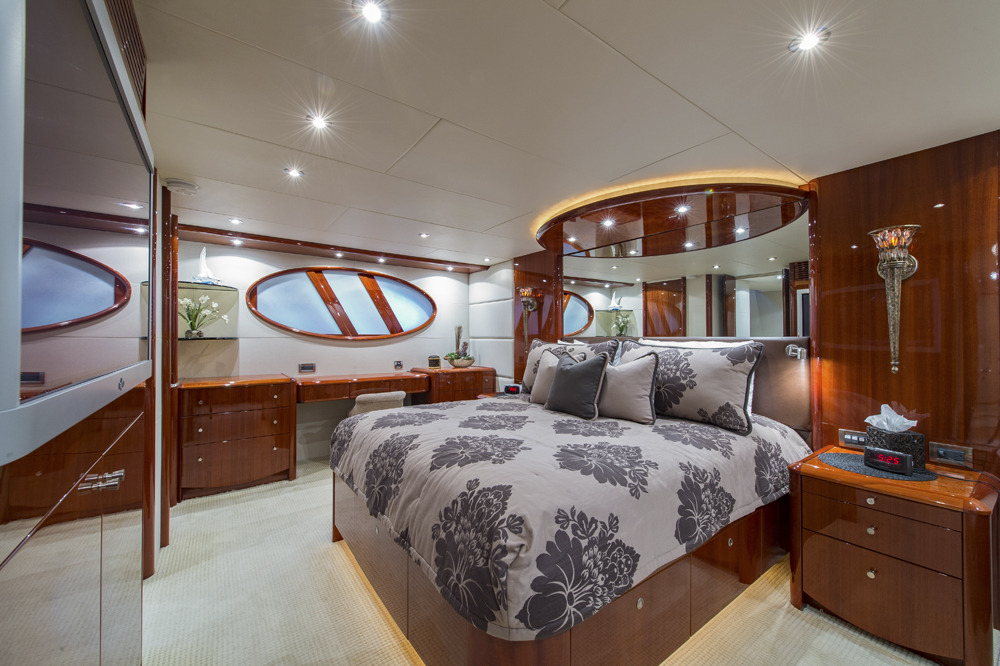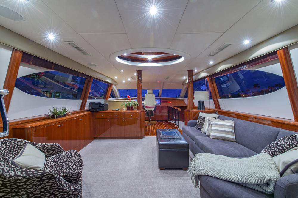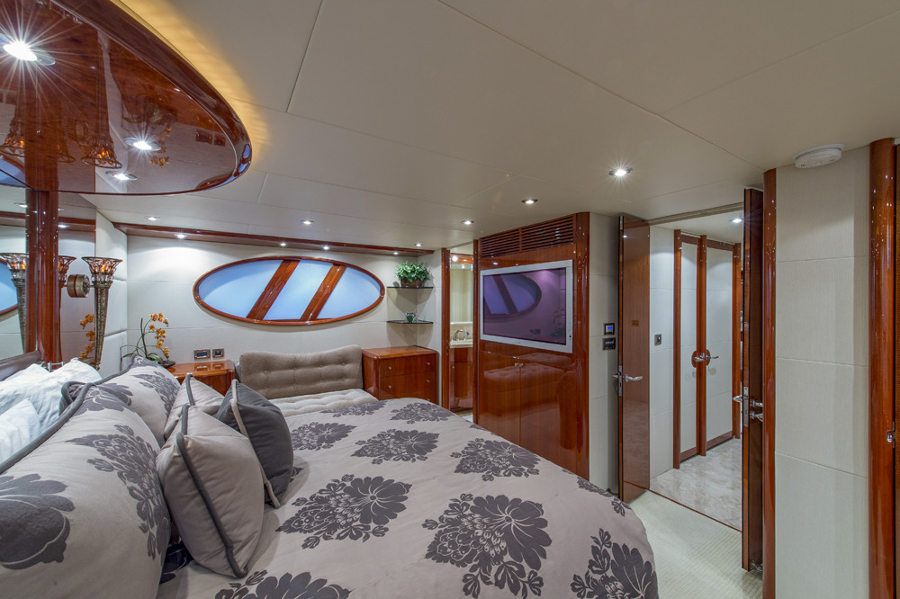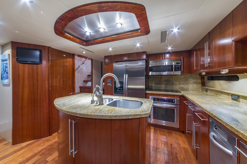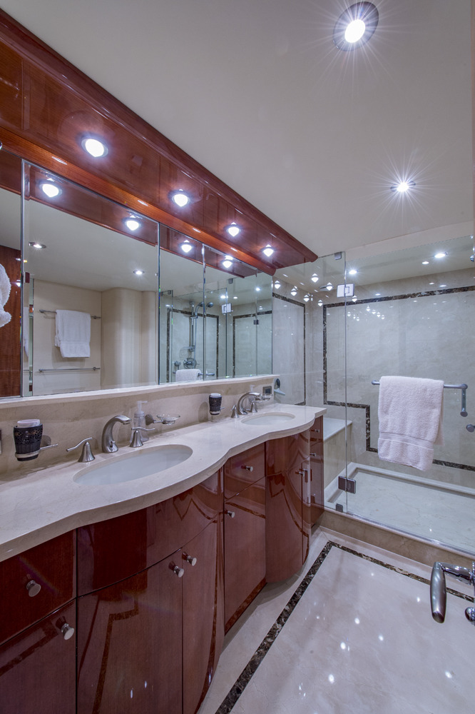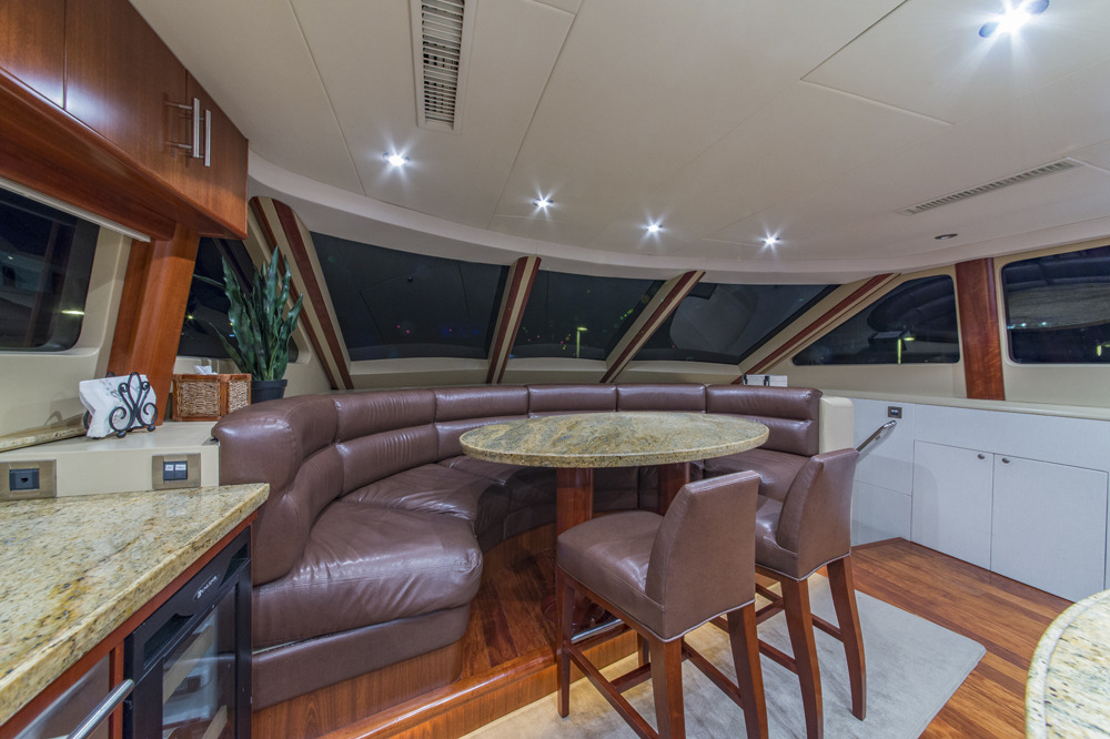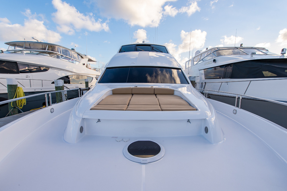 PASTAIO accommodates up to six guests with three double staterooms below. Ideal layout for 3 couples. Master with king, plus two Queen in guest cabins. Separate crew quarters forward. Master stateroom has walk around king size bed. Built in settee plus a vanity/desk with seating. Large cedar lined walk-in closet. En suite bathroom with double sink and large shower with shower bench. Two VIP staterooms with Queen size walk-around beds. Each has en suite bathroom with shower and built in shower bench. Hanging locker/cedar lined with full length mirror. Comfortable main salon with entertainment center and 43" Plasma TV. Formal dining following forward of the salon seats six. Galley forward is well equipped with stainless steel appliances, sub zero two drawer freezer (5.1 cubic feet), granite counter tops and small island. Comfortable dinette has two stools and cushioned bench. There is a 15" flat screen TV flush mounted. Day head next to galley. Main aft deck has oval shaped dinette with 3 teak chairs + cushioned sofa seating and steps leading down to the swim platform. Full walk around decks provide easy access around the main deck and leads forward to the bow where you will find a large sun pad area. Up a level the enclosed sky lounge/flybridge offers a second comfortable, air conditioned indoor lounge option with a 31" Smart TV. While continuing outside the tinted double sliding doors you will find an upper aft flybridge deck area with table and seating for up to six. The cushioned bench to starboard converts to a sun pad. There is a retractable canvas awning for partial shade. Secondary small grill located on the upper aft.
