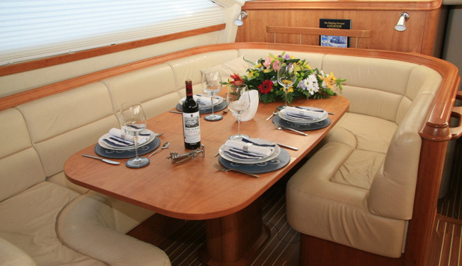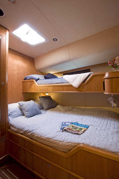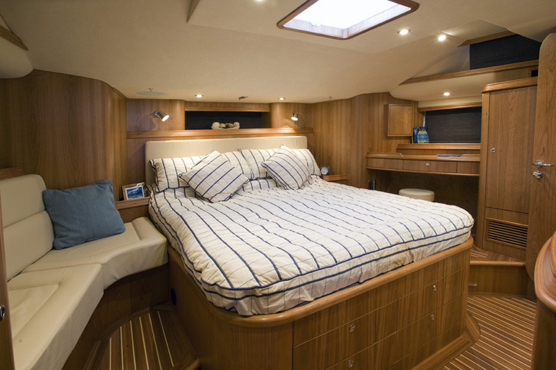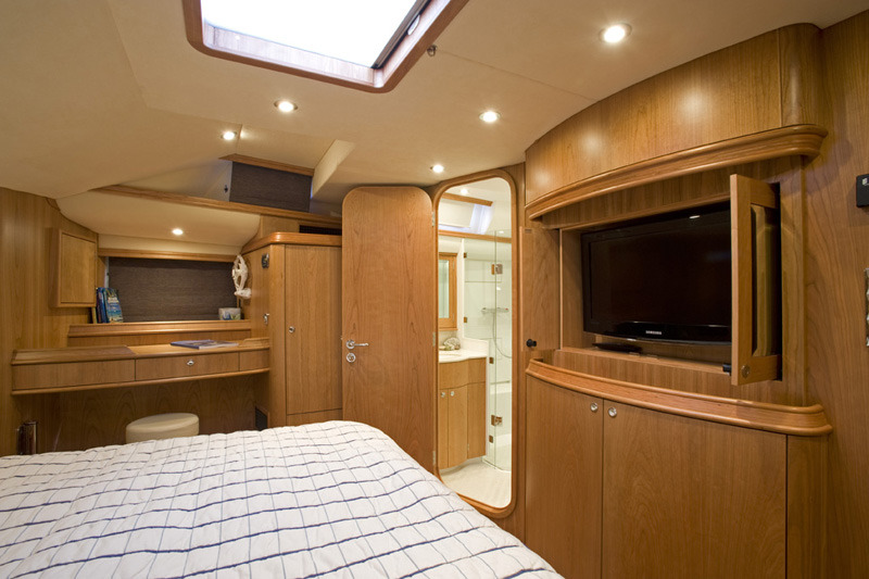 Tilly Mint sleeps 7 in 3 cabins: The large ensuite master cabin aft has more than 6’6” headroom, a king sized walk around bed, a large TV and DVD player, IPOD connection, aircon, a dressing table and stool and a bathroom including a glass shower enclosure with power shower, electric heads and beautiful cherry vanity unit Forward, the accommodation is flexible in two guest cabins. The forward cabin has a walk around queen bed, aircon and large TV and DVD and IPOD connection.The en suite bathroom has a power shower with a full glass shower enclosure, electric toilet and luxury cherry vanity unit. Note: The door to the forward double cabin can be moved aft to make the luxury bathroom available to be shared with the forward portside guest cabin. With a large lower double bed and a single Pullman bunk, the forward portside guest cabin is ideal for a couple or for children, accommodating 3 people if required. It has aircon, small TV and DVD player and an IPOD connection. The crew cabin is forward to starboard and shares the starboard head and shower with the portside guest cabin.