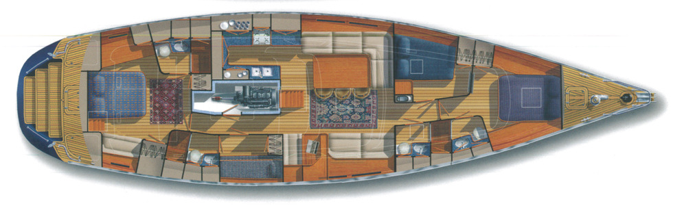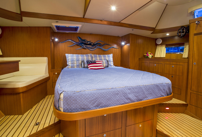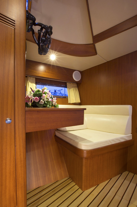 The master cabin situated aft has a centre-line King size bed, a sette and a writing table.There is a en suite shower booth and toilet. The forward guest cabin has a queen berth. This cabin has an en suite toilet and washbasin plus access to a shower stall shared with the port side cabin. The port side guest cabin has a double berth. Across the companionway, on the starboard side, this cabin has its own head with an electric toilet and washbasin, plus access to the shower stall shared with the forward guest cabin. The shower stall has a fold-down seat, teak grate and solid doors. All three guest cabins have 7 foot headroom, TVs and stereo. The main salon has 8 foot headroom and a TV. Crew quarters with en suite facilities are located aft of the main salon.