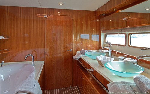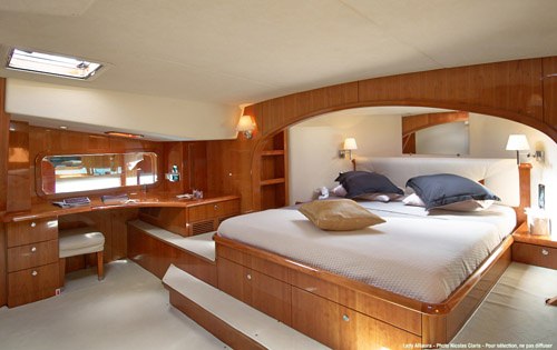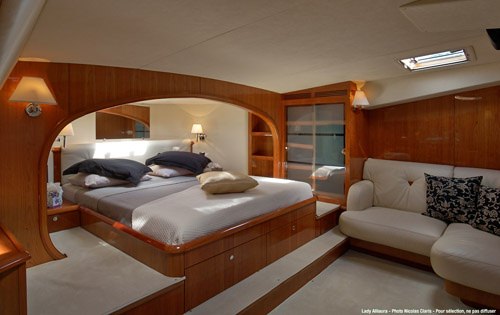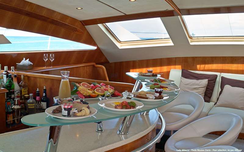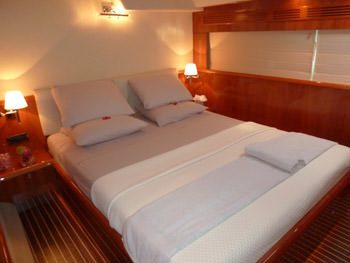 Tenders & Toys: Semi-rigid Tender with 50 HP for 8 guests 1 two-men Sea Kayak 1 wakeboard for adult (open shoes / size 42-46) 1 waterski for adult 1 waterski for kid 1 paddleboard flattable 1 buoy for 2 persons Snorkeling equipment Rendez-Vous-Diving on request Audio Visual Equipment and Deck Facilities: 2 SAMSUNG TV & DVD SAMSUNG System (Salon and Master Cabin) Radio CD MP3 in salon with 2 speakers inside, 2 at cockpit and 2 at Fly Ipod docking station CD & DVD library Parlour games 2 big "fatboy" cushions 2 swimming ladders 1 hydraulic cat-walk Communications: VHF/Cordless VHF BLU/SSB Mobile No satellite internet access on the boat. WIFI antenna onboard but only works in areas where WIFI is available / WIFI connexion on marina thanks to local hotspots If guests require WIFI permanently on board, WIFI router rental on request and at charterers expenses