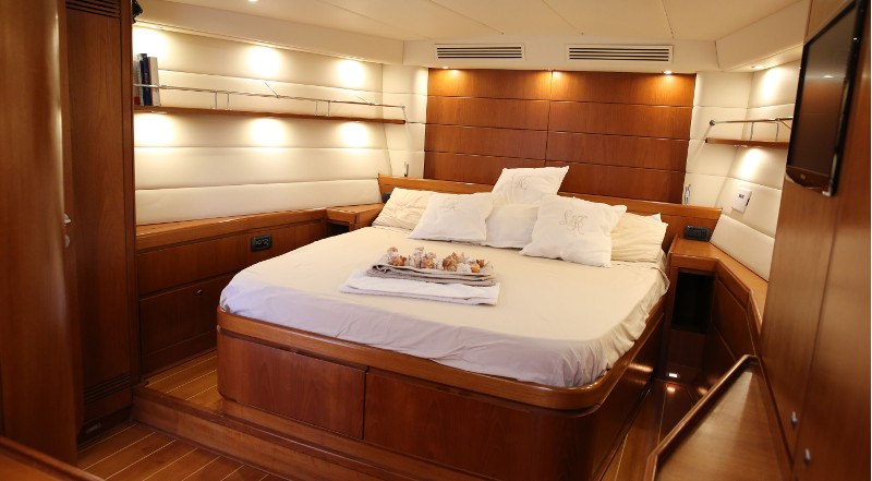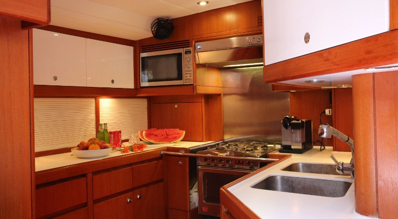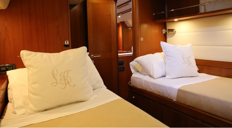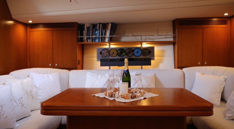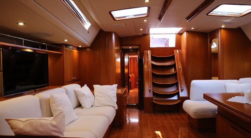 Forward there is a large en suite master cabin, while amidships, port and starboard, there are two comfortable en suite guest cabins. One of the guest cabins has two separate berths and the other holds a bunkbed. The dining table accommodates between 8 - 10 guests, plus there is a lounging area opposite. The yacht offers plenty of storage space for guests.