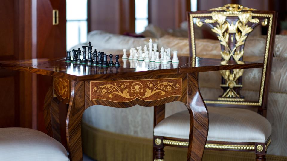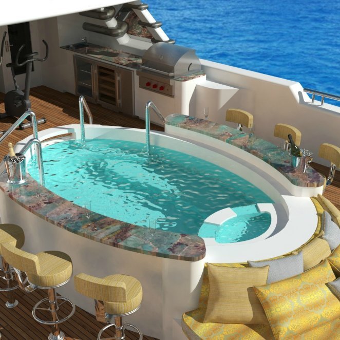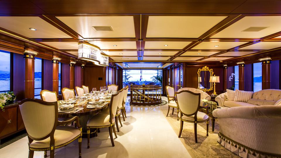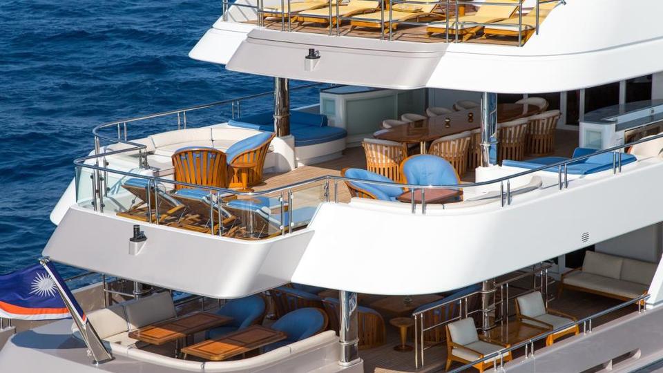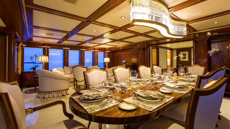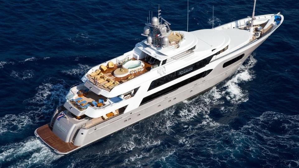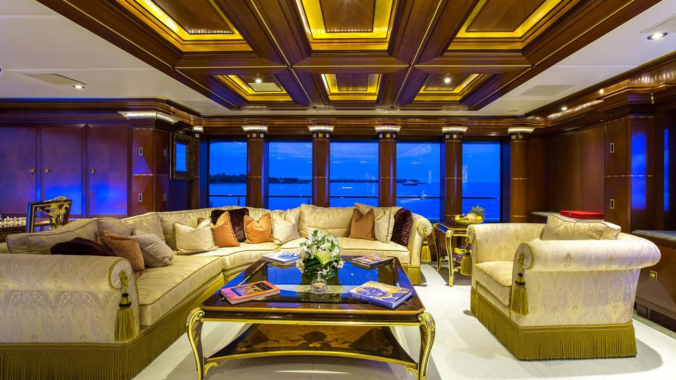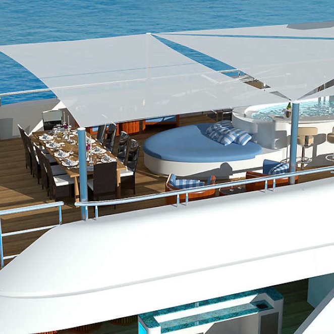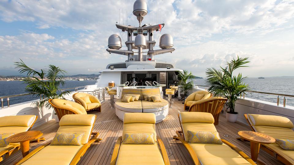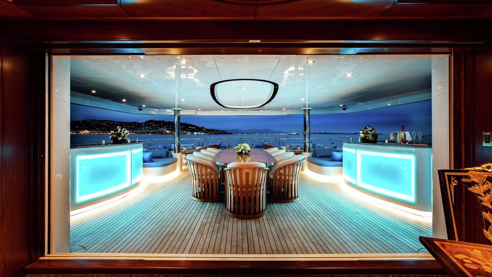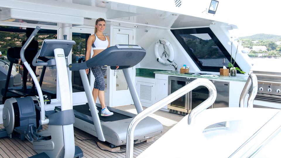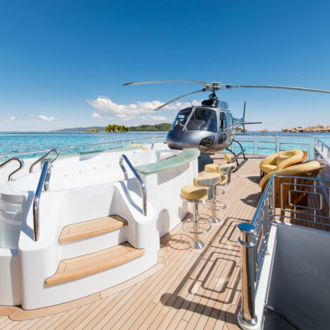 Tenders & Toys: 12.2m/40ft Van Dutch tow tender with 2 x Cummings engines 480hp each 5.2m/17ft Nautica rib tender with 115hp Yamaha engine 2 x Yamaha VX110 Waverunner (3 person) 2 x Conquest inflatable kayaks (2 person) Waterskis, (adult & children), monoski 2 x wakeboards & tows 2 x inflatable JP Australia stand up paddle boards Snorkeling gear Deep sea fishing gear Light spinning fishing rods Slide 15m high x 9.9m length Inflatable 7m/12ft extension swim platform with jetski docking ports DSLR Pro Toronto DP Edition Drone Audio Visual Equipment and Deck Facilities: VSAT, Wi-Fi, Satcom Comprehensive NEW state-of-the-art AV systems, Satellite TV with multiple receivers & HD TVs throughout Kaleidescape system (including Russian movies) 203cm/80" curve TV sky lounge iPod docking stations Apple TV & Airplay Crestron state-of-the-art concierge service throughout Steward call at the click of a button - 'Service at your fingertips' CROW'S NEST Panoramic views; large sunpad; high-top table and chairs SUN DECK On deck sauna for four; gym equipment; oversize oval waterfall Jacuzzi with bar seating on 2 sides Optional awnings/sun shades Giant outdoor movie screen: 70"x112" (132" diagonal) - 178cm x 284.5cm (335cm diagonal) Non commercial Helipad (EC135) - touch and go BBQ, wine cooler, drinks fridge for alfresco entertaining BEACH CLUB Elegant, fully appointed beach club opening out to generous swim platform including Opacmare swim platform The beach club can be converted to a disco if required with disco balls & laser lights and full sound through the yachts music system. Alternatively it can be converted to a stateroom with large comfortable inflatable bed, TV and en suite ( does not have a shower) Communications: Satcom & cellular communications facilities, VSAT, Wi-Fi internet access throughout Gym equipment: Technogym Excite Xtreme treadmill Technogym Excite Extreme crosstrainer Free weights, bench & yoga mats etc 2 x Enzo electric bikes