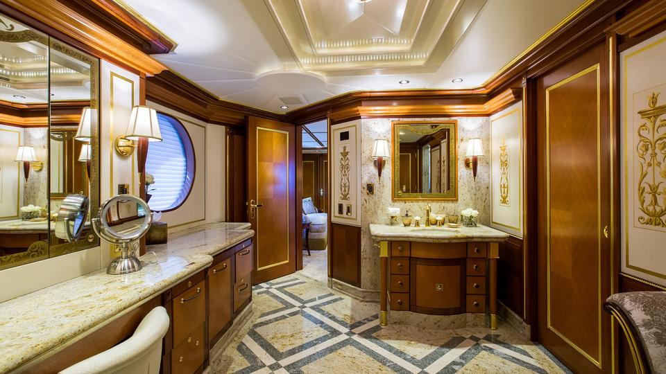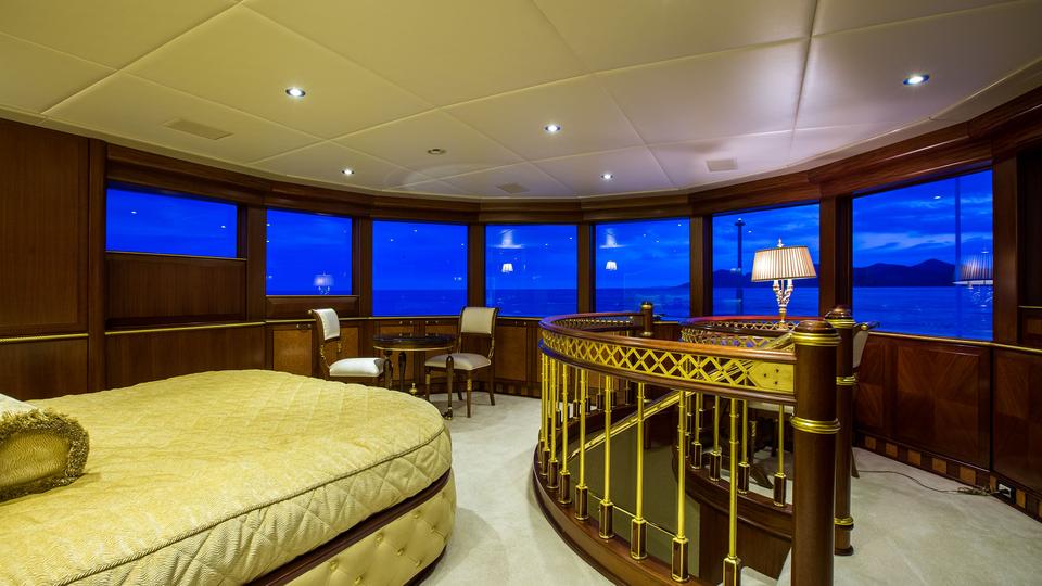 Main deck: Full beam master suite located forward. King bed with seating area and desk. Semi-circle His & Hers en suite with large central Jacuzzi tub & extra large shower. Her side with dressing area w/ 4 closets, toilet & bidet. His side with 3 closets, toilet & bidet Lower deck: 2 x double cabins (stbd side) with king bed and en suite with 2 sinks, large shower & bidet 2 x twin/double cabins (port side) with 2 x queen beds in each cabin, en suite with 2 sinks, large shower & bidet Although there are 2 queens beds, the cabins are exceptionally spacious and very comfortable Sun deck: VIP located forward with queen bed and en suite bathroom with shower. Offering stunning panoramic 180 degree views through oversize windows