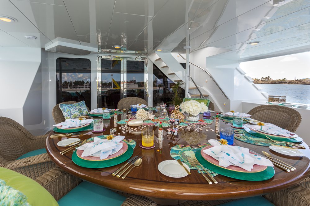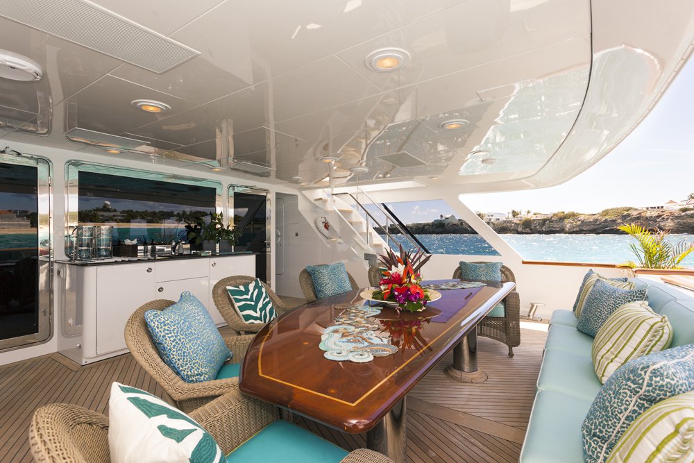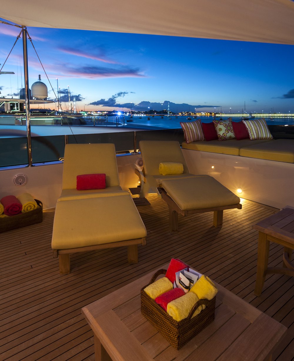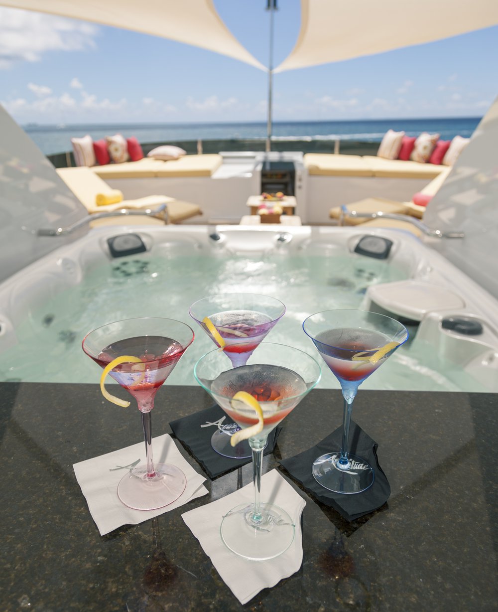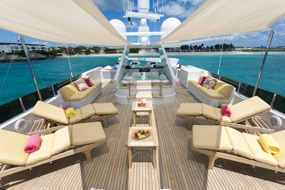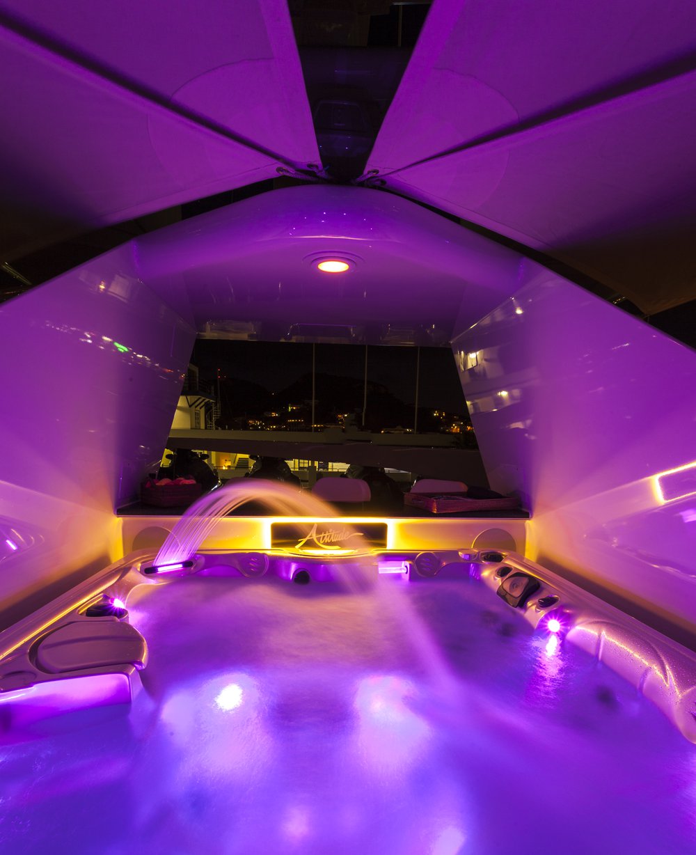 Previously named Encore, the 150 foot Mega Yacht Attitude underwent an extensive interior and exterior seven month refit in 2014. Accommodating ten guests, the Attitude has five very comfortable staterooms. A full beam master stateroom is located on the main deck, forward. It has a king bed, sofa, desk, his and her closets, vanity, wine cooler, and bathroom with jacuzzi and separate shower. Below deck, there are two additional king staterooms, each with their own desks, and bathrooms with Jacuzzi tubs. Additionally, there is a queen stateroom and a twin stateroom, each with a bathroom and shower. The Attitude offers plenty of dining and lounging opportunities. The main salon has plenty of seating in plush couches and overstuffed chairs. There is a separate dining salon for formal dining, and dining on the main aft deck for alfresco dining for up to ten. Recreational opportunities are abundant on the Attitude. The sun deck offers a Jacuzzi with a bar, and a wet bar. There are chaise lounges and a sun pad area on the sun deck as well, for sunbathing. The sky lounge offers a large entertainment center, wet bar, card table, L shaped sofa, and desk. There are many water toys available, including wave runners, paddleboards, wakeboards, kneeboards, snorkel gear, fishing gear, and a lot more. There is even a 32 foot tender rigged for fishing that can be towed behind the yacht, as long as the weather permits. The Attitude is equipped with stabilizers for both underway and zero speed stabilizers for the comfort of her guests. Please contact us for more information on the Attitude. Key reasons to charter ATTITUDE • Fun sun deck with comfortable lounging choices, optional awnings, fantastic bar area, Jacuzzi with colored “night lighting” & 2 disco balls • Equipped with the latest and fastest technology available at sea with 8 WiFi access ports • Dining options – formal dining room + 2 alfresco options • Spacious master suite with 2 person granite shower and separate jacuzzi tub en suite • Delightful and uplifting Dee Robinson interior accented with artwork and accessories from designers Jay Strongwater, L’object, Michael Aram, Mackenzie Childs and Global Views • Refrigerator in each cabin • 9.75m (32ft) Intrepid tow tender rigged for fishing • Large array of toys including 4 jetskis! • Exceptional Beach BBQ and party setup • Crew prides themselves on anticipating their guests’ every need!