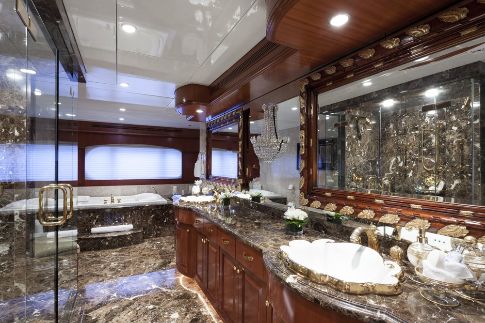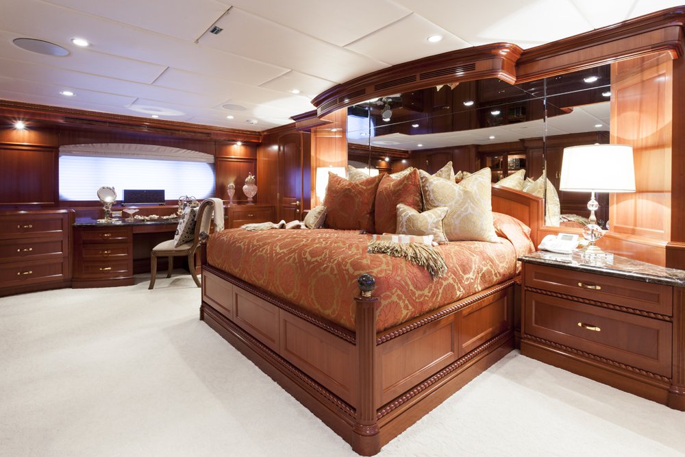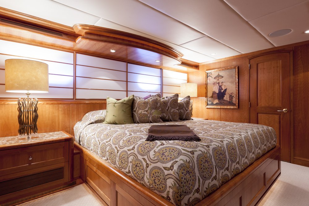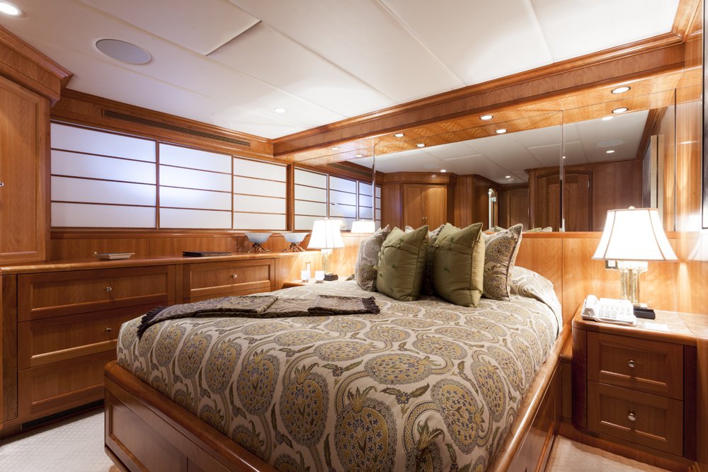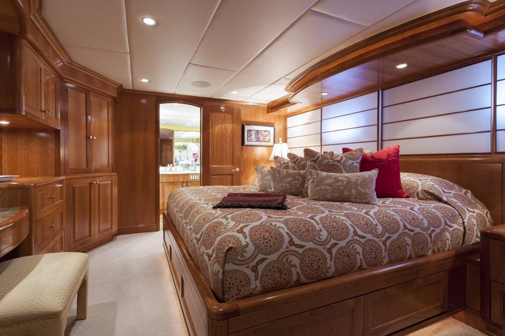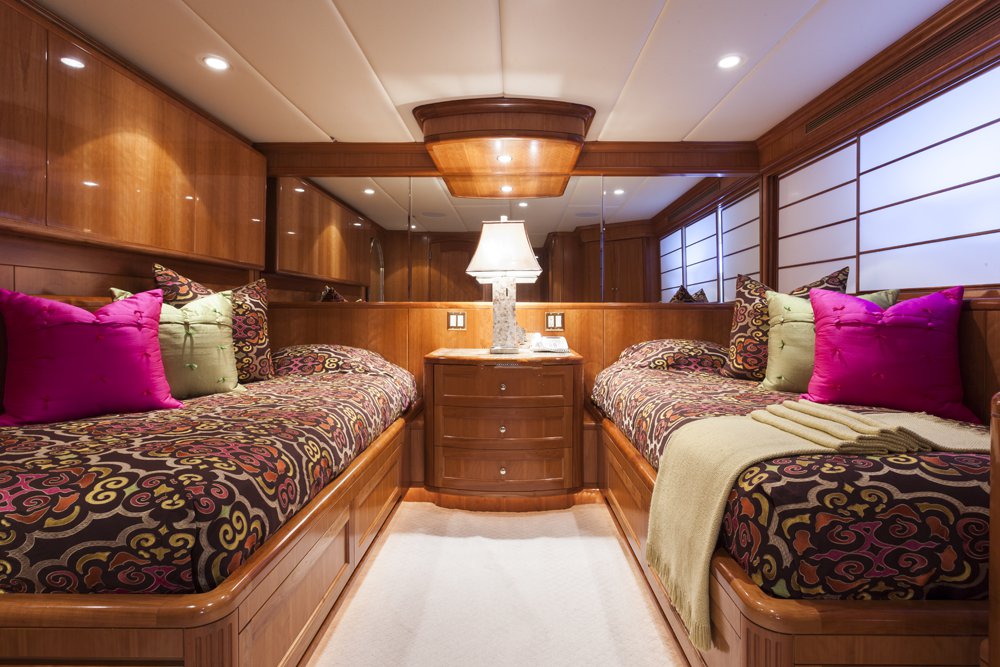 Main Deck: Full beam master cabin with king bed with with ladies' vanity and wine cooler at entrance, sitting area (stbd) and desk (port). His & her closets and bathroom en suite with jacuzzi and separate shower. Lower Deck: 2 x double guest cabin with king bed and desk. Bathroom en suite with jacuzzi. 1 x double cabin with queen bed and shower room en suite. 1 x twin cabin with desk and shower room en suite. Each cabin equipped with a refrigerator.