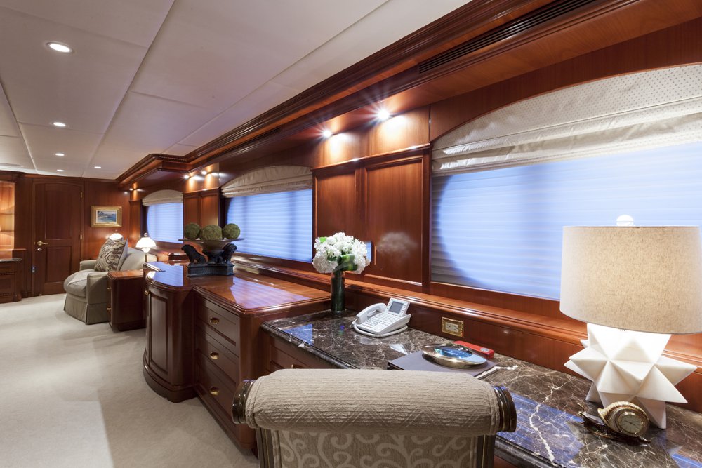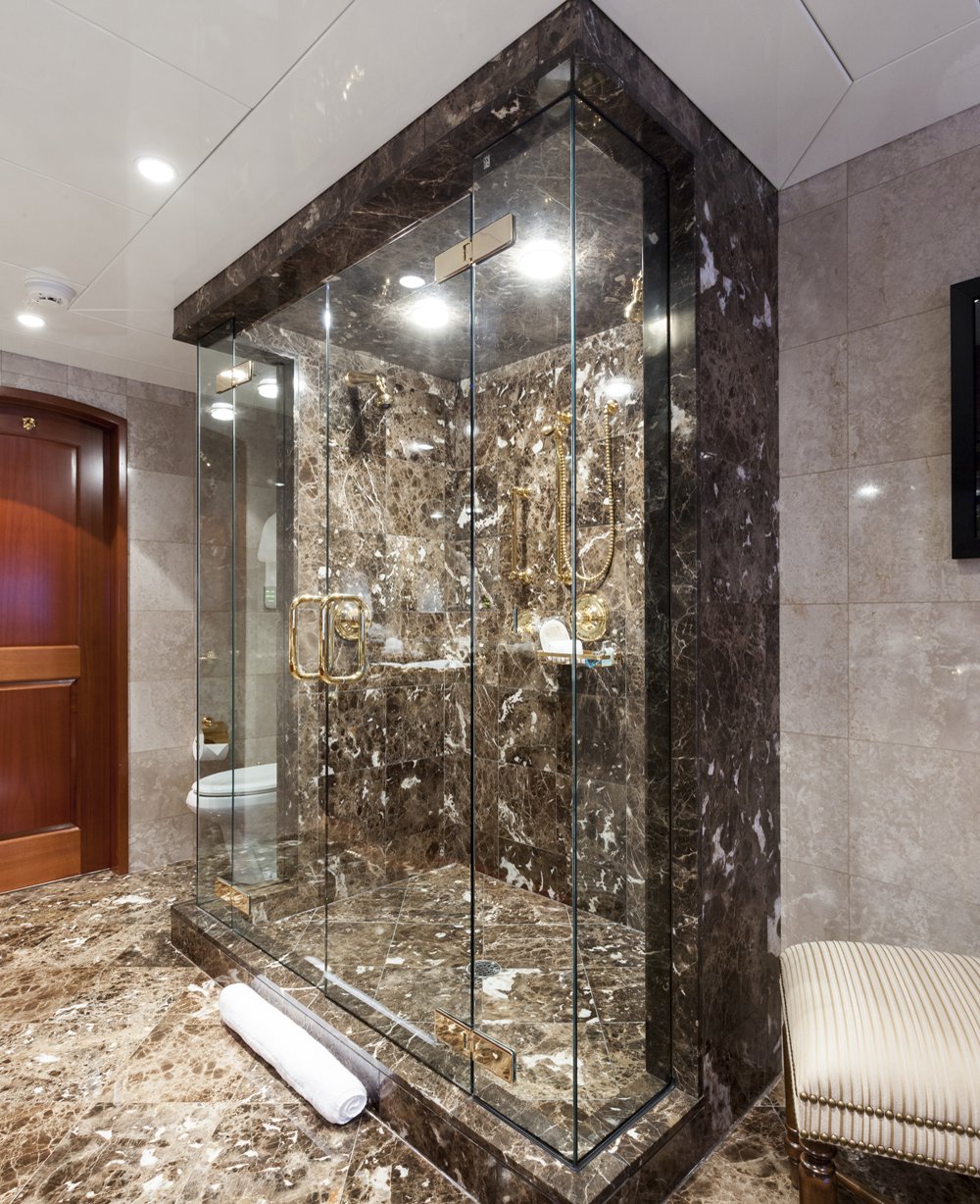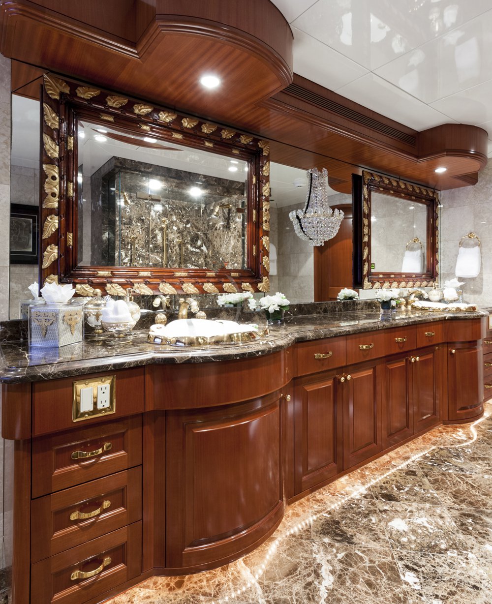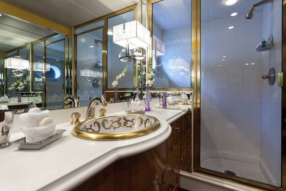 Main Deck: Full beam master cabin with king bed with with ladies' vanity and wine cooler at entrance, sitting area (stbd) and desk (port). His & her closets and bathroom en suite with jacuzzi and separate shower. Lower Deck: 2 x double guest cabin with king bed and desk. Bathroom en suite with jacuzzi. 1 x double cabin with queen bed and shower room en suite. 1 x twin cabin with desk and shower room en suite. Each cabin equipped with a refrigerator.
